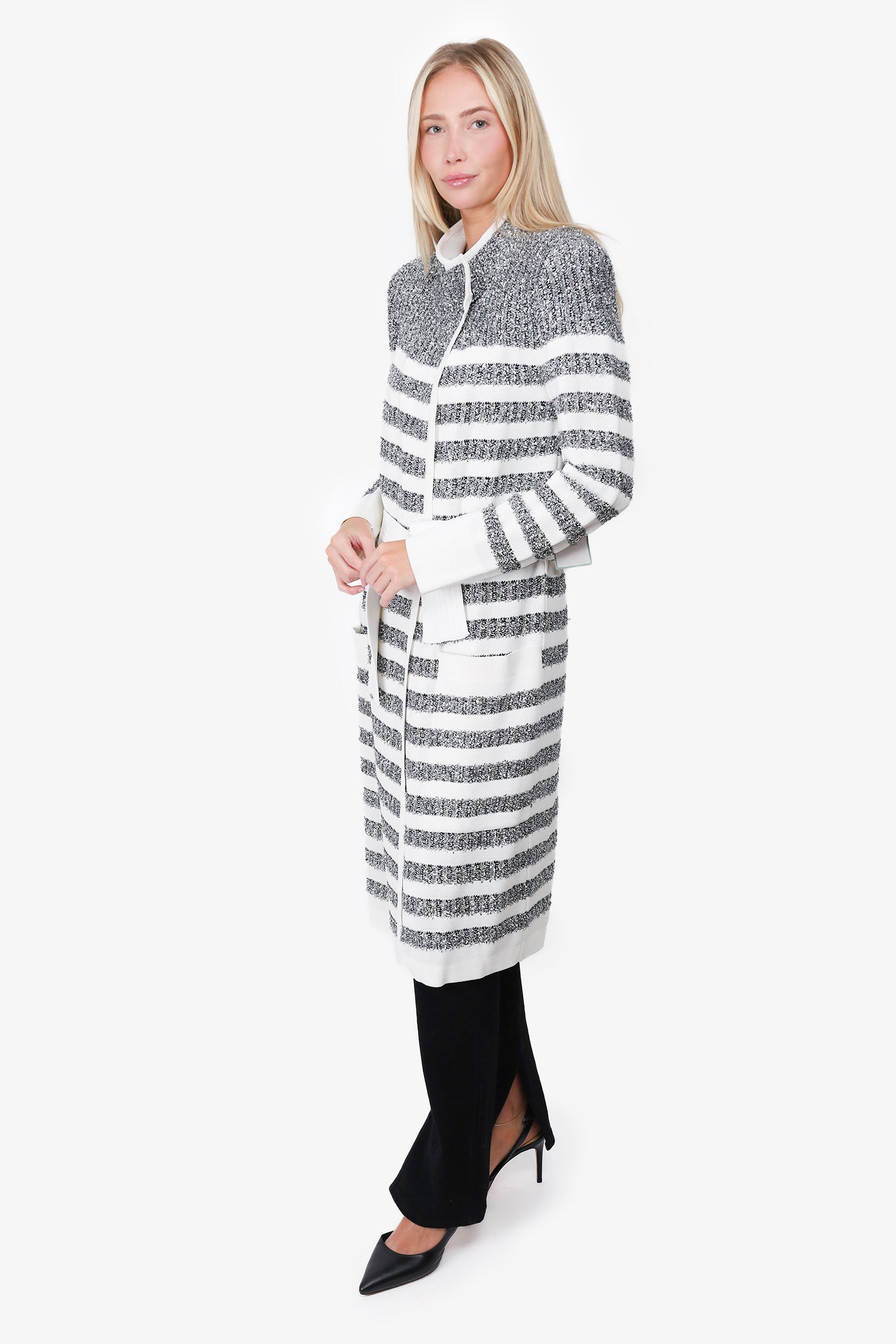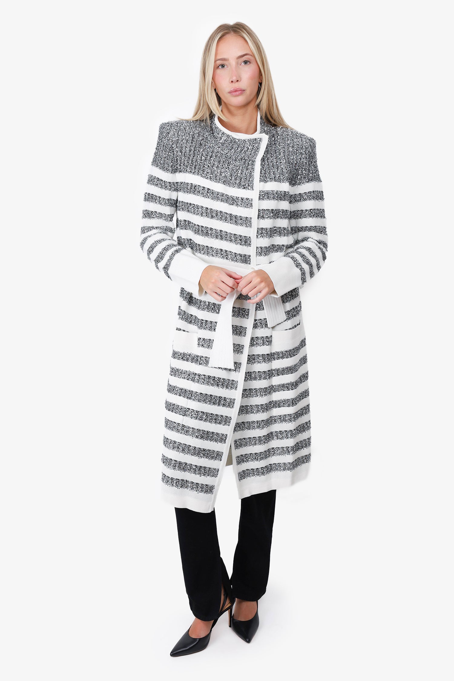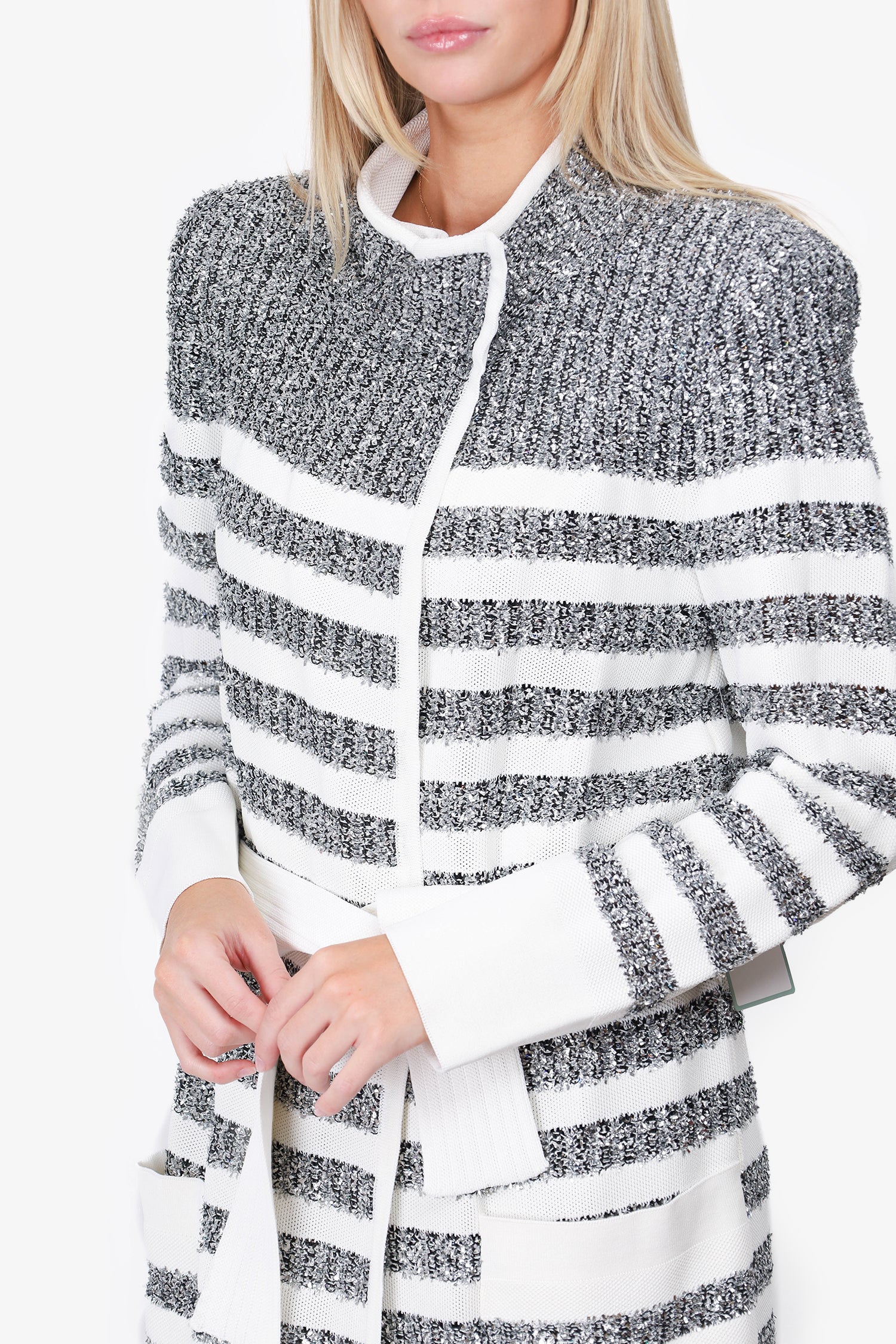Refresh availabilityBalmain Silver/White Metallic Striped Long Cardigan Size 40. Internal shoulder pads. Front button and wrap tie closure. Two front slip pockets. Unlined. Tonal stitching.