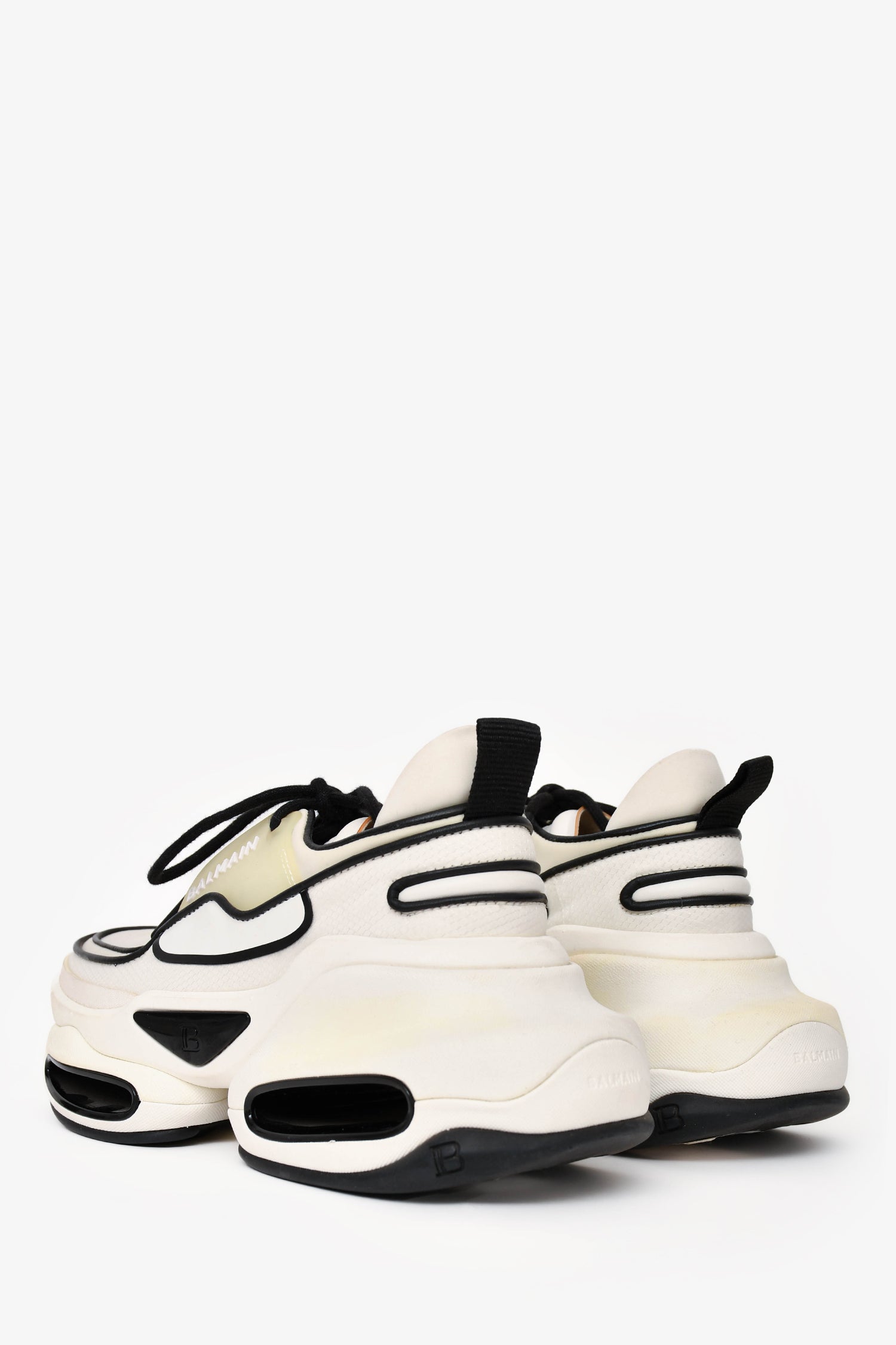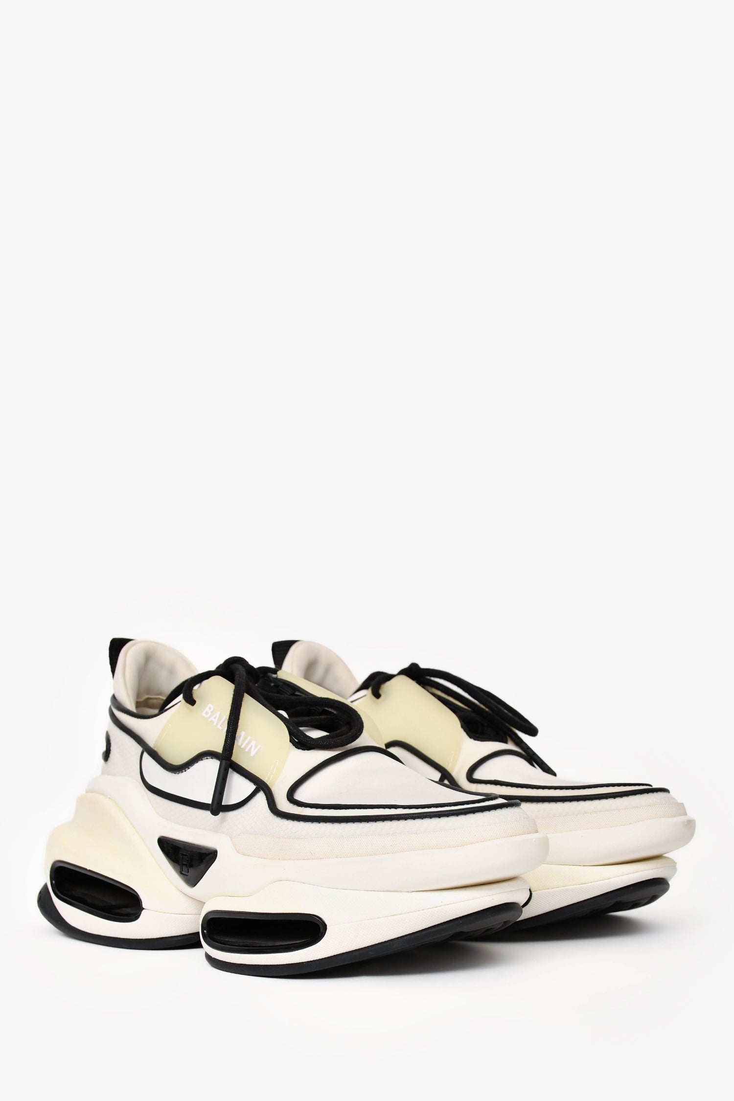 Refresh availabilityBalmain White/Black B-Bold Sneakers. Lace-up closure. Crafted from a mix of smooth leather and technical fabric. Dual-sole construction with bold cutouts. Pull tabs at the heel. Tonal stitching.