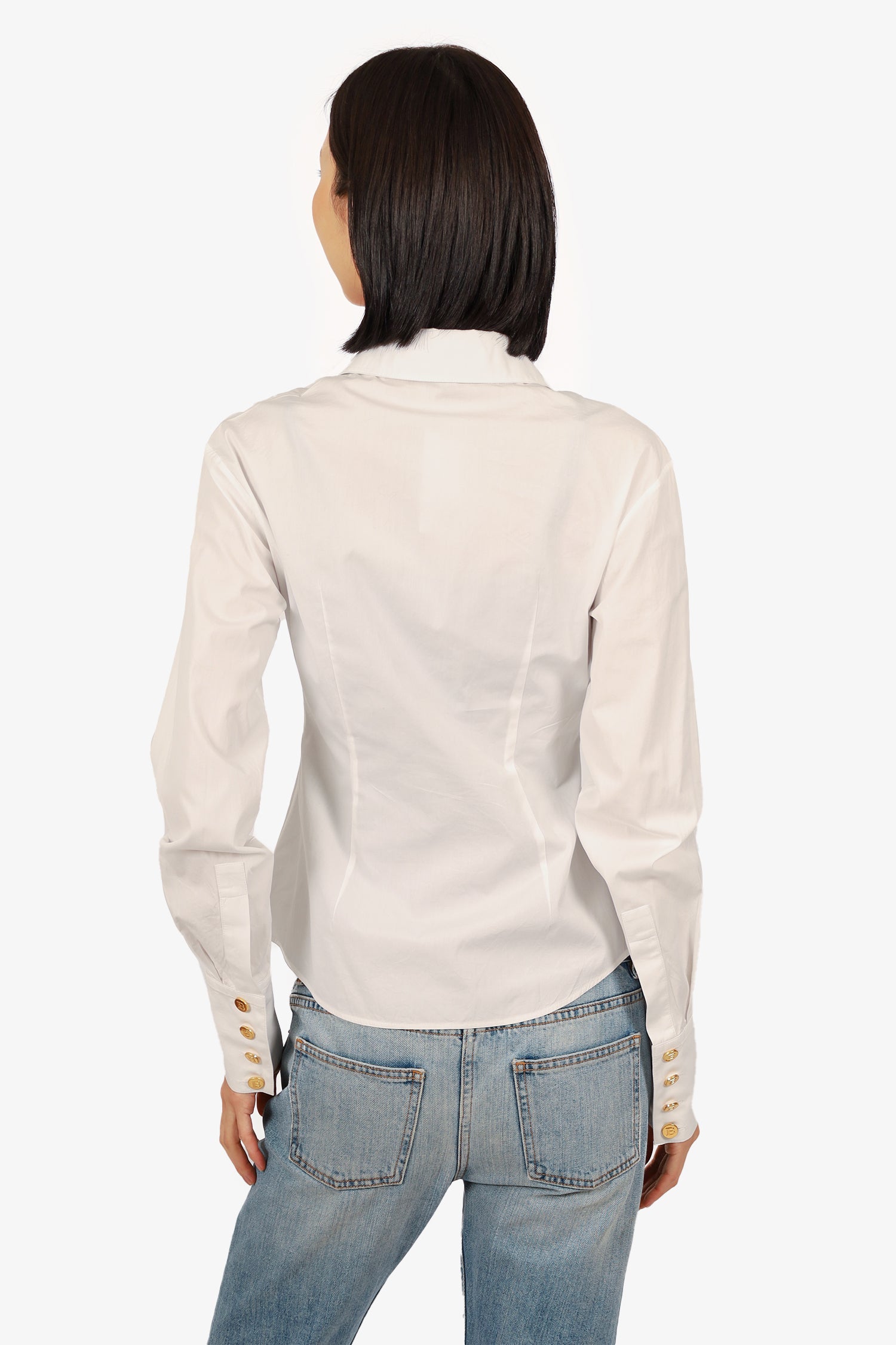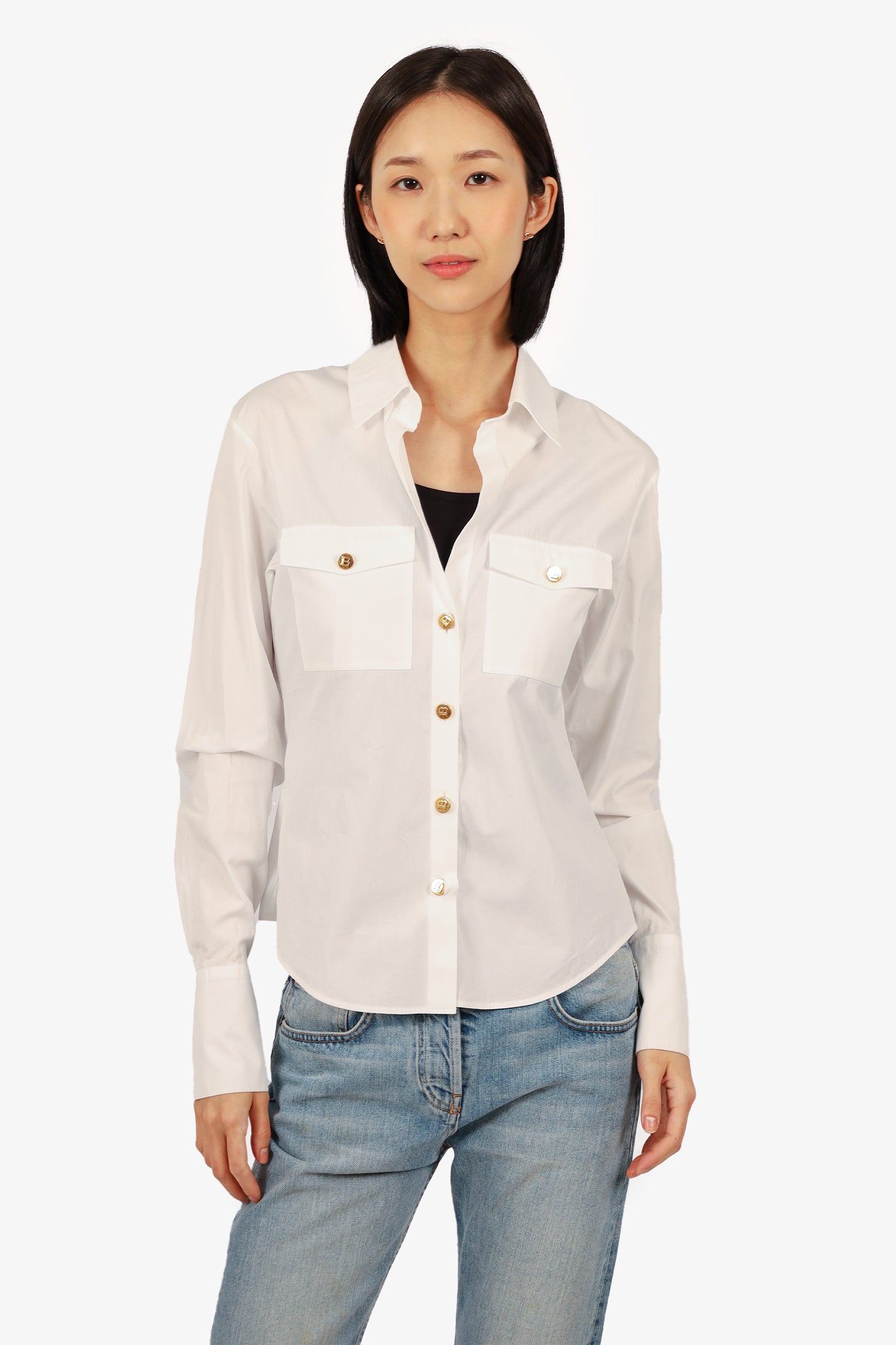Refresh availabilityBalmain White Gold Button Front Pocket Shirt. Front button closure. Front pockets with button closure. Gold-tone hardware. Tonal stitching.