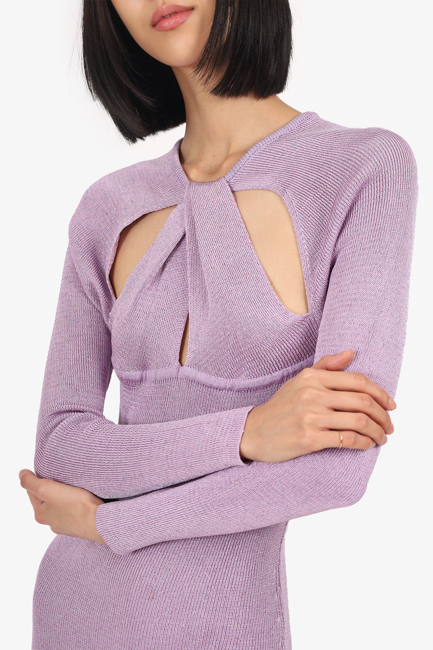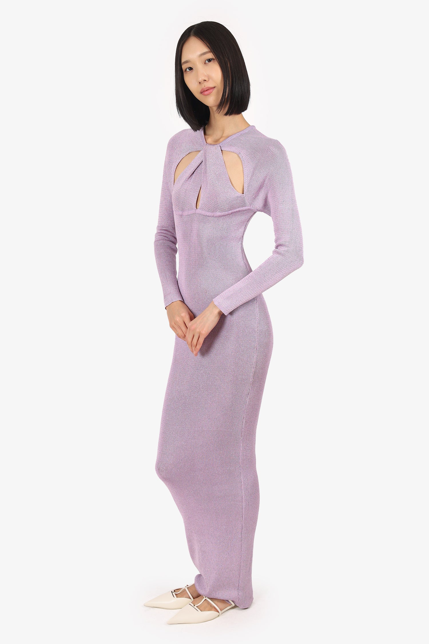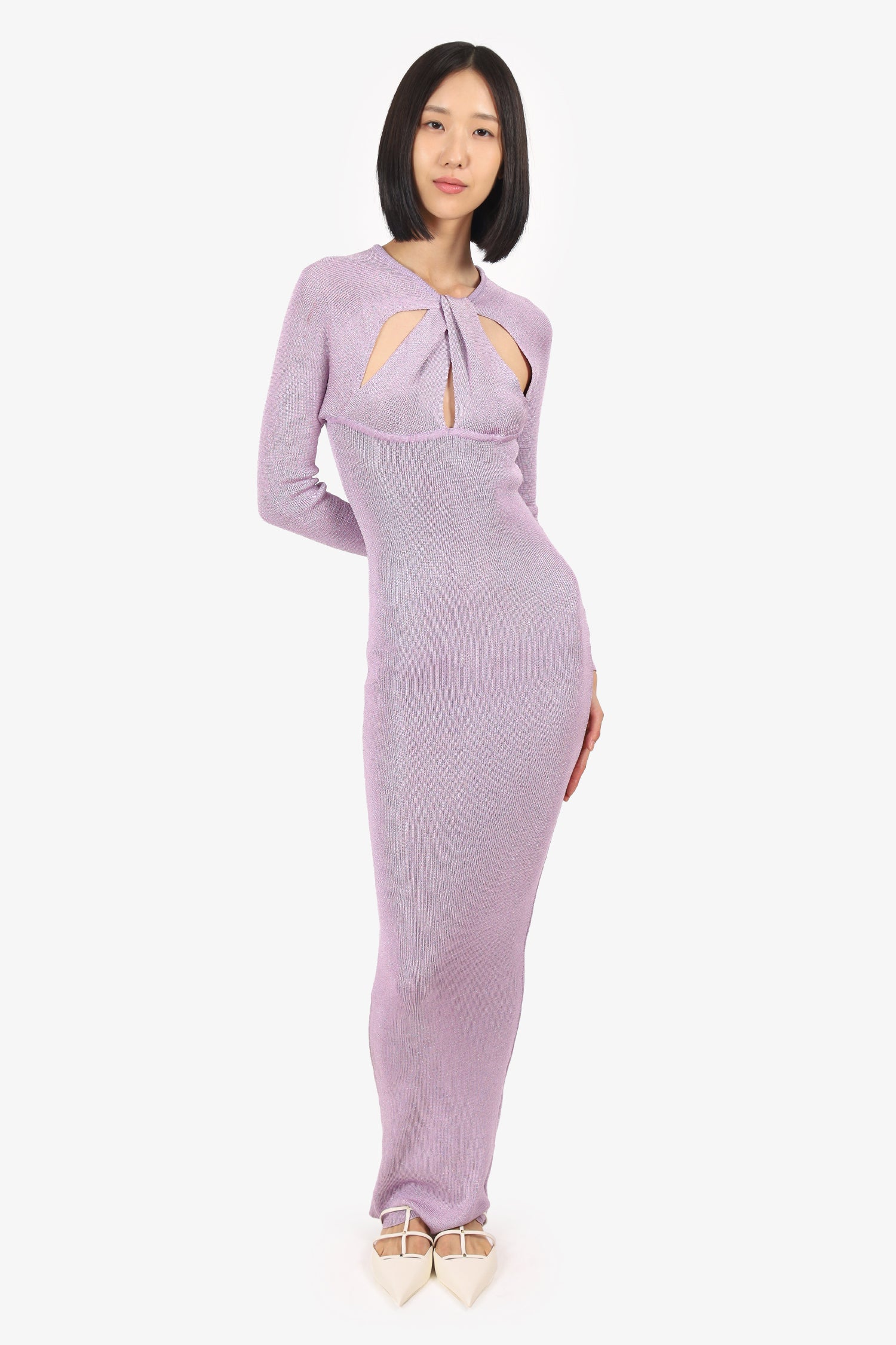 Refresh availabilityBaobab Lilac Knit Metallic Long Sleeve Cristal Maxi Dress. Pull-on. Round-neckline. Cut-outs at front and rear. Unlined. Tonal stitching.