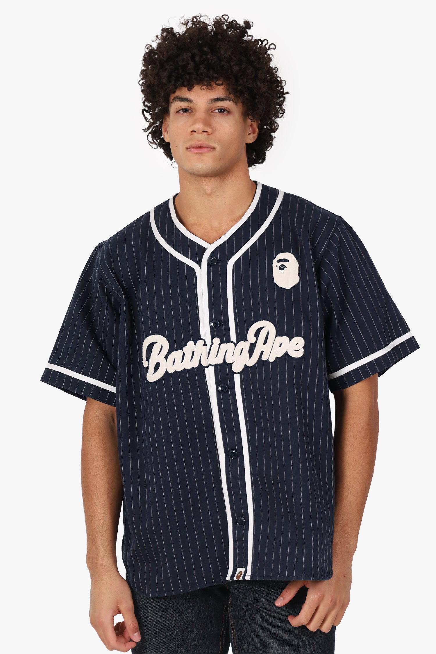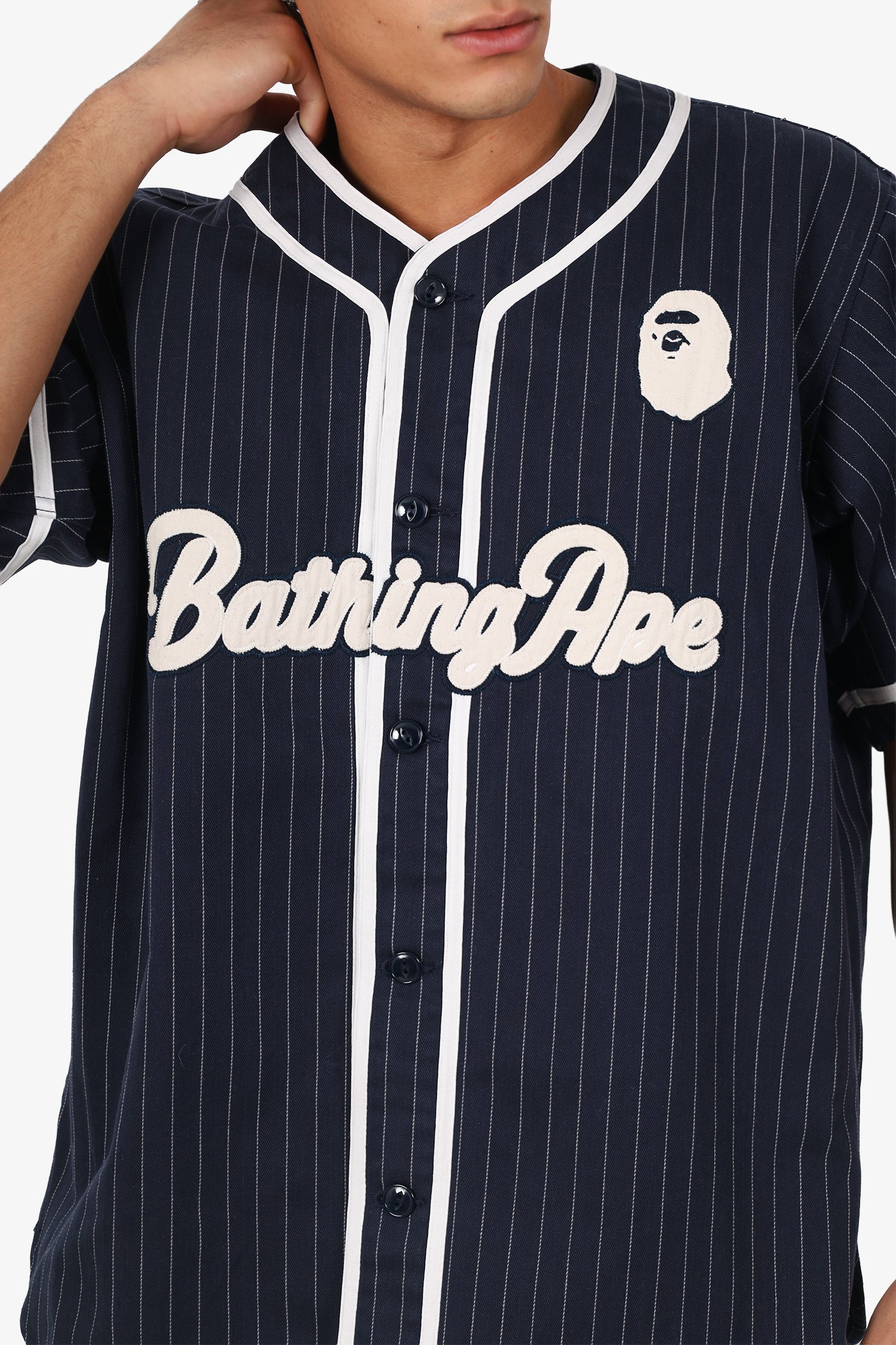 Refresh availabilityBAPE Navy Striped Baseball Shirt. Pull-on. Round neckline. Front button-up closure. Contrast and tonal stitching.