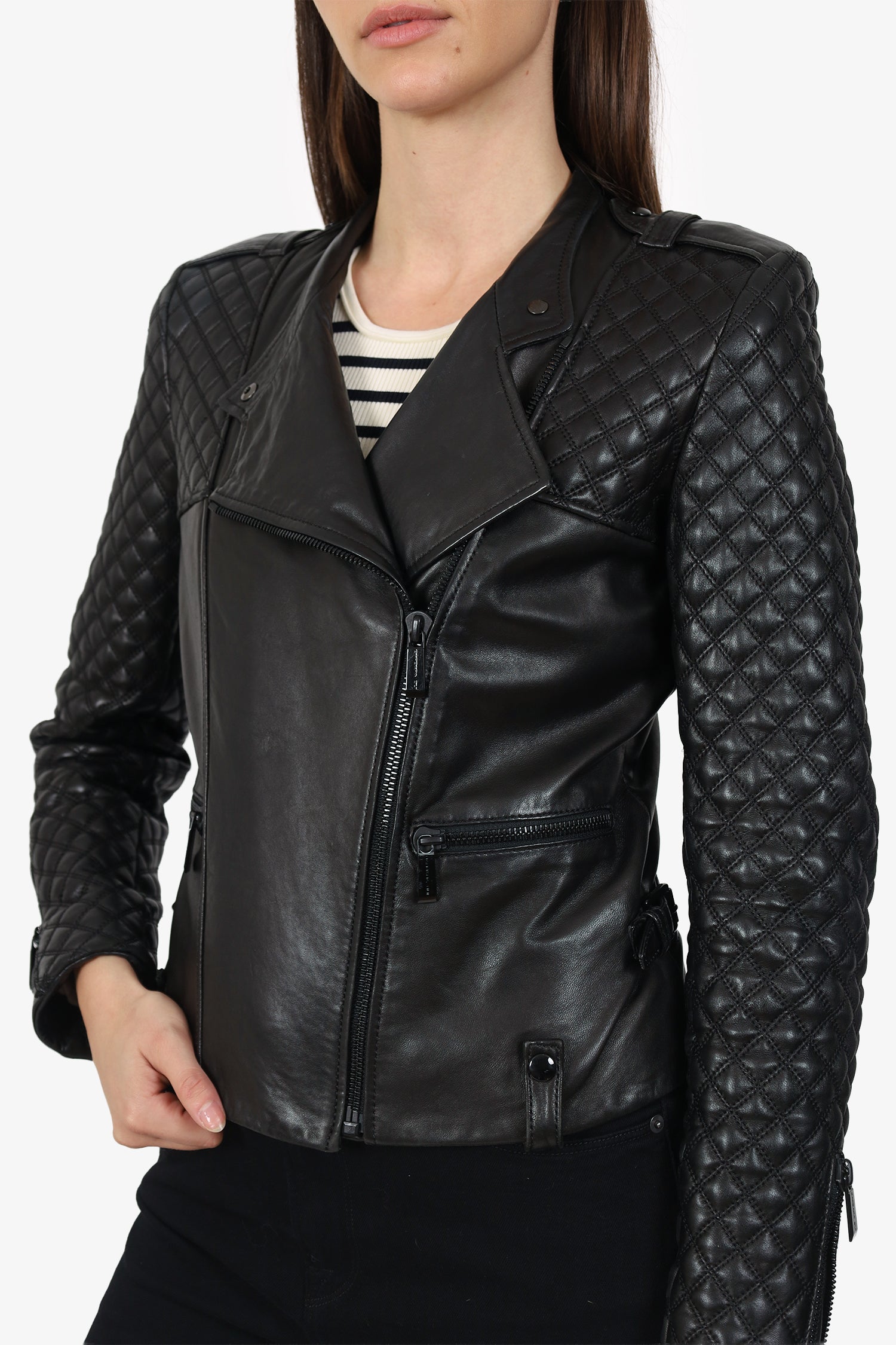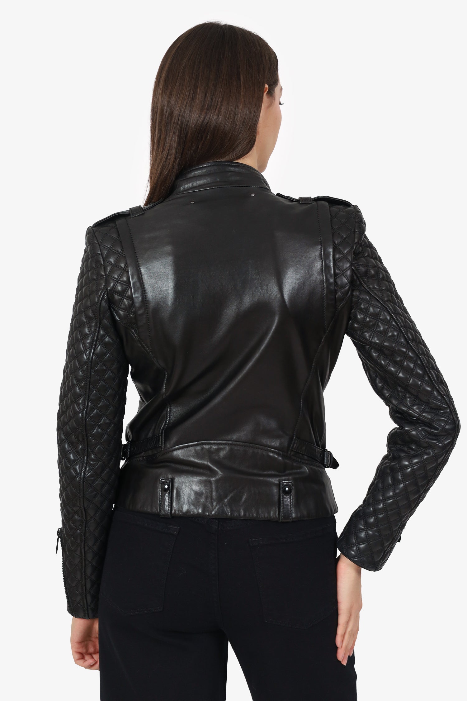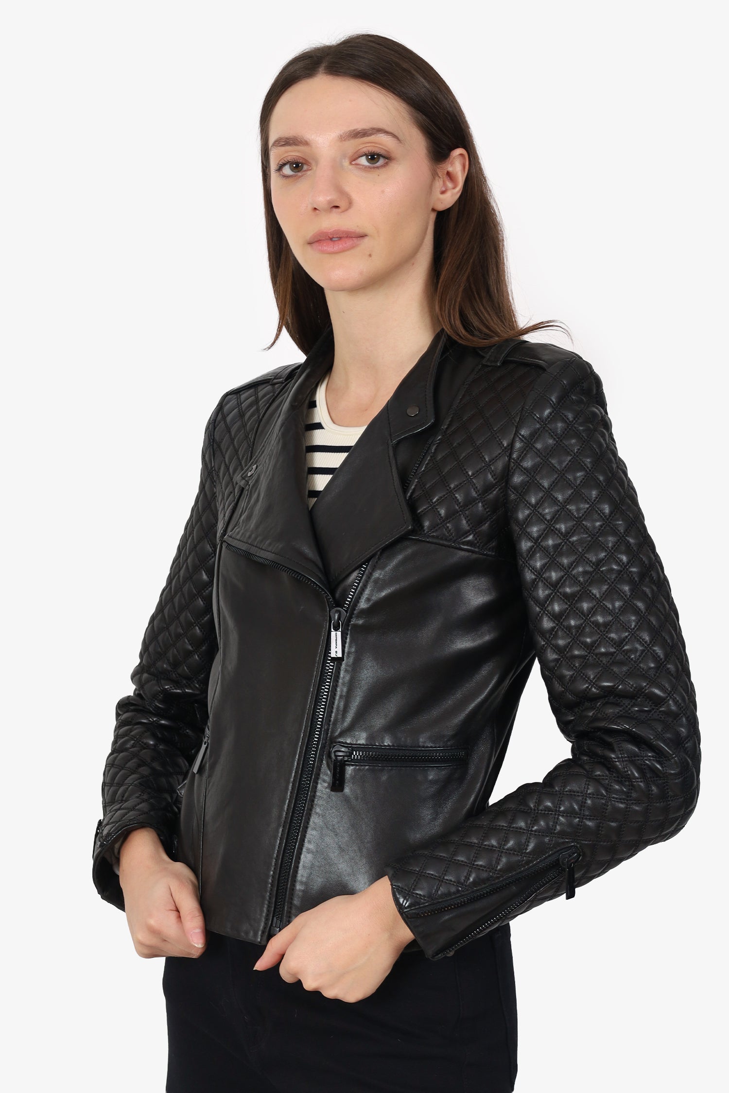 Refresh availabilityBarbara Bui Black Leather Biker Jacket. Pull-on. Collared neckline. Front zip with snap-button-up closure. Snap buttons to shoulders and waistline. Padding to shoulders. Sleeve cuffs with zip-up closure. Adjustable rear pull-through buckle closure. 2 exterior side zip pockets. Lined interior. Gunmetal-tone hardware. Tonal stitching.