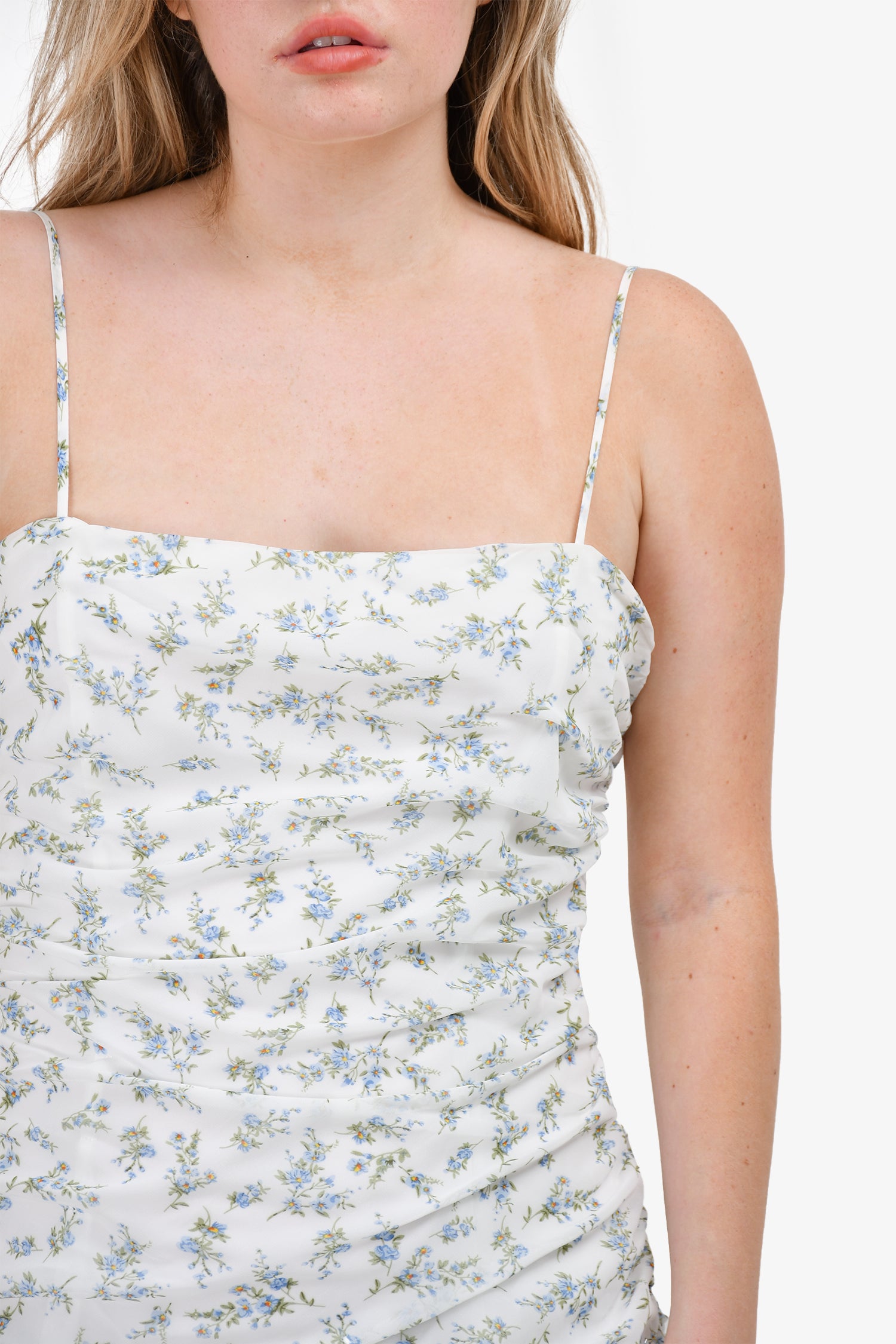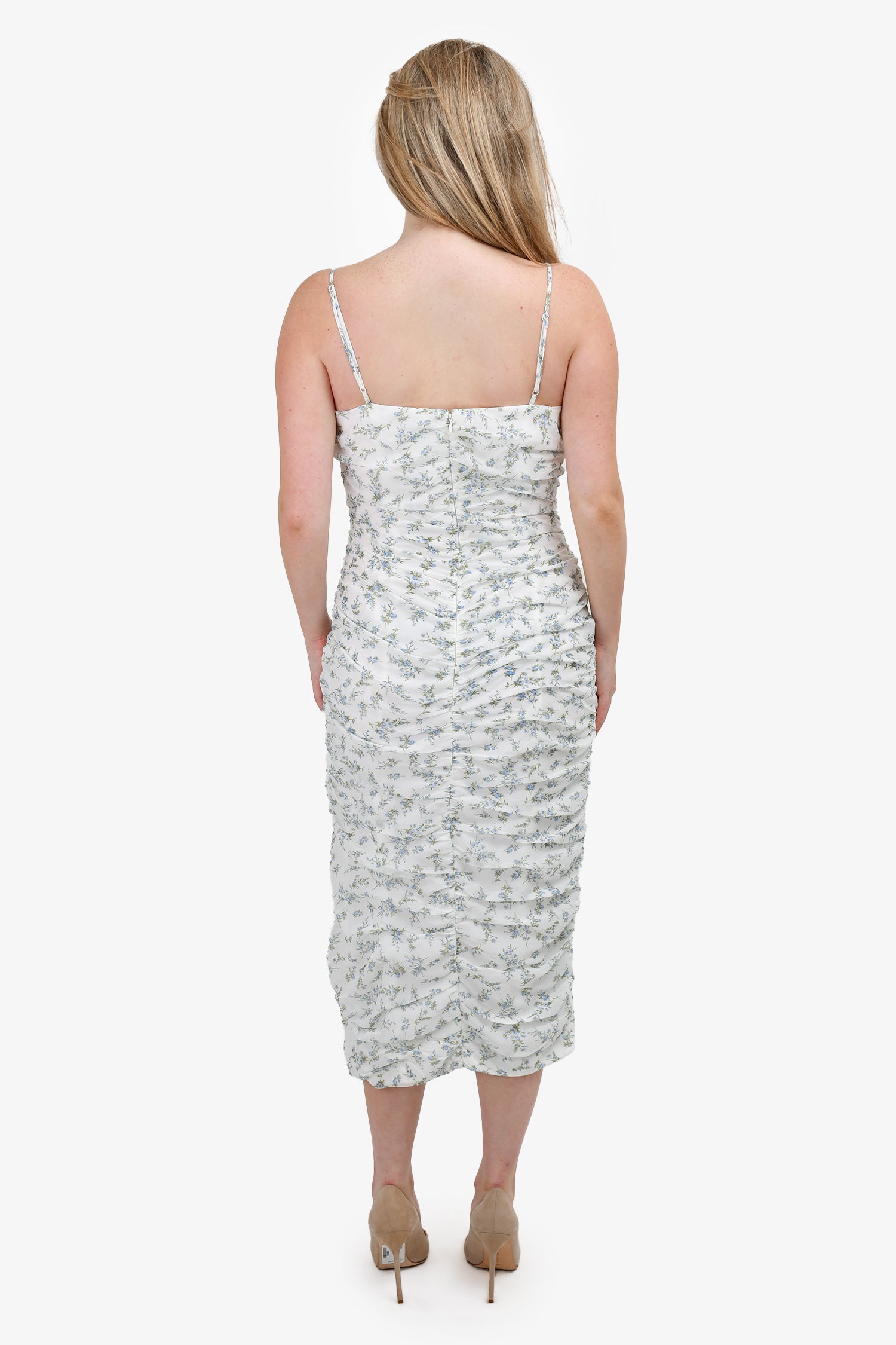 Refresh availabilityBardot White/Blue Floral Sleeveless Ruched Dress. Adjustable straps. Back zipper closure with hook. Midi length. Lined. Tonal stitching.
