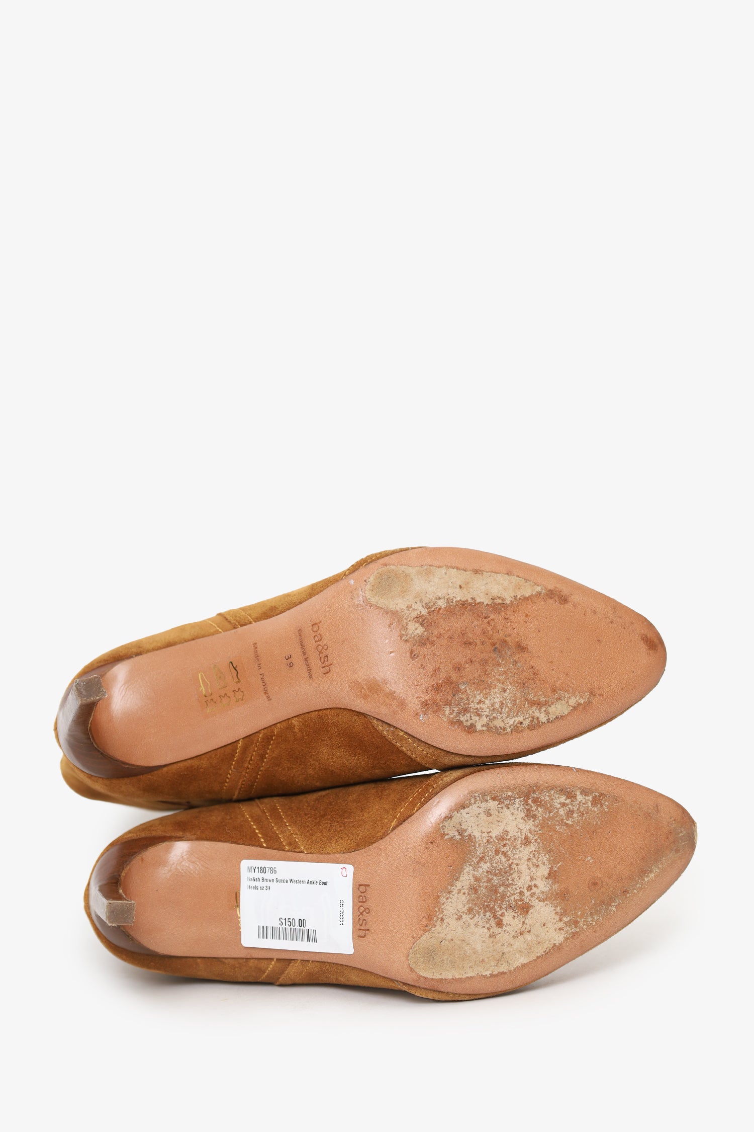 Refresh availabilityBa&sh Brown Suede Western Ankle Boot Heels. Pull-on. Pointed toe. Side pull tabs. Contrast and tonal stitching.