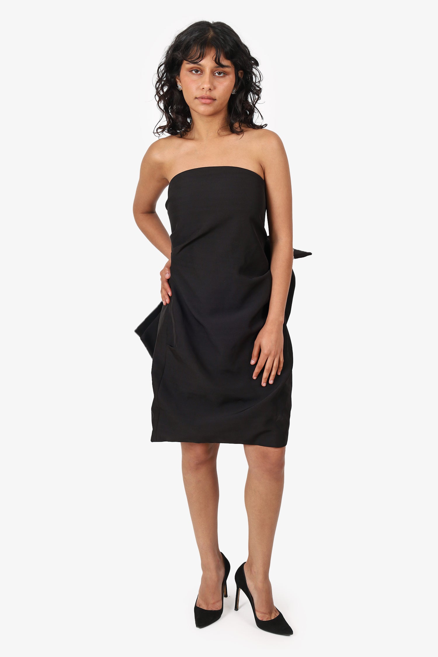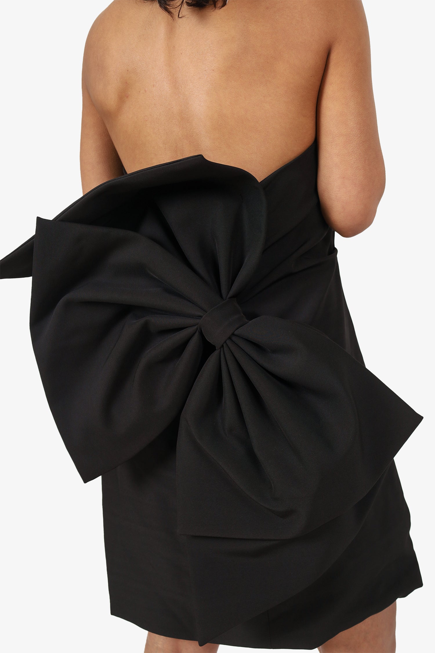 Refresh availabilityBianca and Bridgett Black Strapless Bow 'Maple' Mini Dress. Slip-on. Side zip and hook closure. Grip band to interior top hem. Lined interior. Tonal stitching.