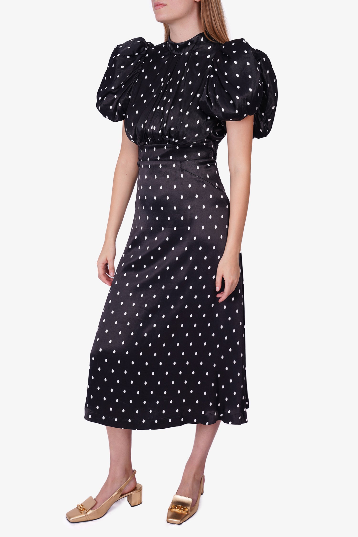 Birger Christensen Black Polka Dot Open Back Puff Sleeve Maxi Dress. Smocking and tie-up at the back. Lined. Tonal stitching.