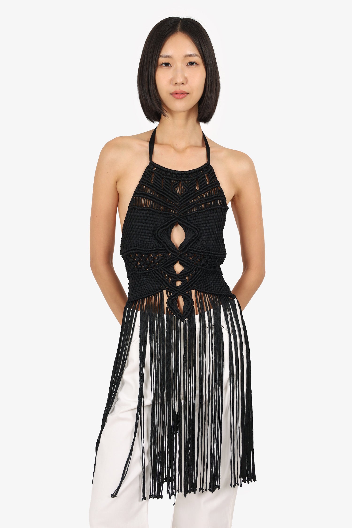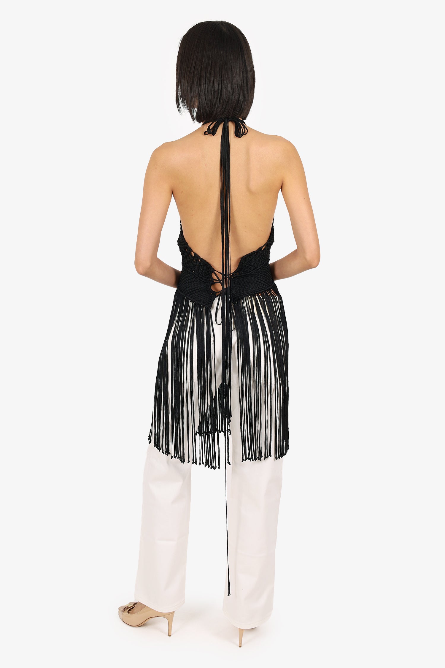 Refresh availabilityBlack Knit Fringe Halter Neck Top. Pull-on. Halter-neckline with rear tie-up closure. Rear tie-up closure. Tonal stitching.