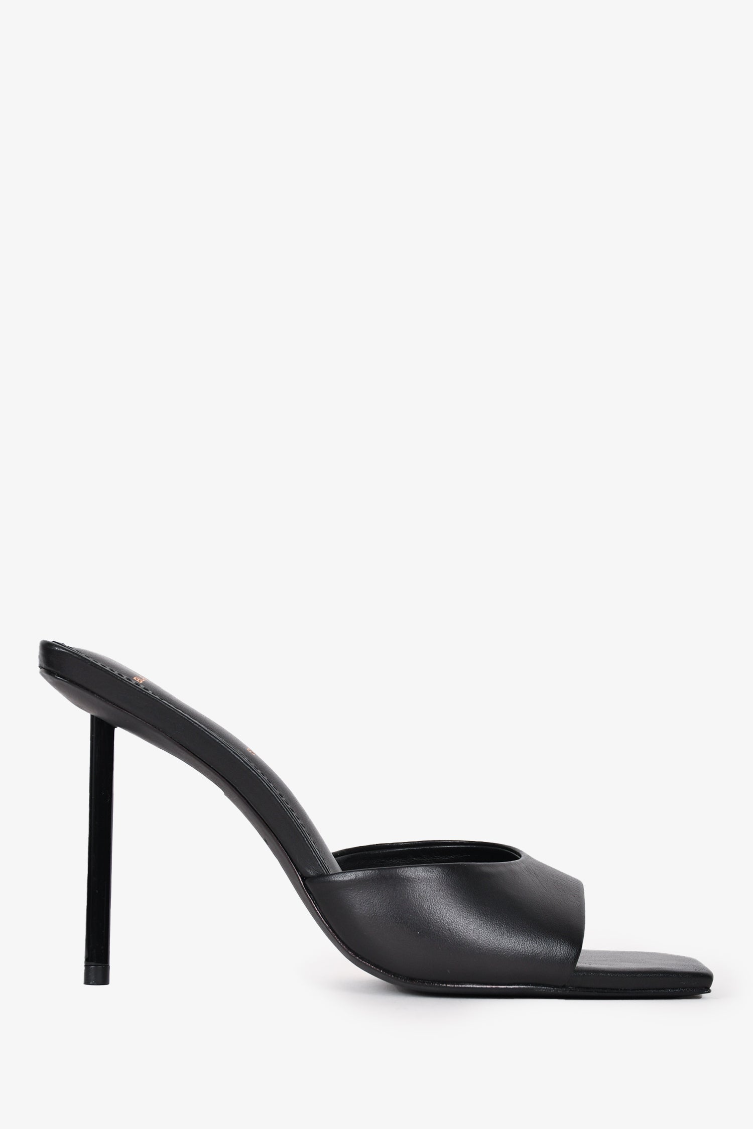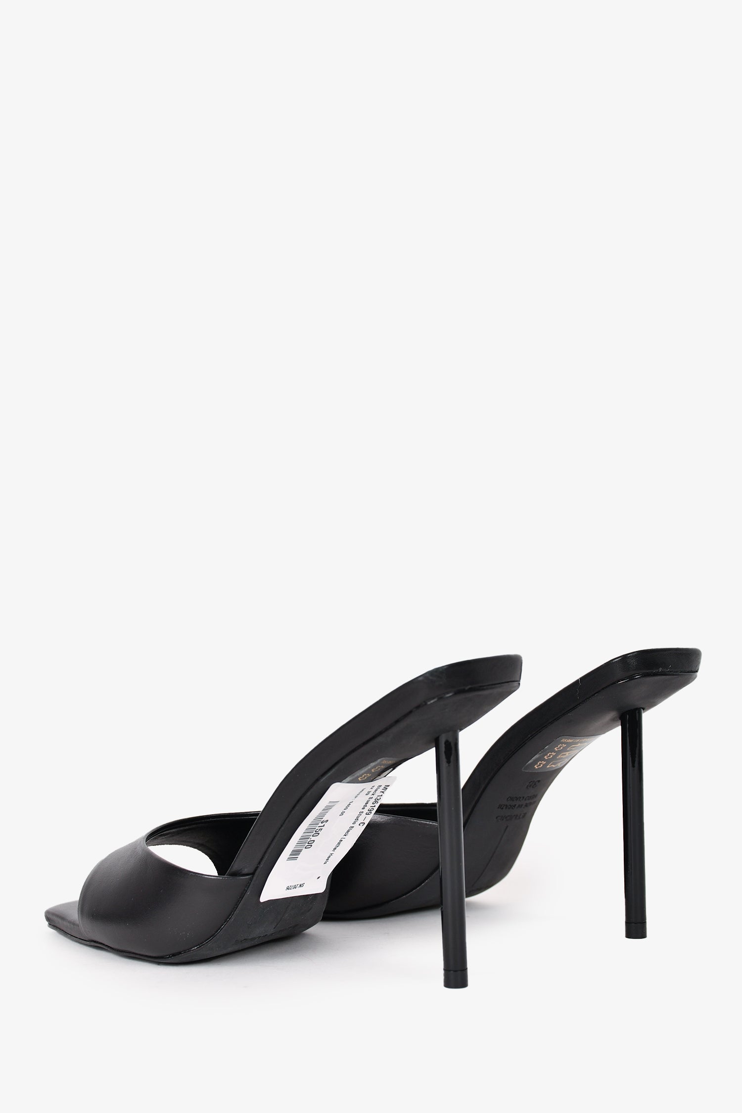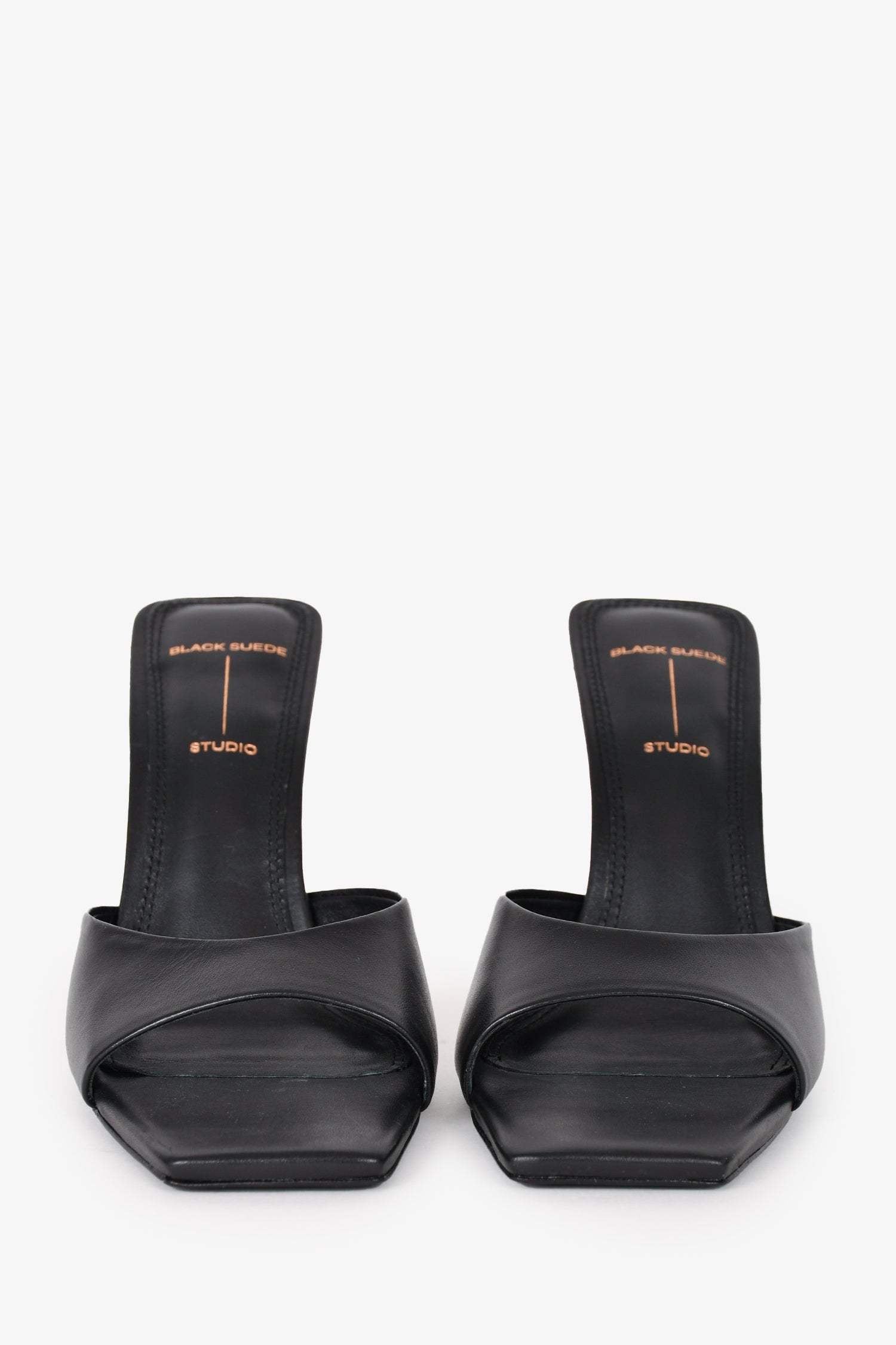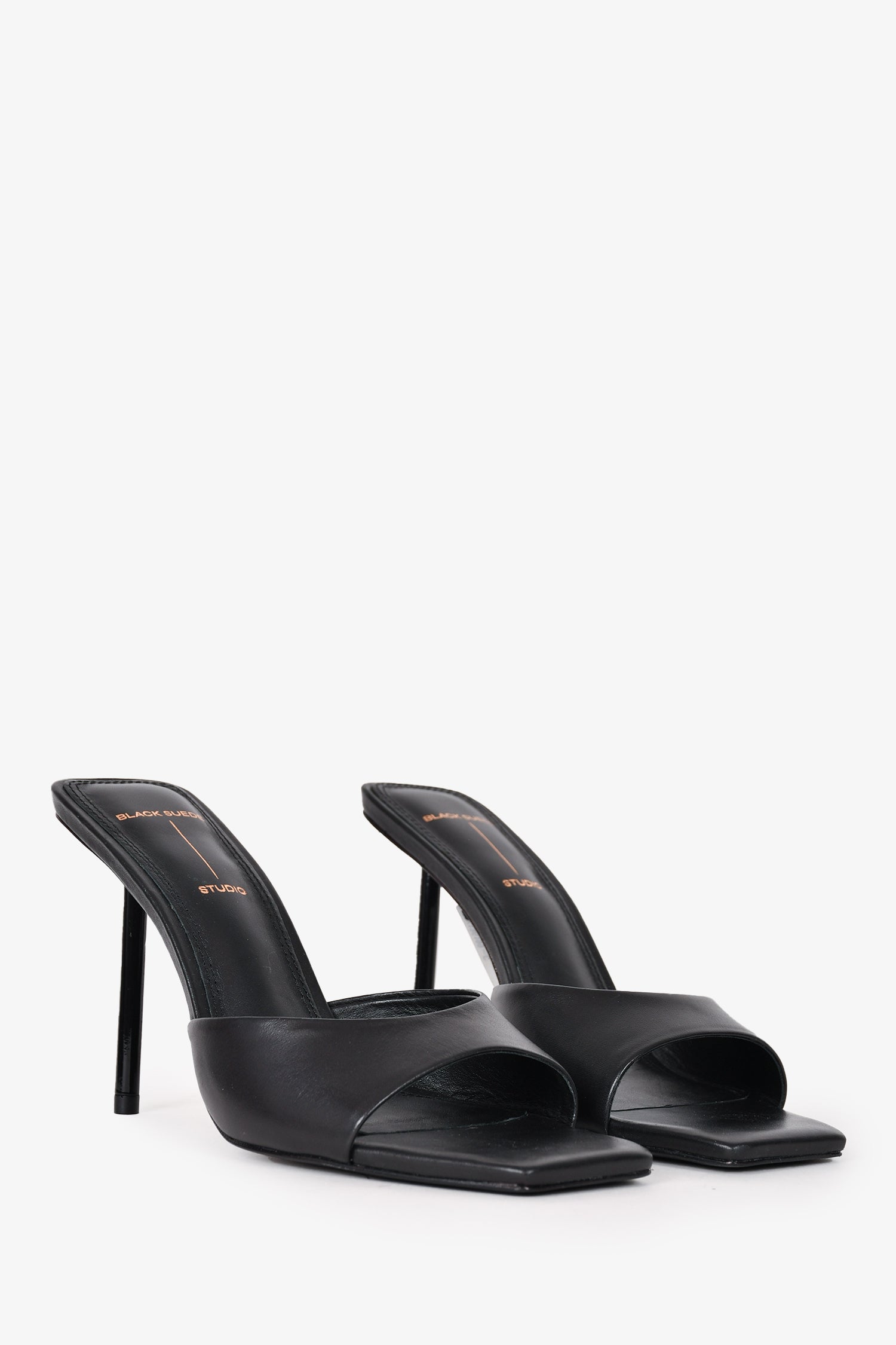 Refresh availabilityBlack Suede Studio Black Leather Heels. Slip-on. Open square toe. Tonal stitching.
