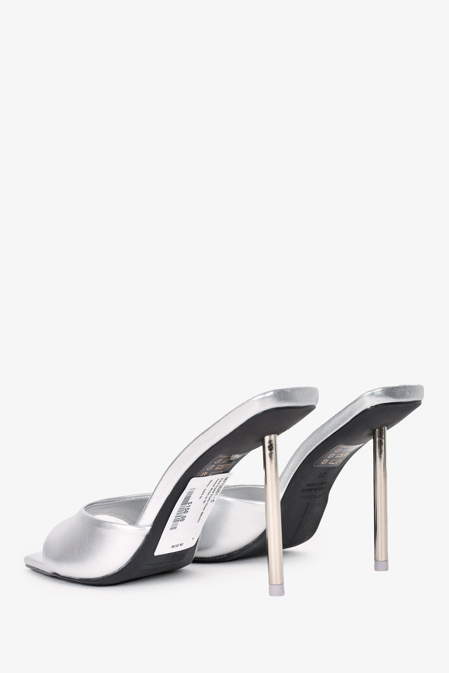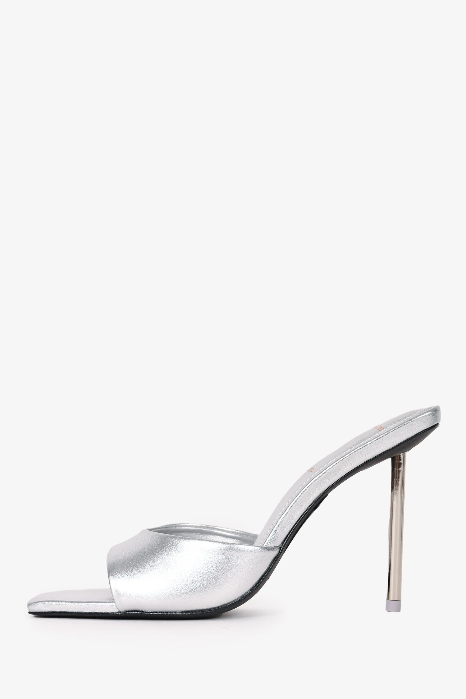 Refresh availabilityBlack Suede Studio Silver Metallic Heeled Mules. Slip-on. Open square toe.