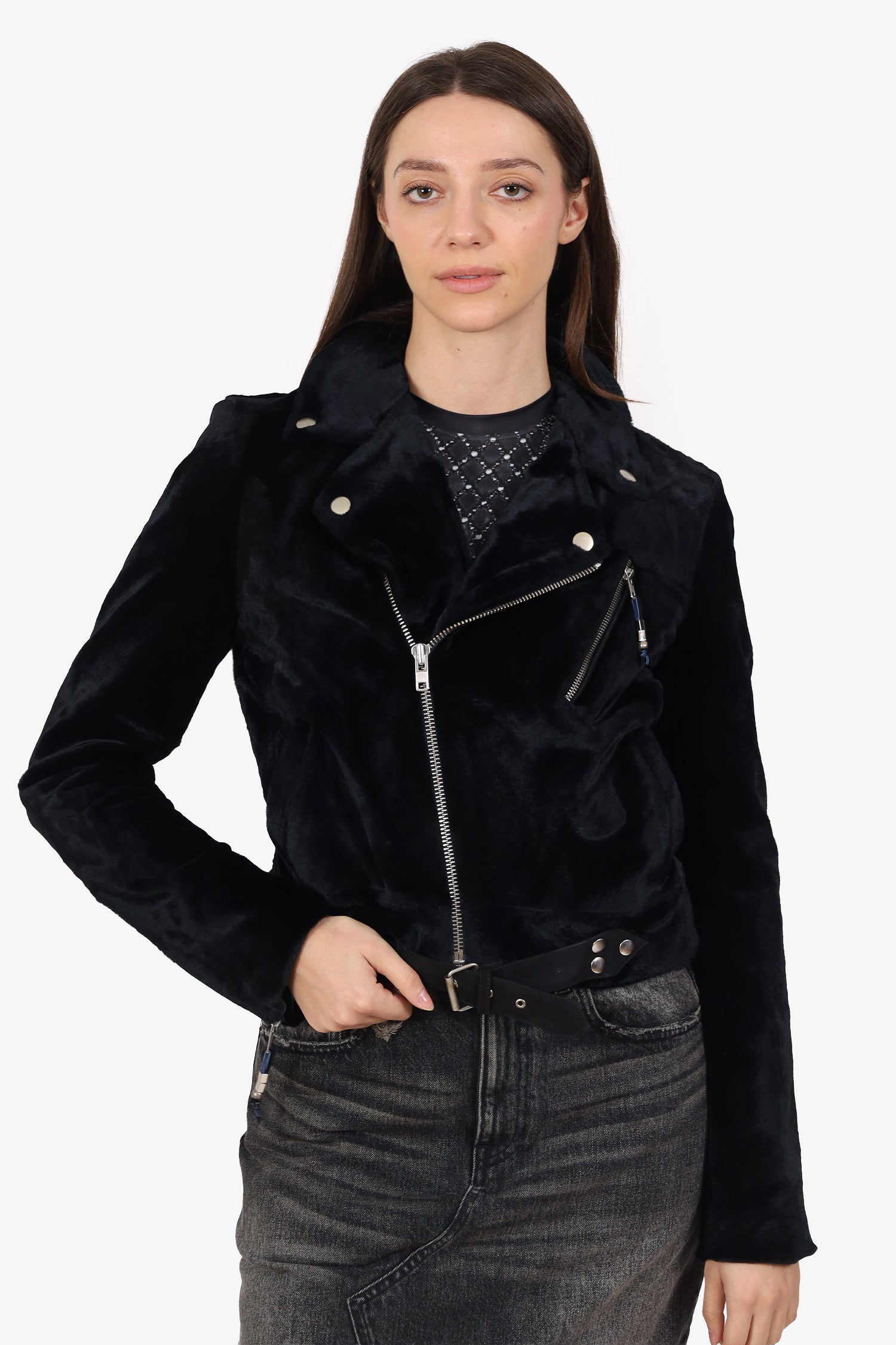 Refresh availabilityBLK DNM Black Calfskin Leather Biker Jacket. Pull-on. Collared neckline. Front zip and snap button-up closure. Sleeve cuffs with zip-up closure. Attached belt with adjustable pull-through buckle closure. 2 exterior side slip pockets. Lined interior with single slip pocket. Silver-tone hardware. Tonal stitching.