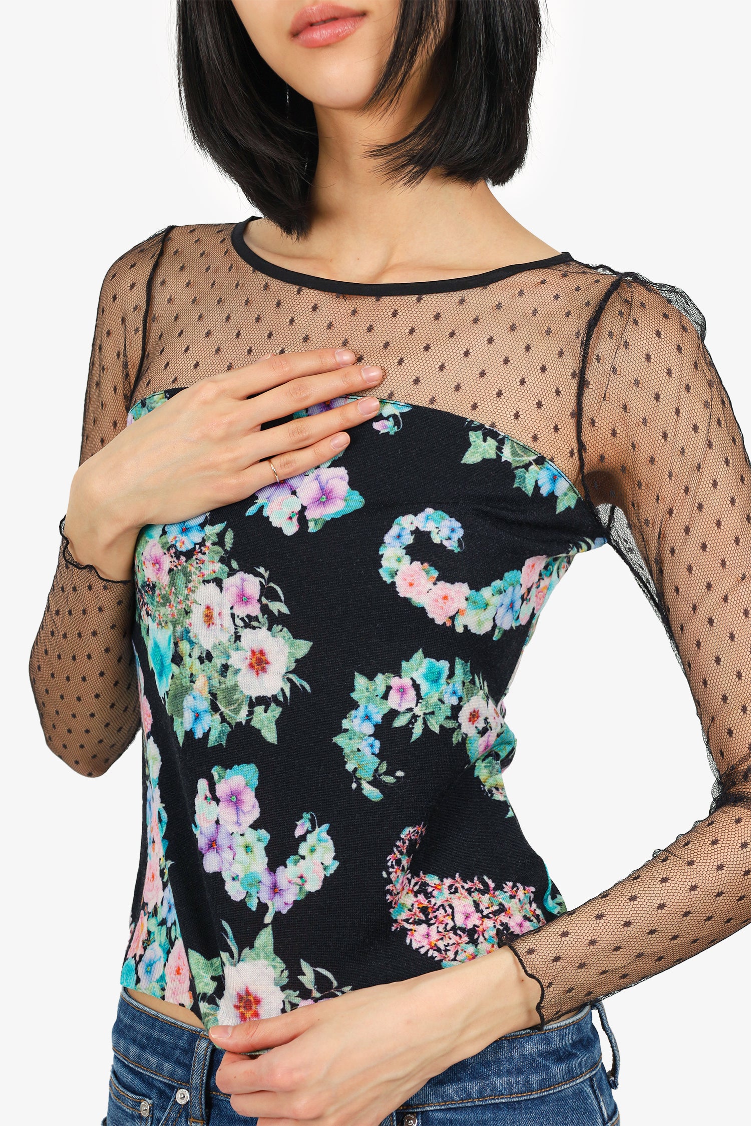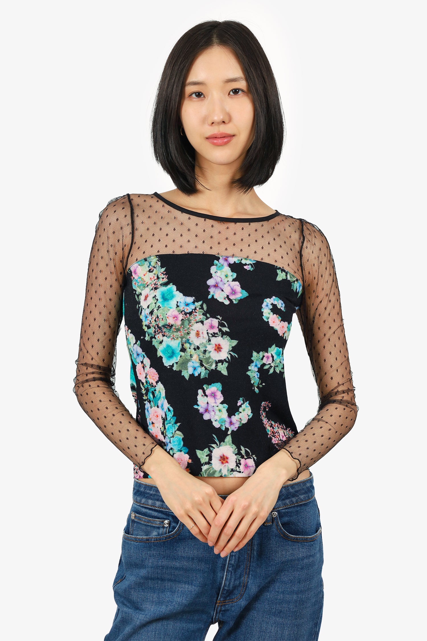 Blu Girl by Bluemarine Black Floral Print Mesh Sleeve Top Size 38