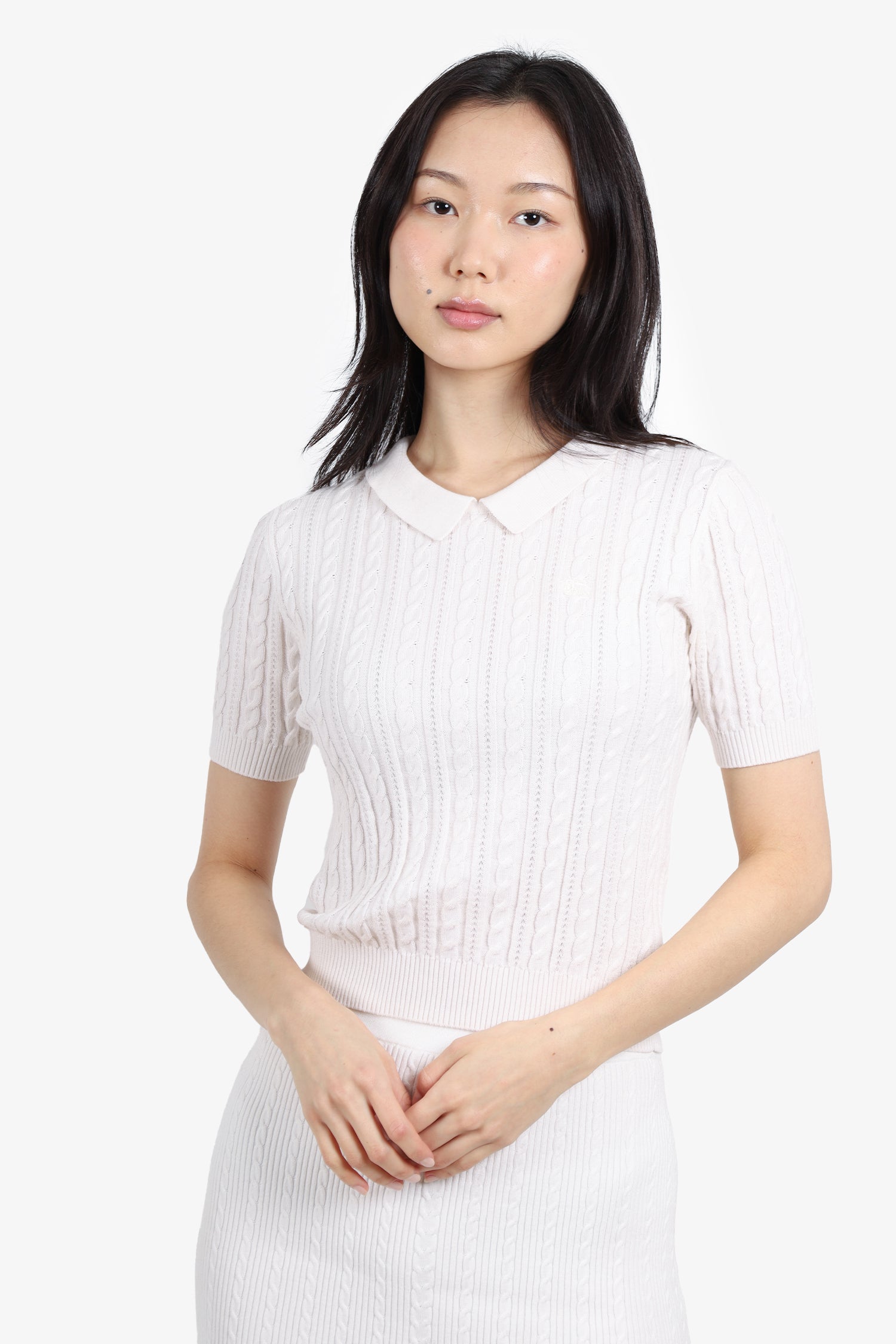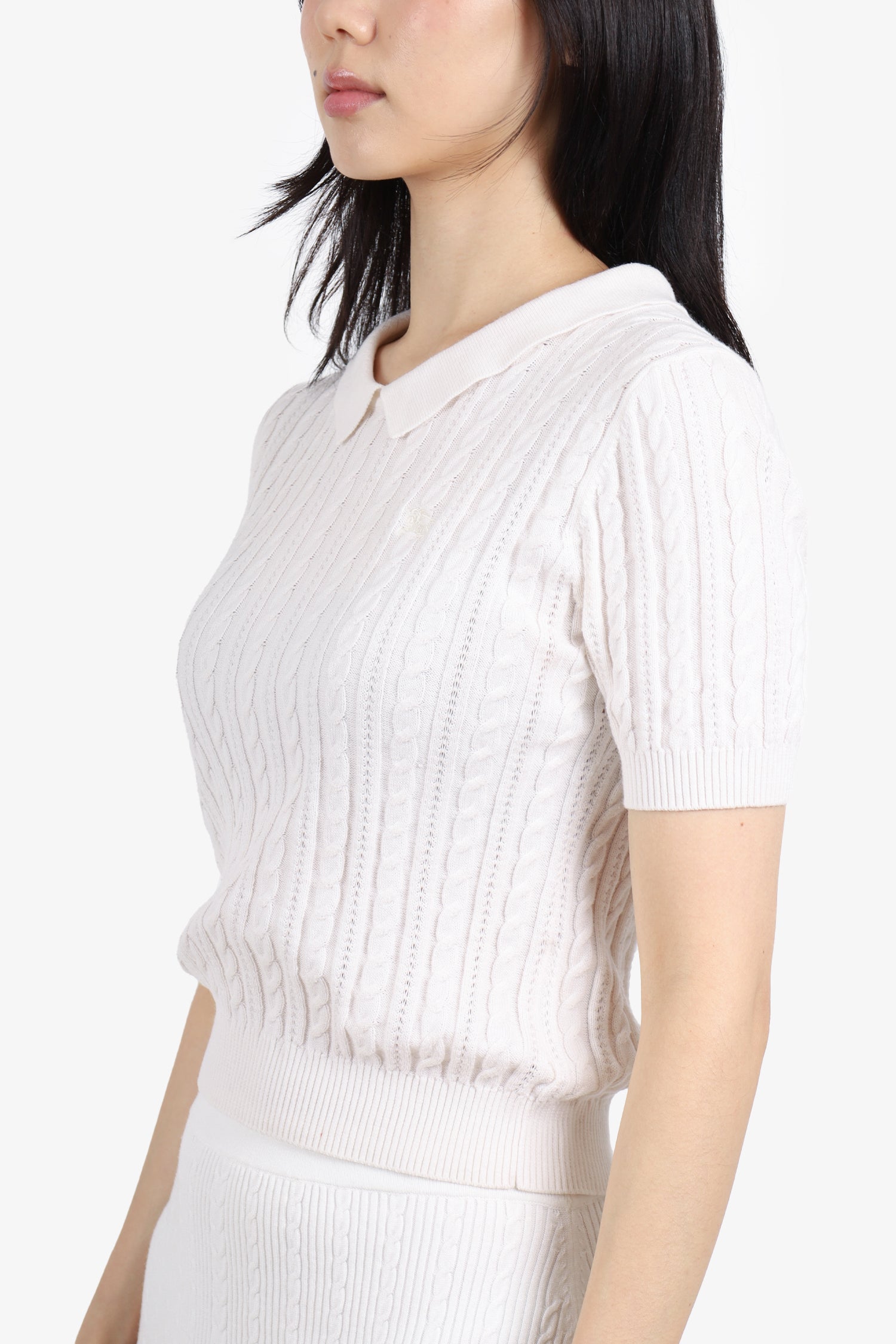 Refresh availabilityBlue Label Burberry White Knit Top. Collared neckline. Back button closure. Ribbed cuffs and hem. Tonal stitching.