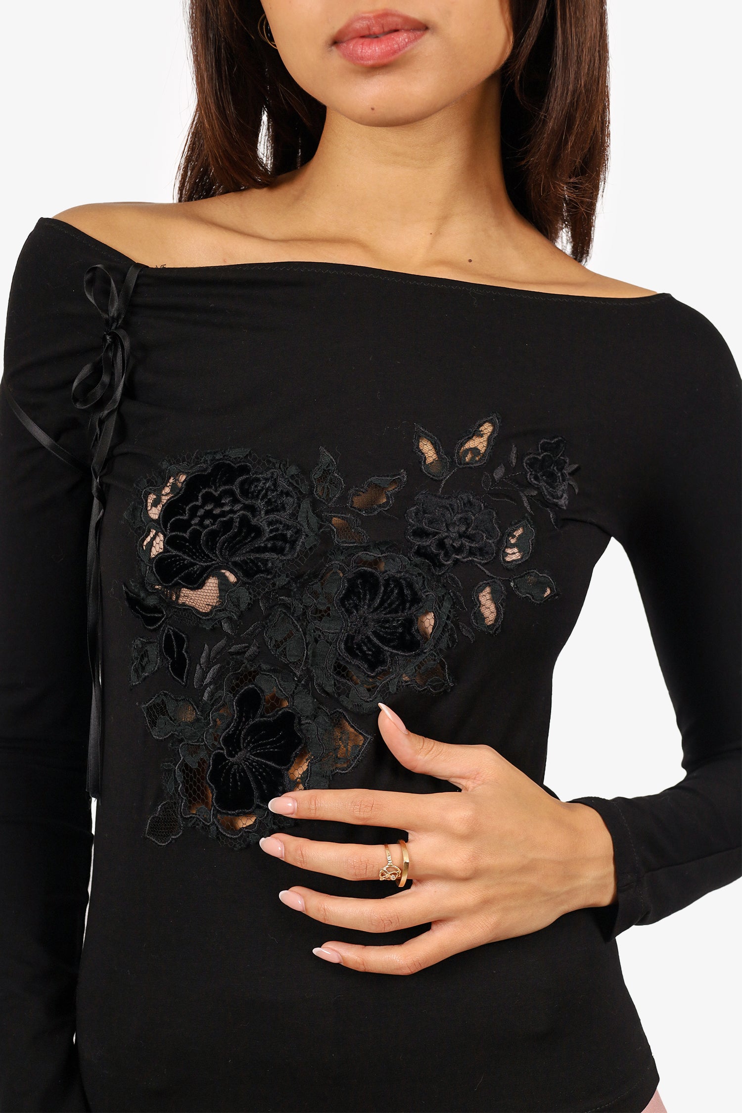 Refresh availabilityBluemarine Black Lace/Velvet Floral Embossed Long Sleeve Top. Boat-neckline. Tie-up design on right arm. Centre embossed design. Tonal stitching.