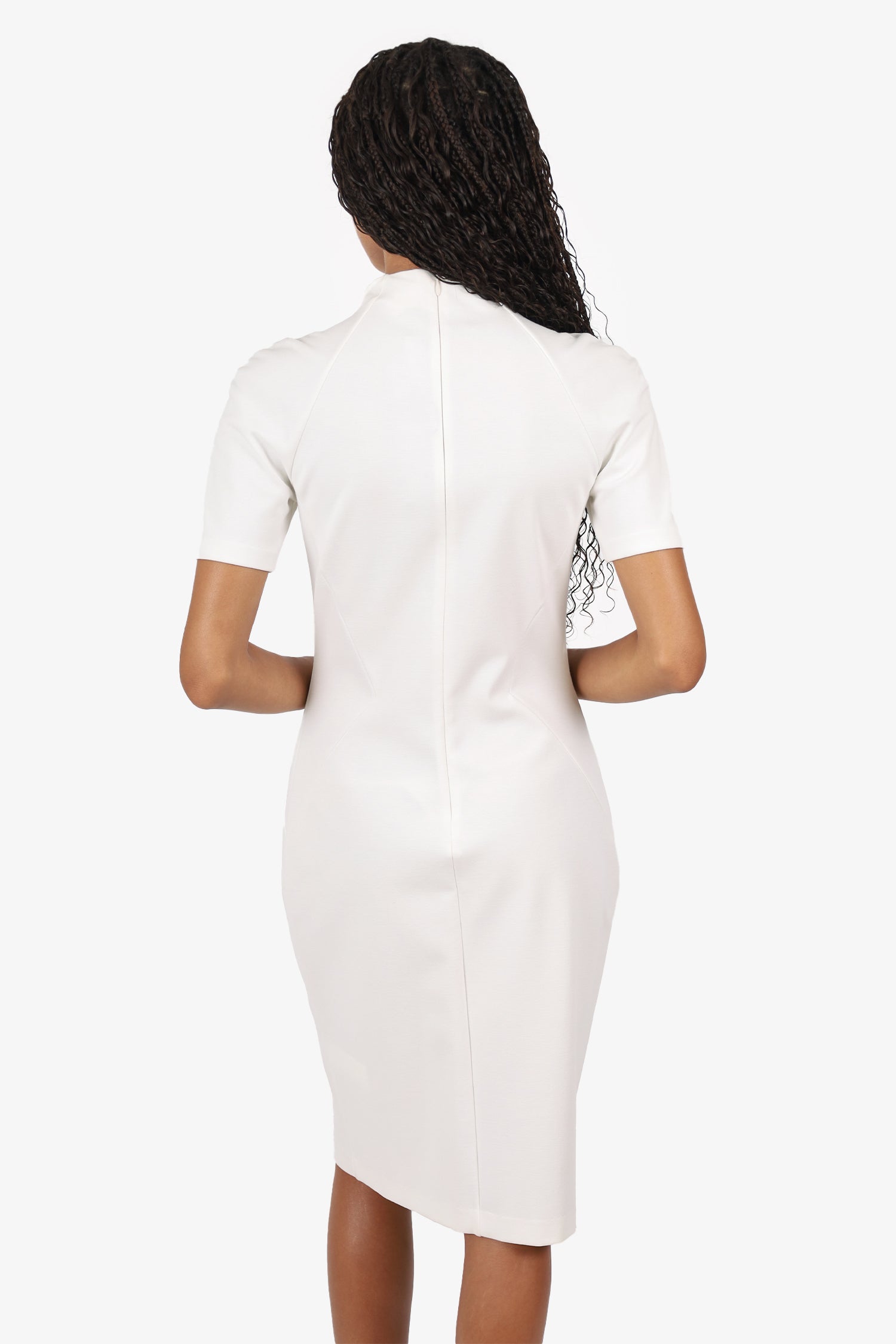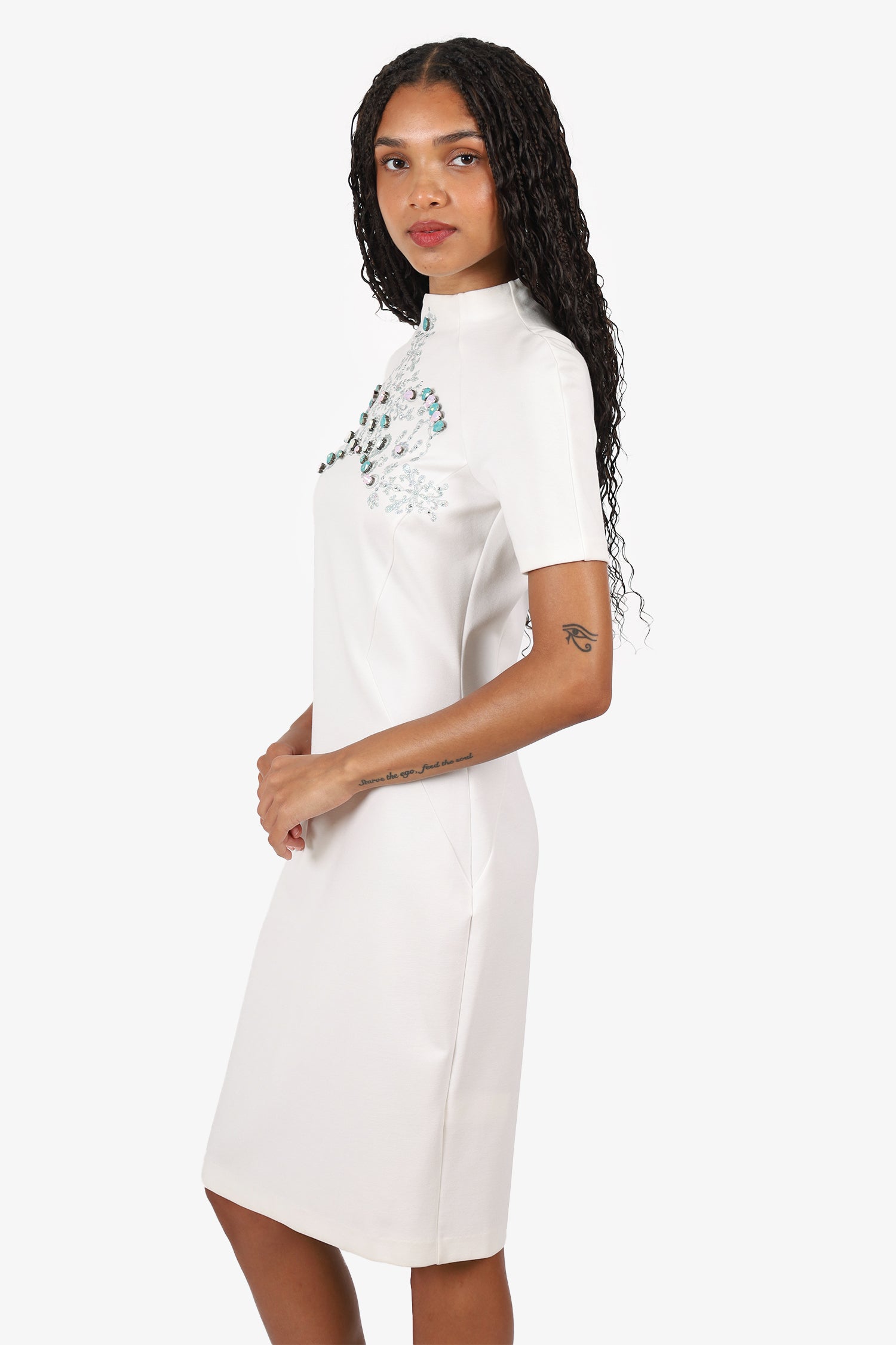 Refresh availabilityBluemarine Swarovski Crystal Embellished Mock Neck Dress. Slip-on. Mock neckline. Rear zip and hook closure. Silver-tone hardware. Tonal stitching.