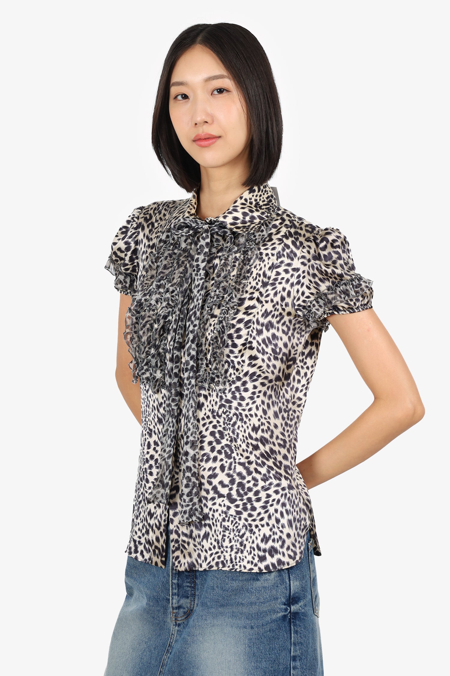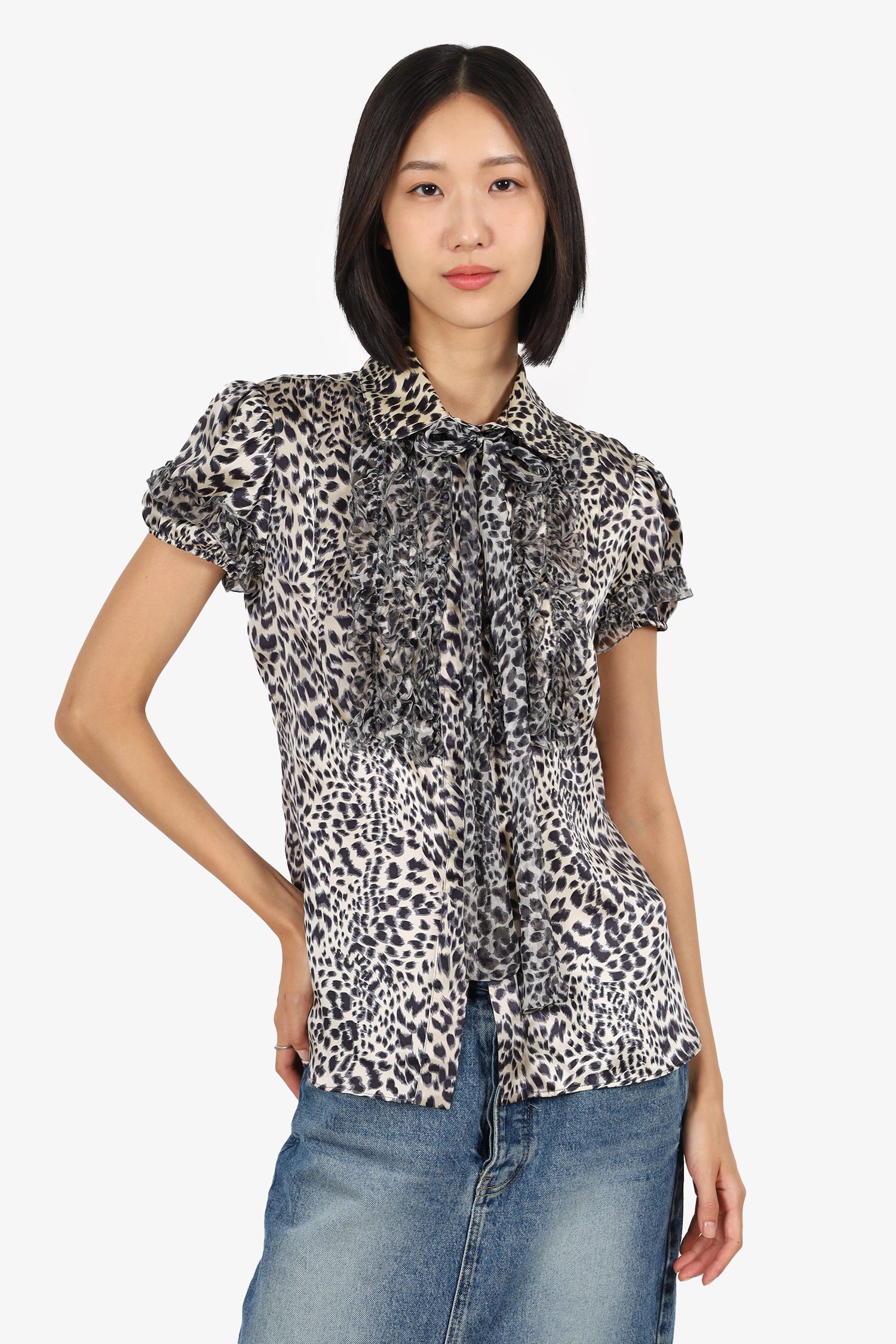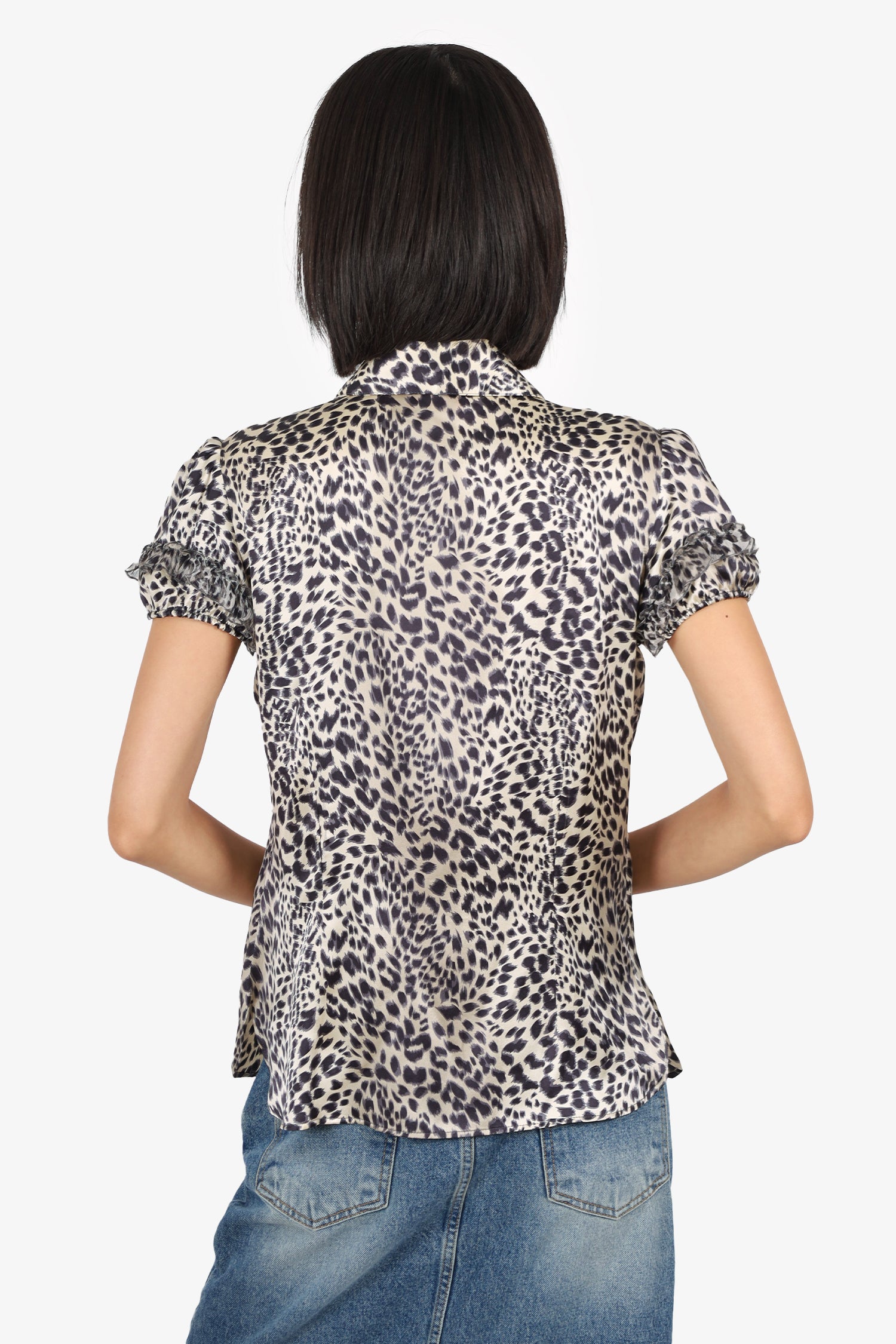 Blumarine Blugirl Leopard print Ruffle Detail Short Sleeve Top. Pull-on. Collared-neckline. Tie-up closure at neckline. Front button-up closure. Elasticated sleeve cuffs. Tonal stitching.