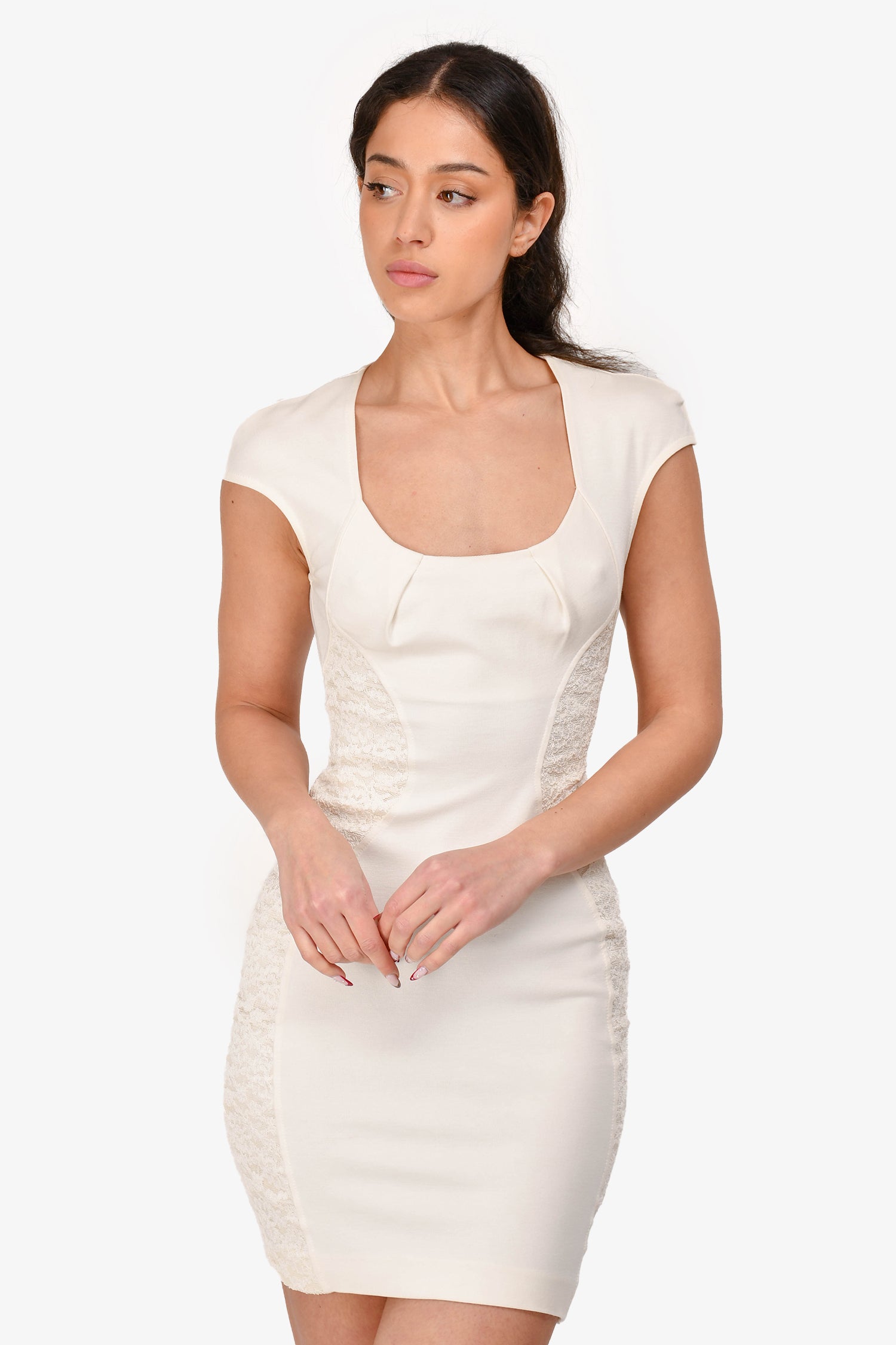 Refresh availabilityBlumarine Cream Cotton/Lace Dress. Round neckline. Cap sleeves. Back concealed zipper closure with keyhole button. Tonal stitching.