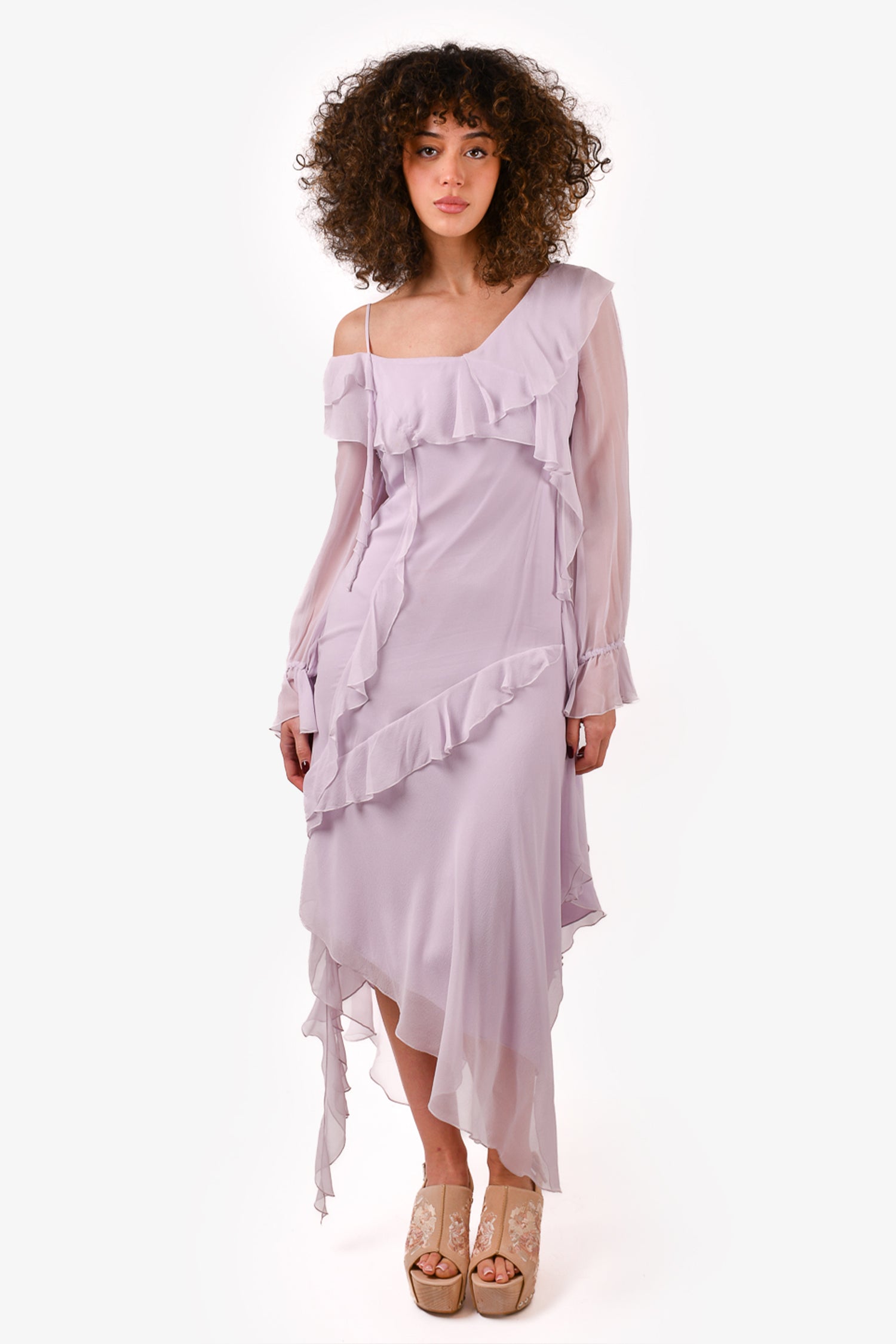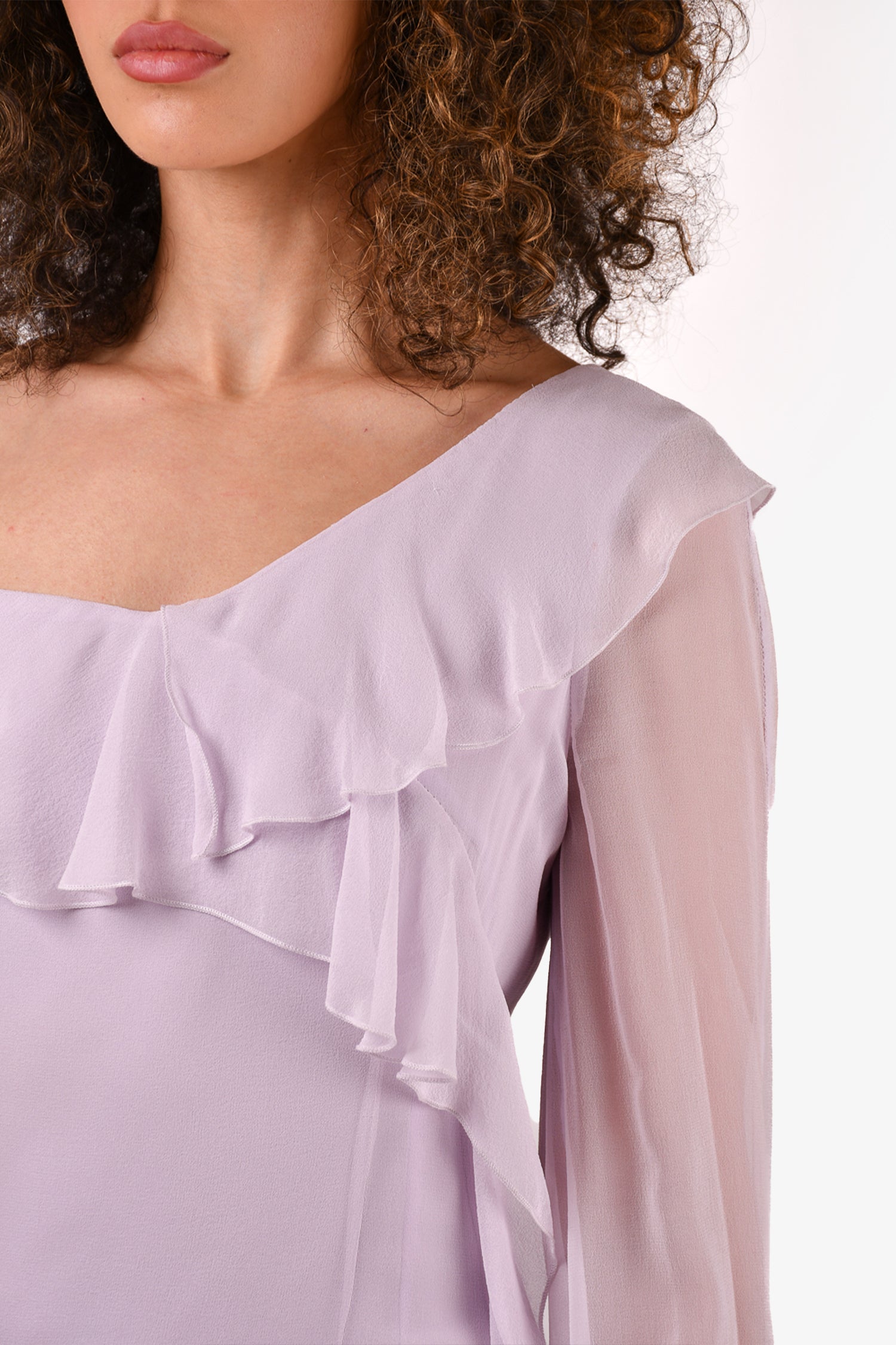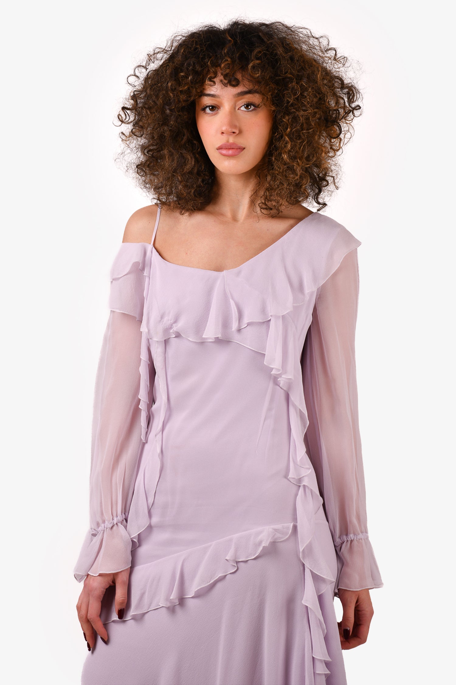 Refresh availabilityBlumarine Lilac Silk Ruffle Dress. Side zip closure. Lined. Button closure on the cuffs. Tonal stitching.