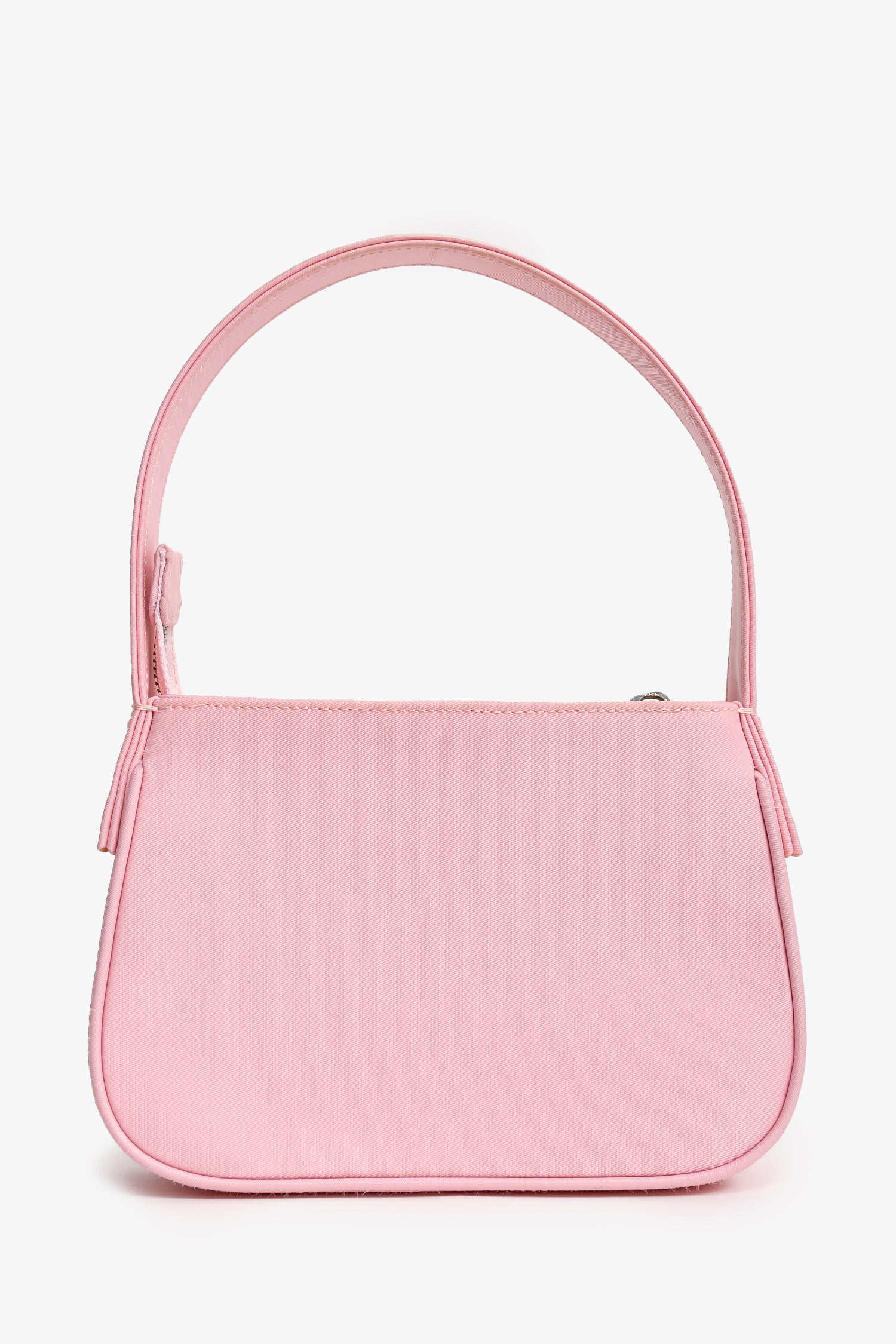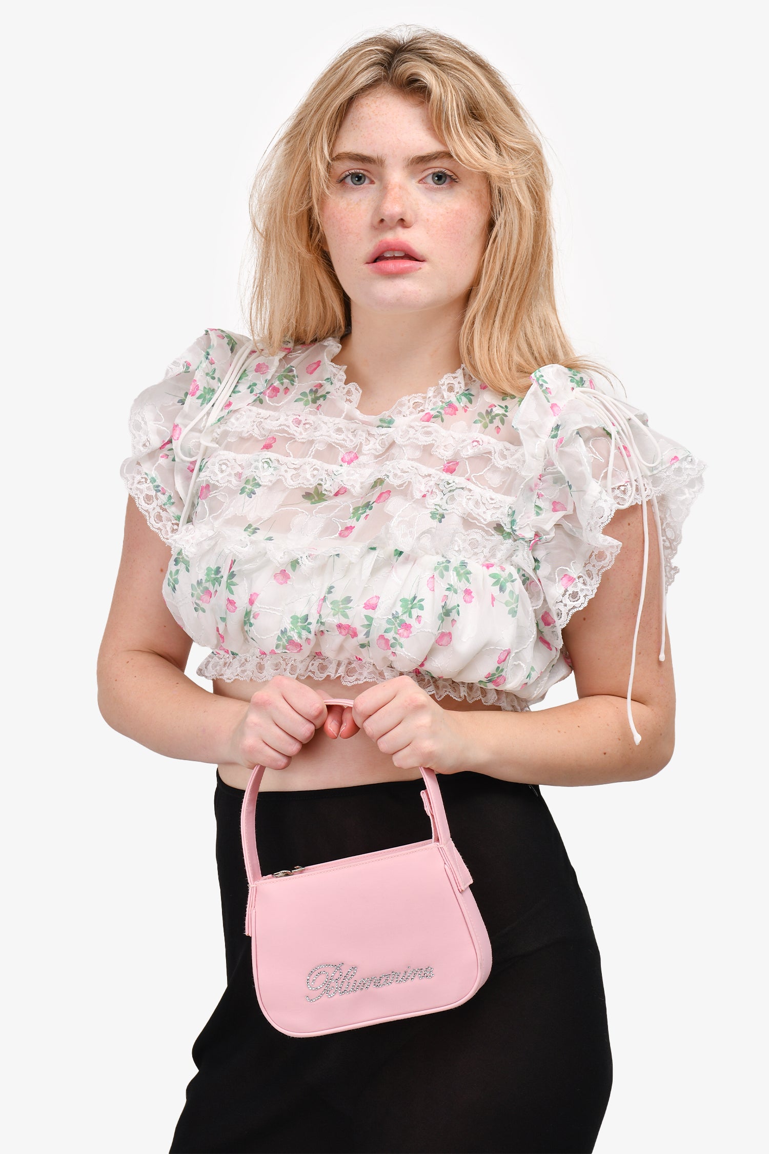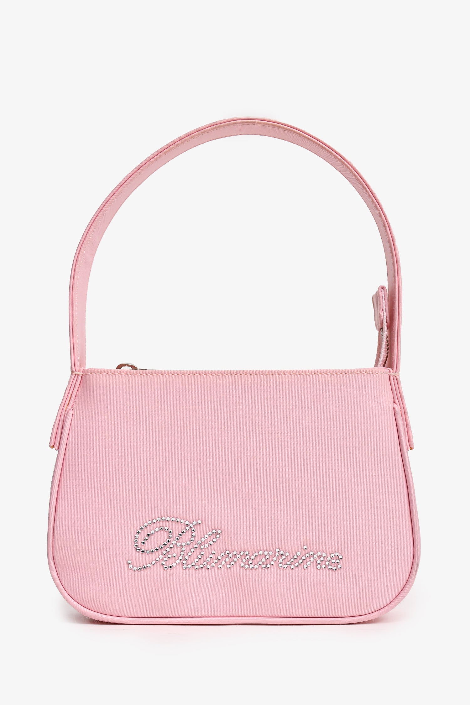 Refresh availabilityBlumarine Pink Satin Mini Top Handle Bag. Single flat top handle. Crystallized logo. Zipped top. Tonal stitching. Animal print lined interior. Silver-tone hardware.