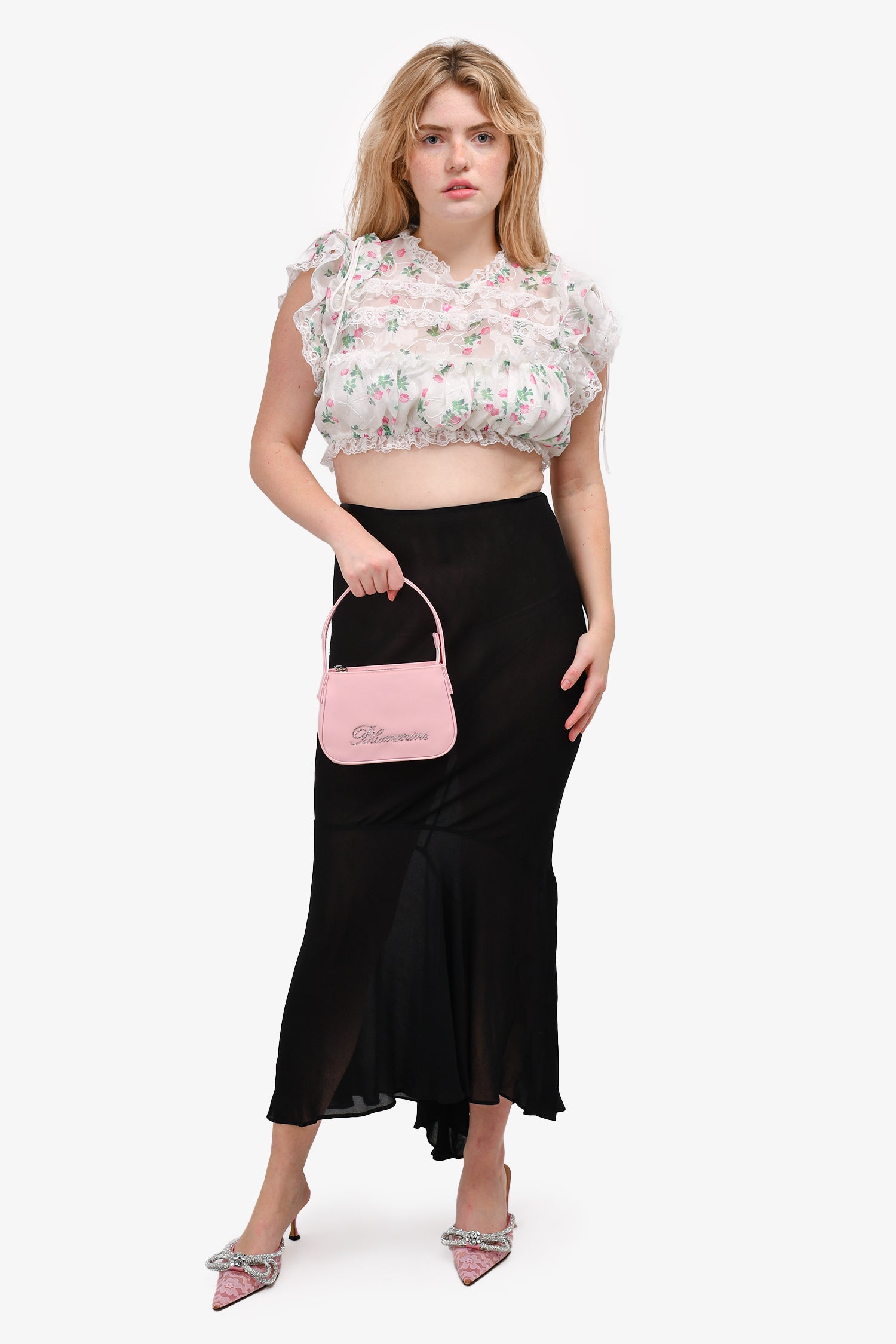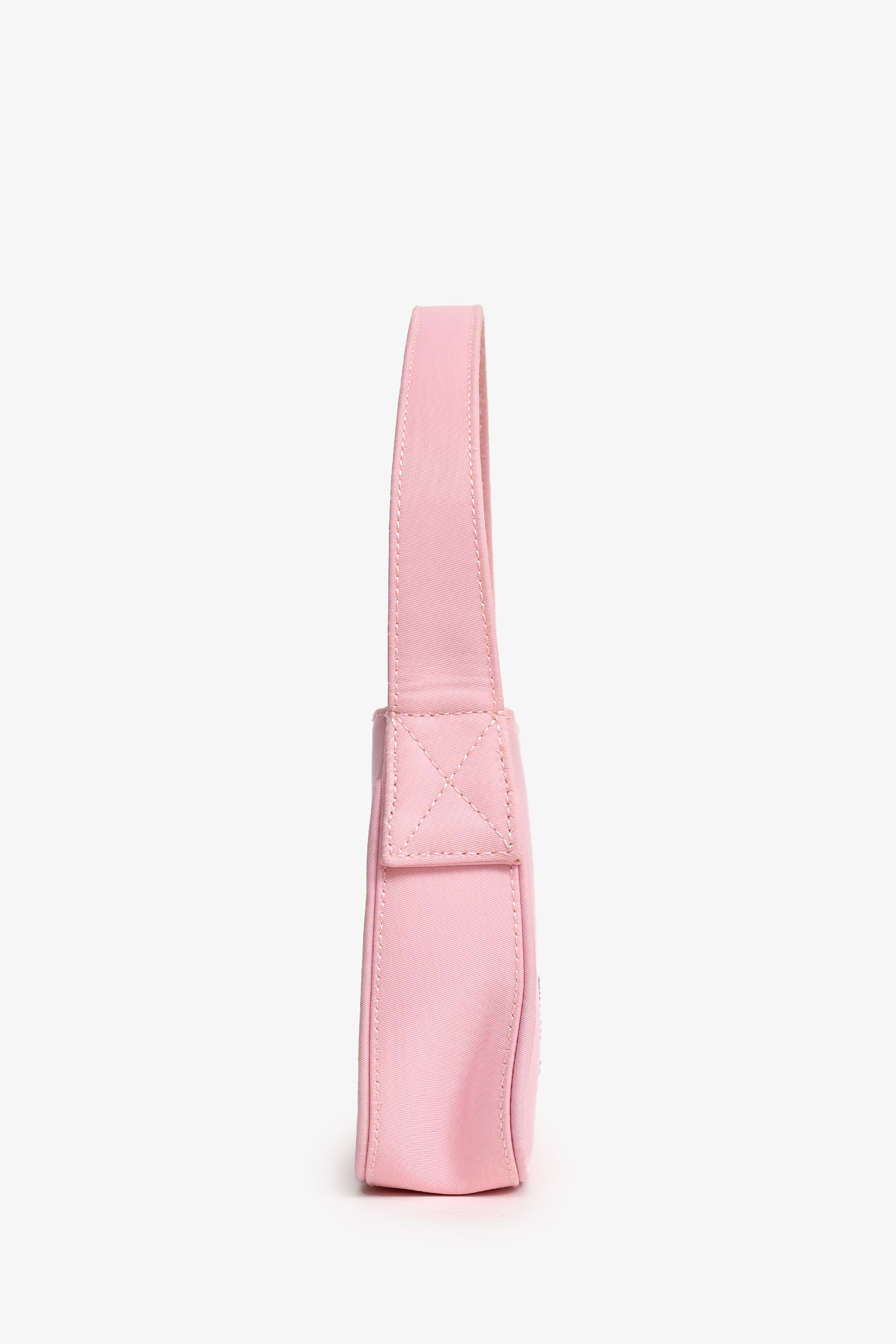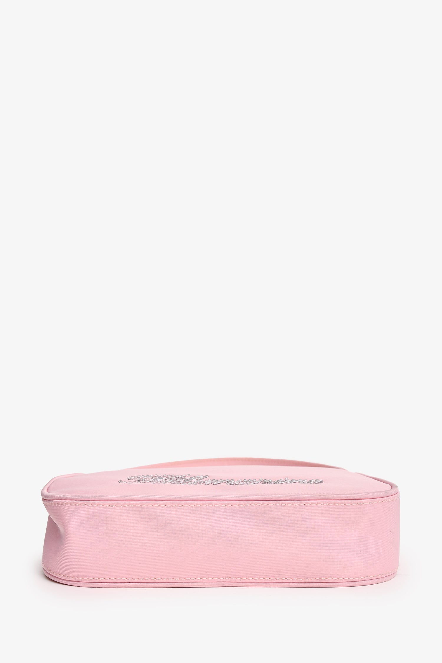 Refresh availabilityBlumarine Pink Satin Mini Top Handle Bag. Single flat top handle. Crystallized logo. Zipped top. Tonal stitching. Animal print lined interior. Silver-tone hardware.