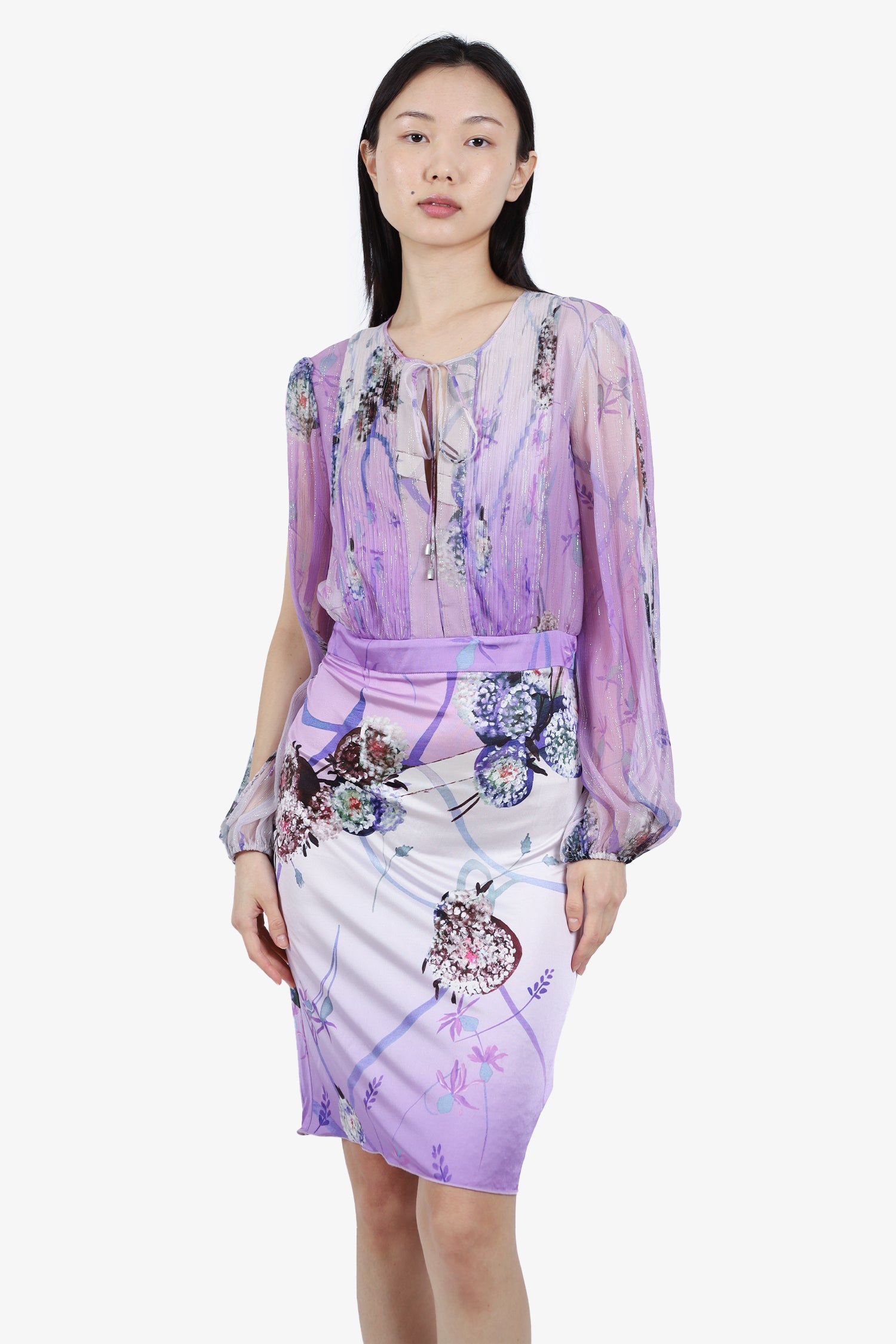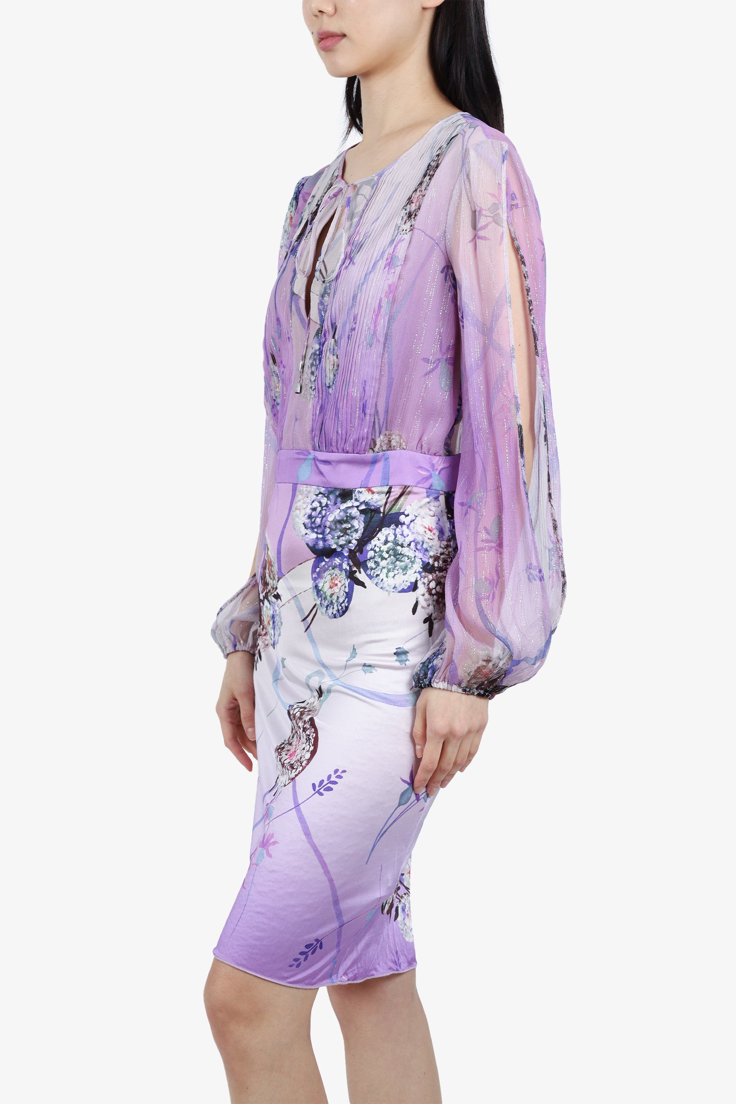 Refresh availabilityBlumarine Purple Silk Floral Print Cocktail Dress. Round neckline. Back zipper closure. Sleeve, back and front keyhole detail. Tonal stitching.
