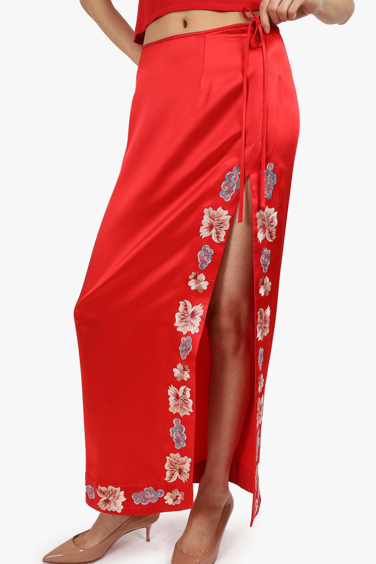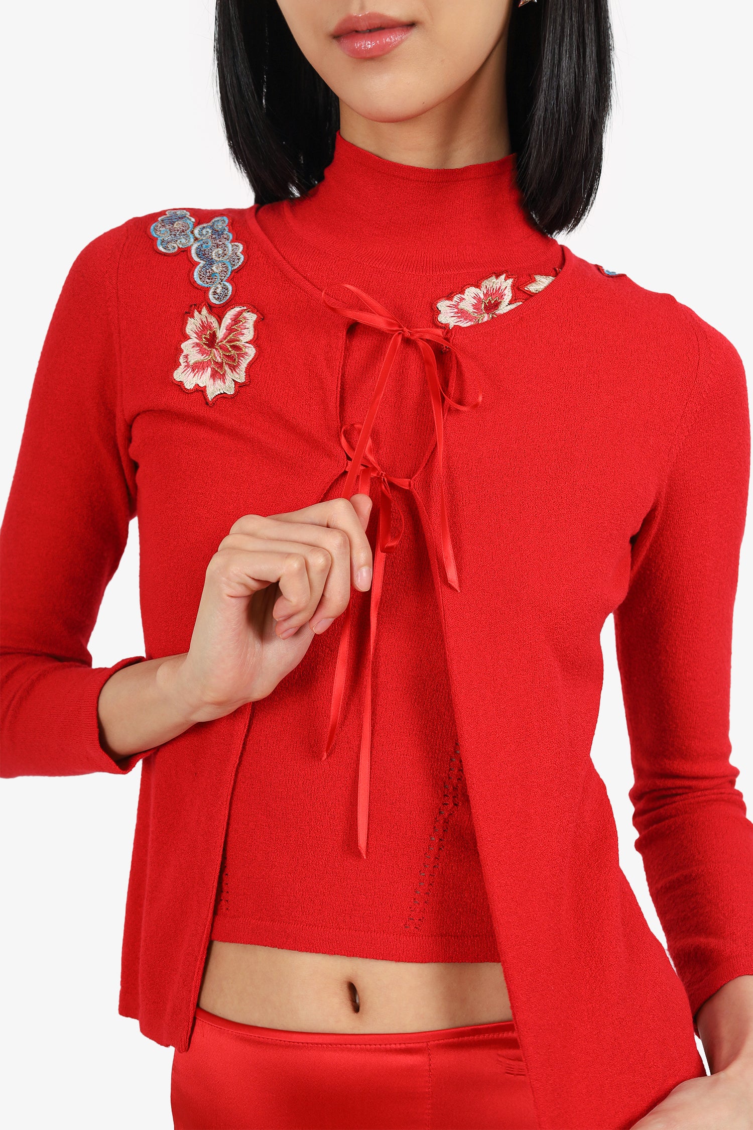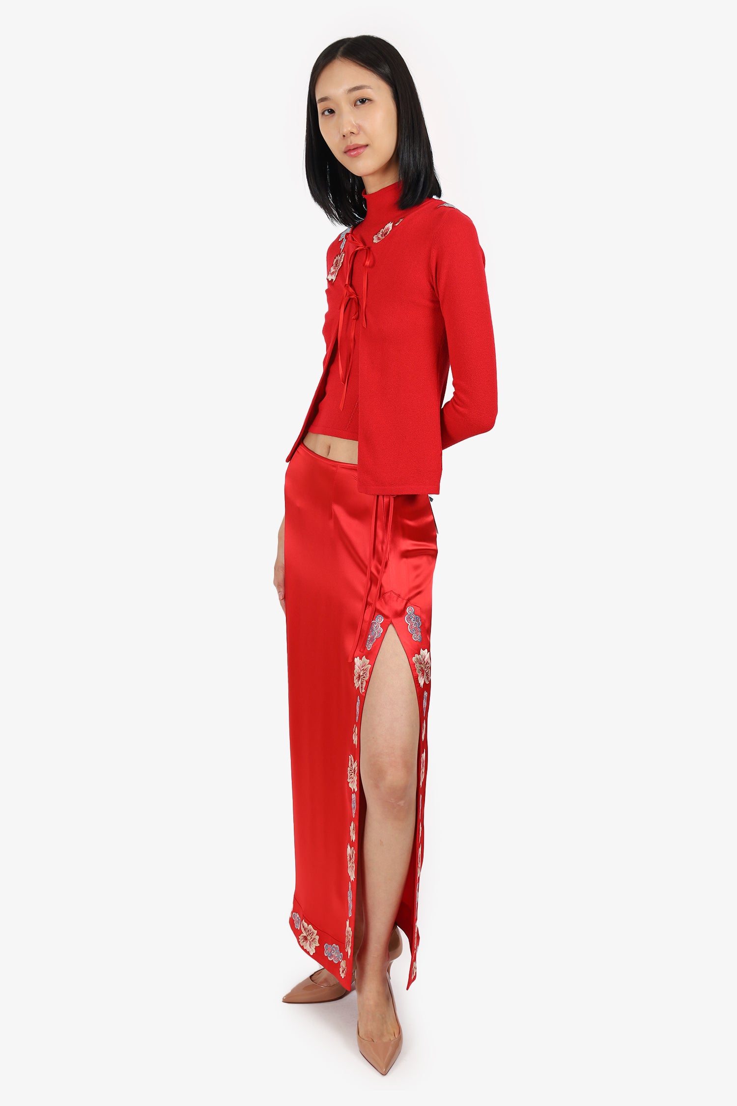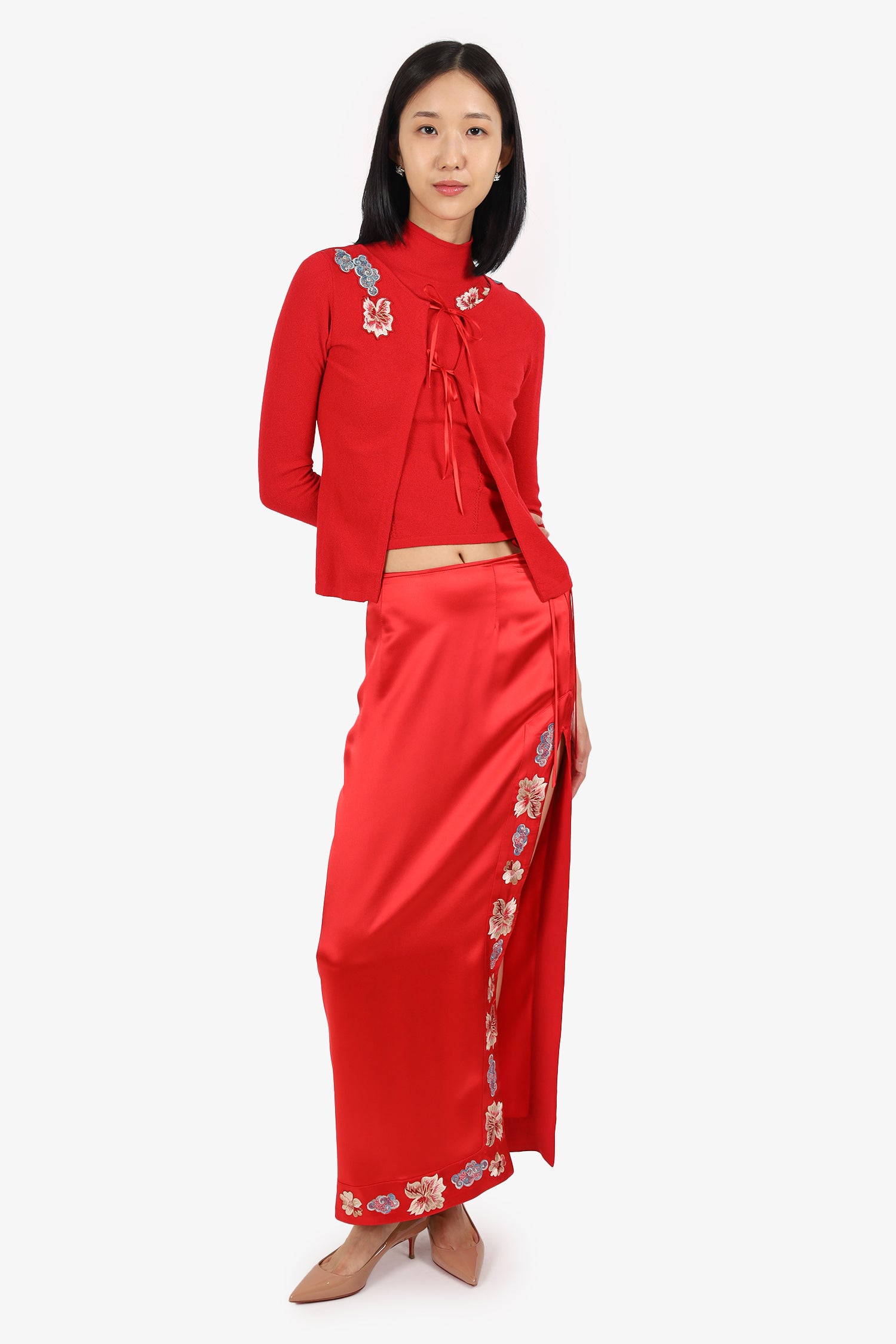 Refresh availabilityBlumarine Red Floral Applique Top + Cardigan + Maxi Skirt. Top: Pull-on. Mock-neckline. Rear zip closure; Cardigan: Pull-on. Round neckline. Front tie-up closure; Skirt: Slip-on. Side zip with tie-up closure. Left bottom slit. Unlined. Tonal stitching.
