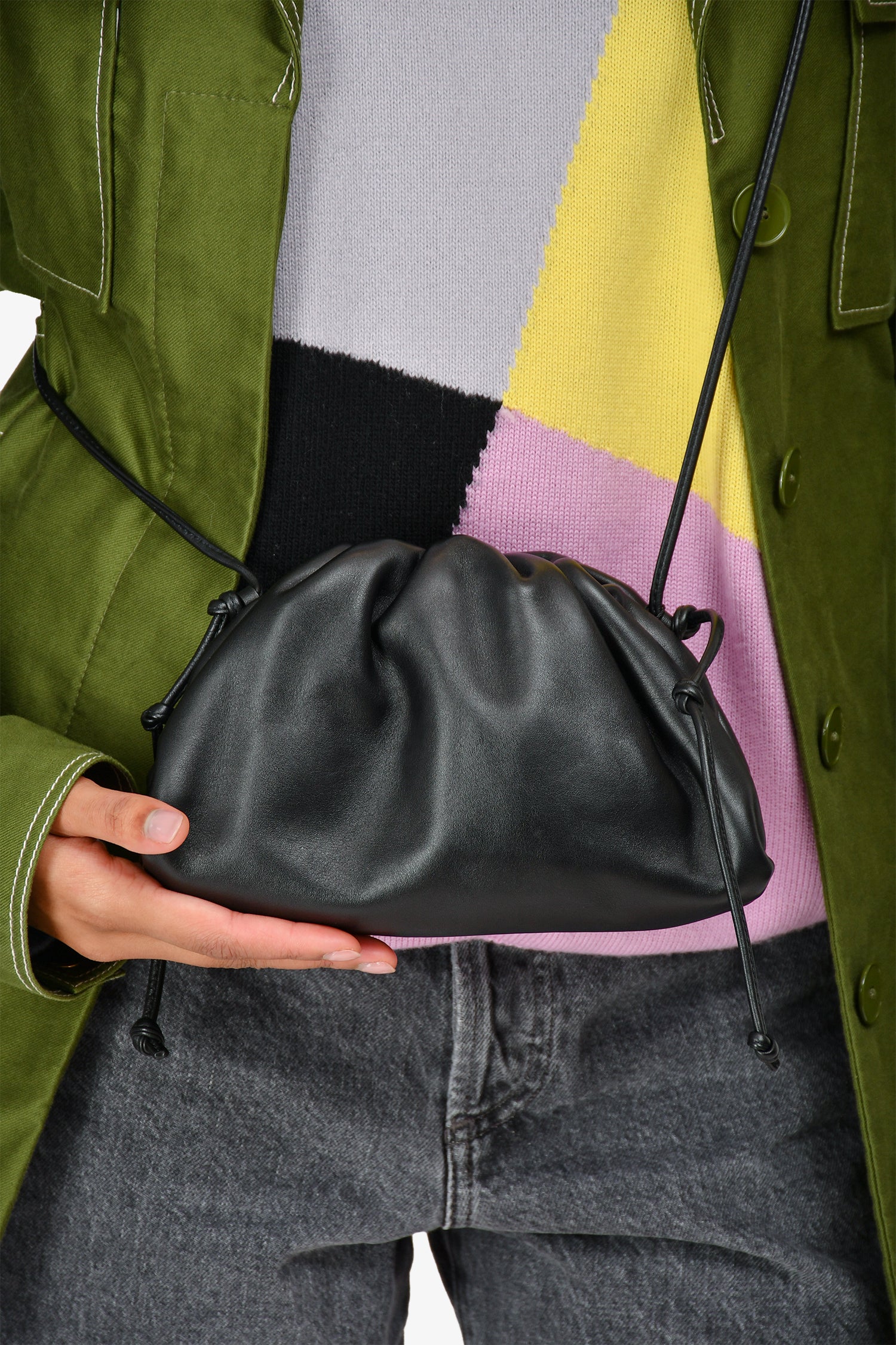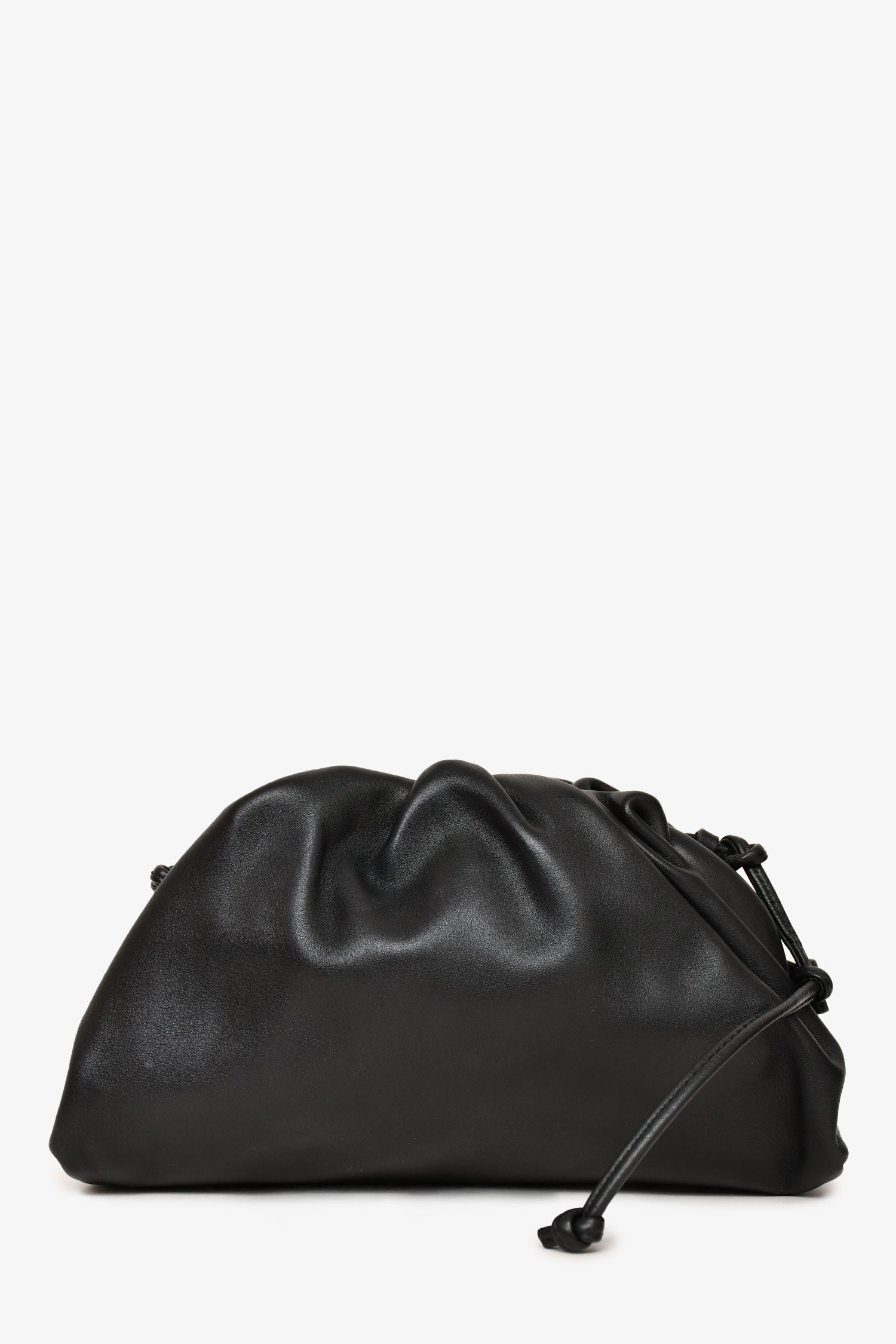 Refresh availabilityBottega Black Smooth Leather Mini Pouch Crossbody. Top magnetic closure. Silver-tone hardware. Crossbody strap. Ruched throughout. Tonal stitching.