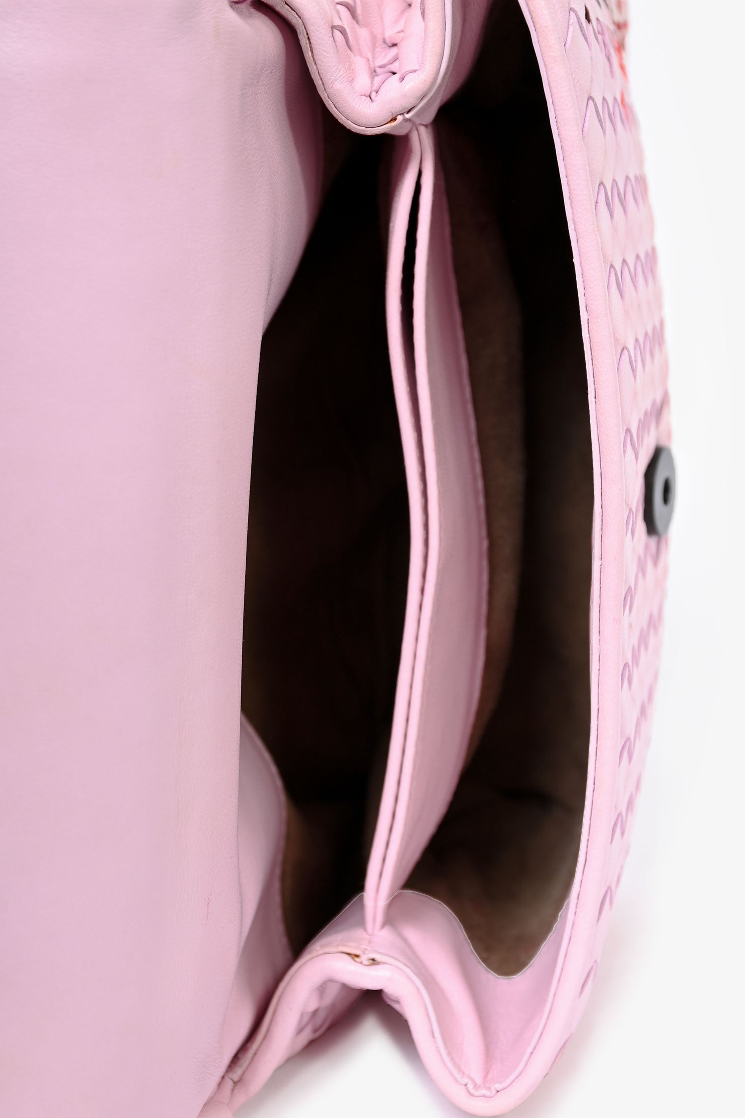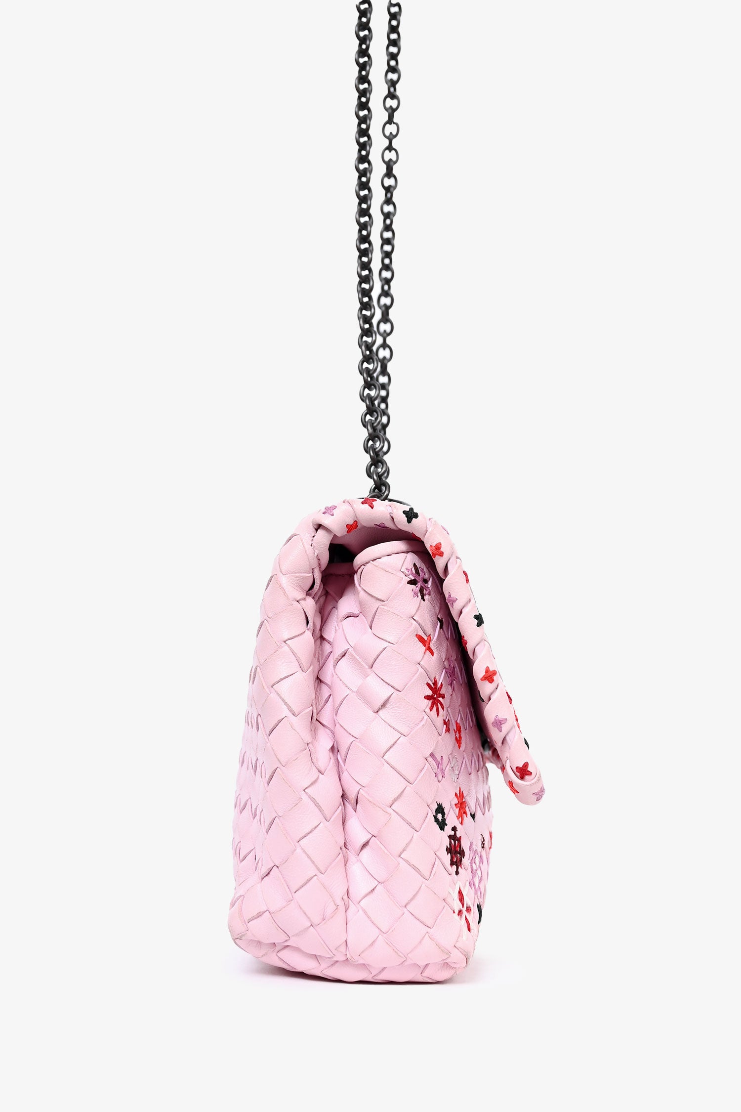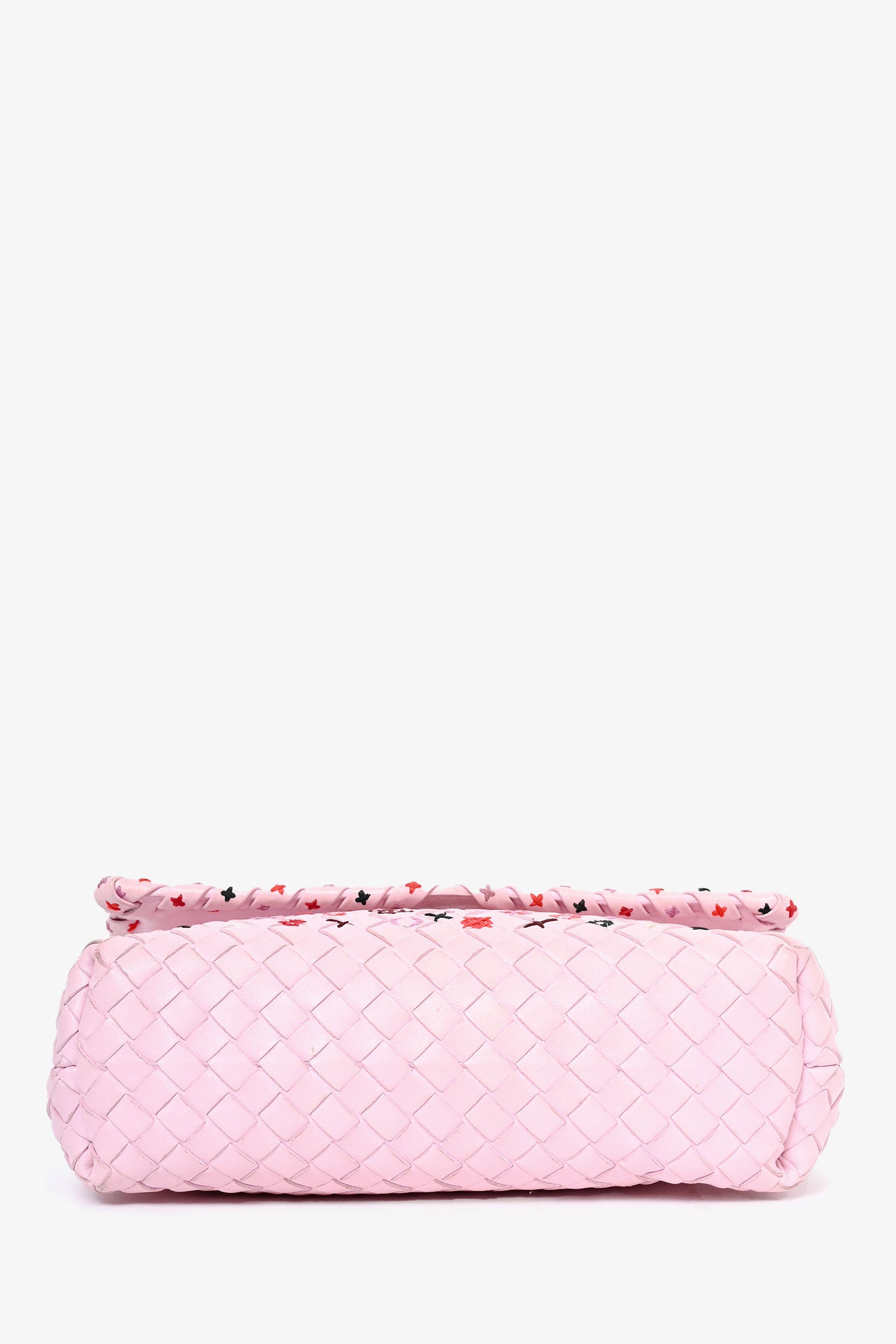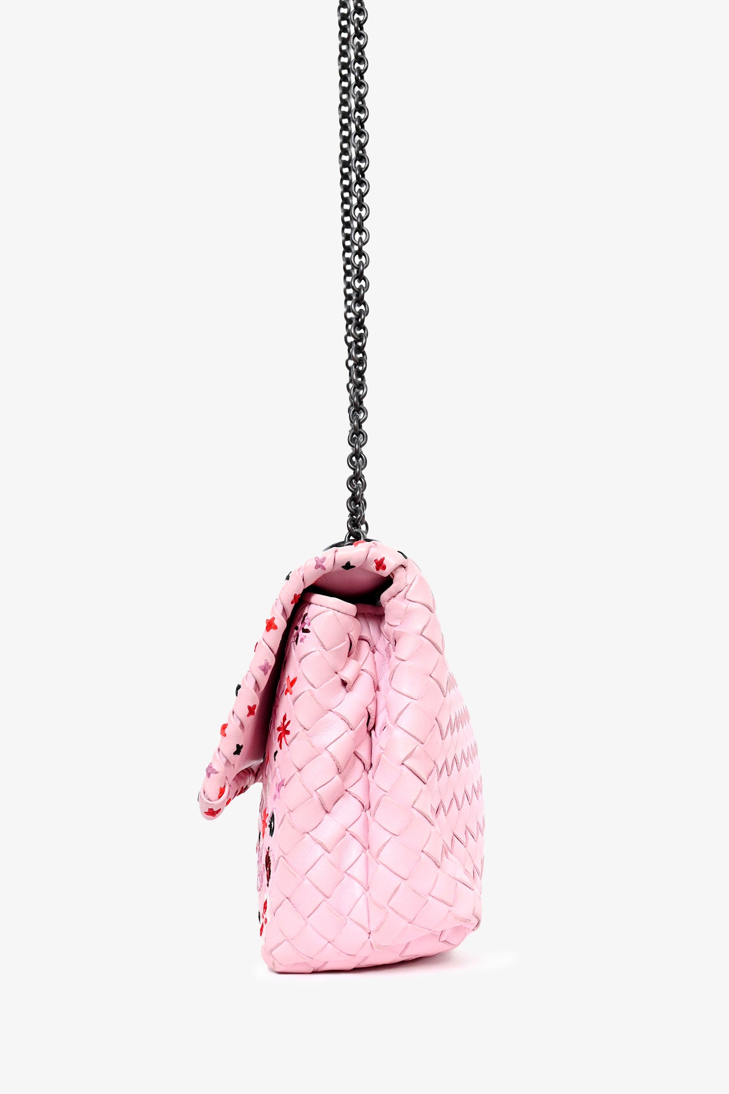 Bottega Veneta 2018 Resort Pink Leather Embroidered Crossbody. Antiqued black-tone hardware. Intrecciato weaving. Fold-over flap with snap closure. Suede lined interior. 3 interior compartments. Chain-link crossbody strap.