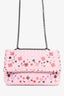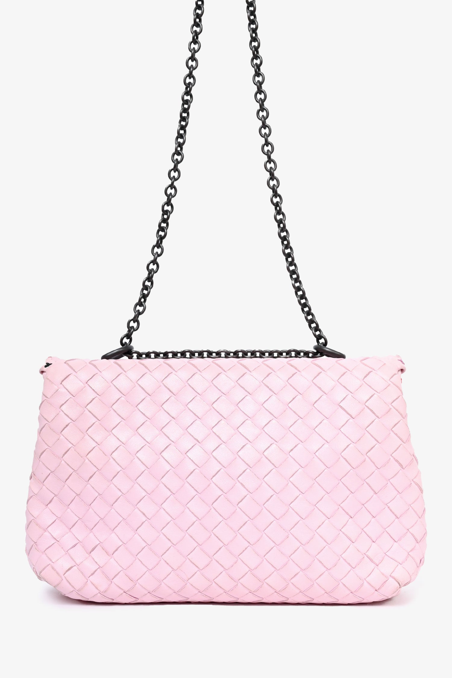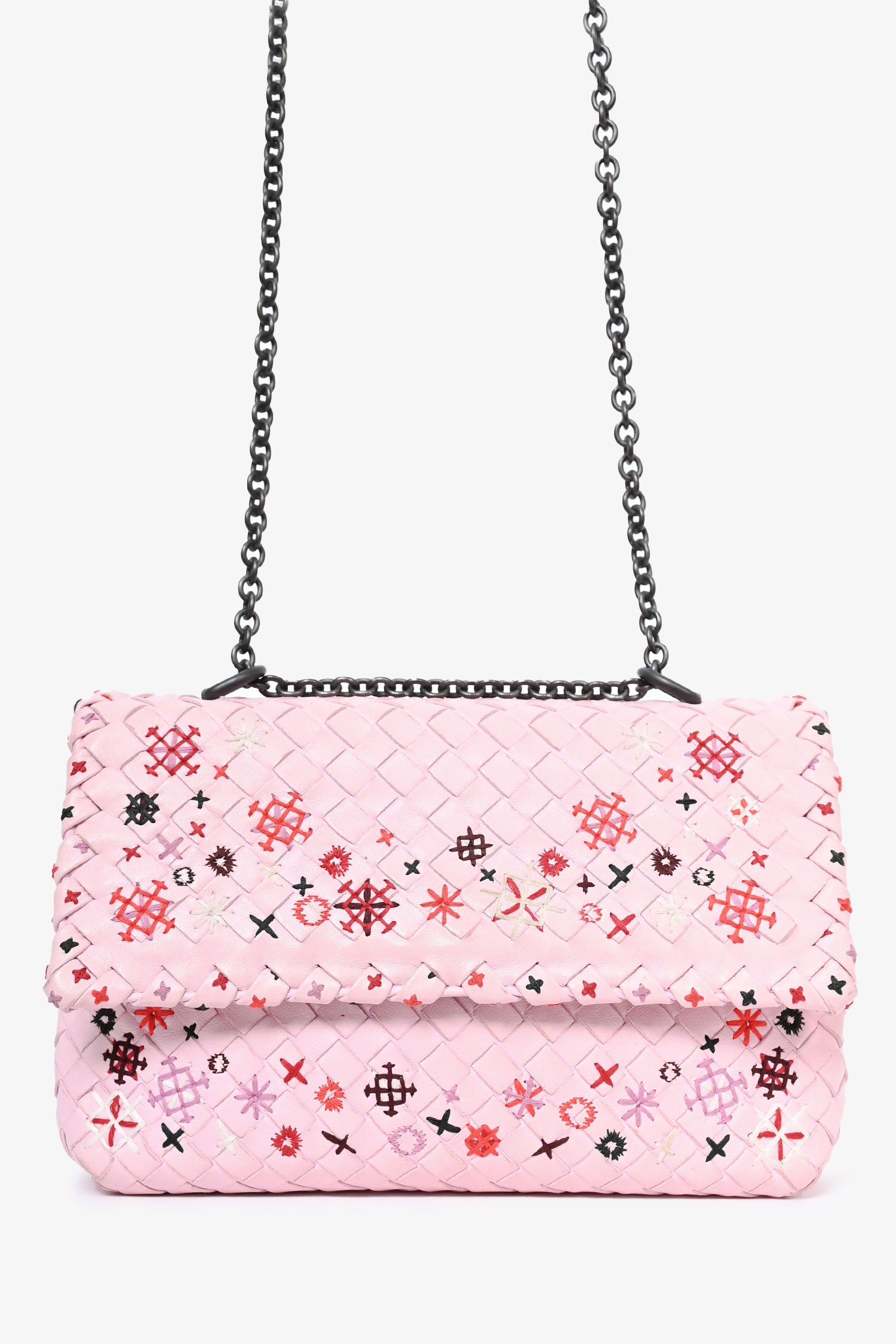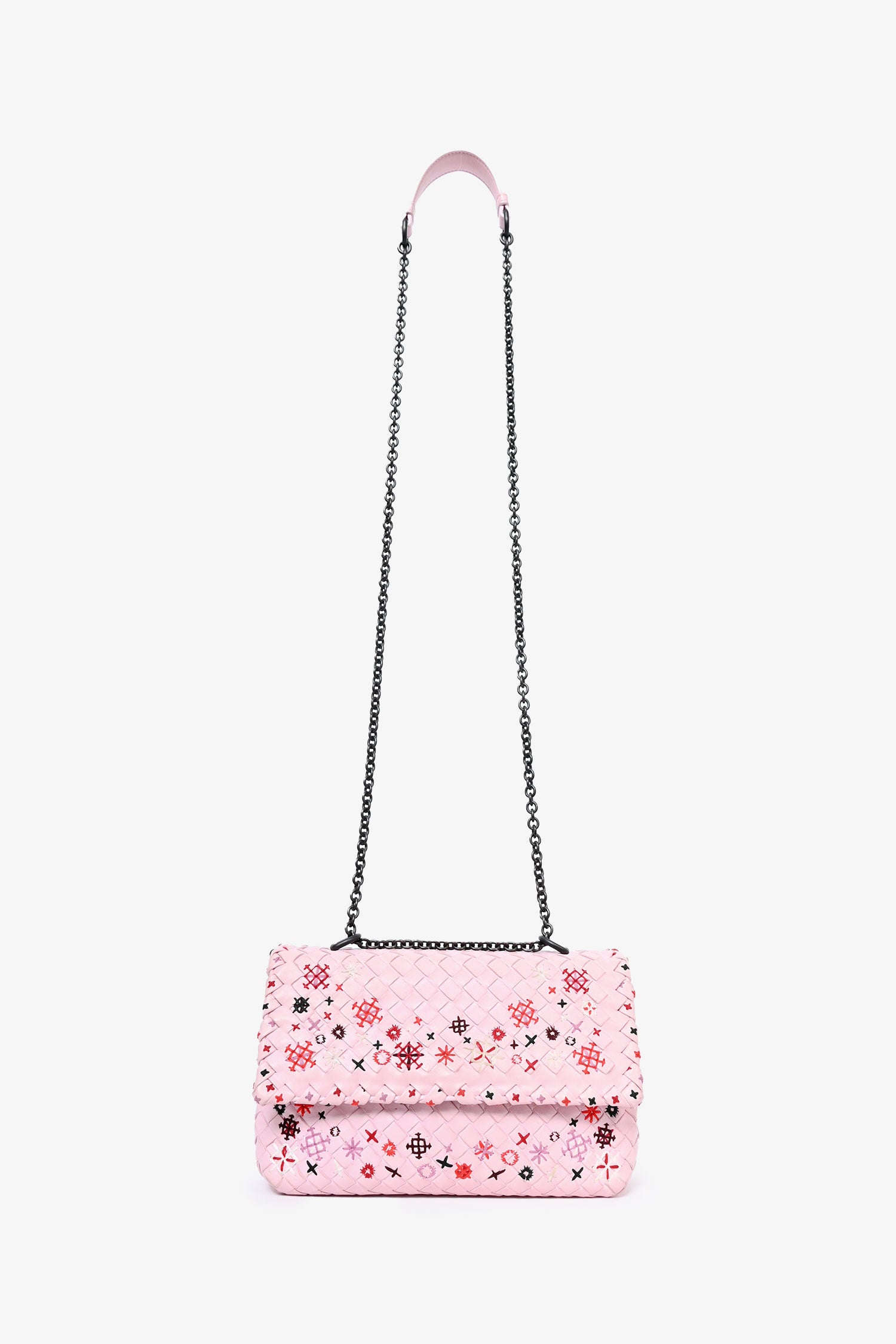 Bottega Veneta 2018 Resort Pink Leather Embroidered Crossbody. Antiqued black-tone hardware. Intrecciato weaving. Fold-over flap with snap closure. Suede lined interior. 3 interior compartments. Chain-link crossbody strap.