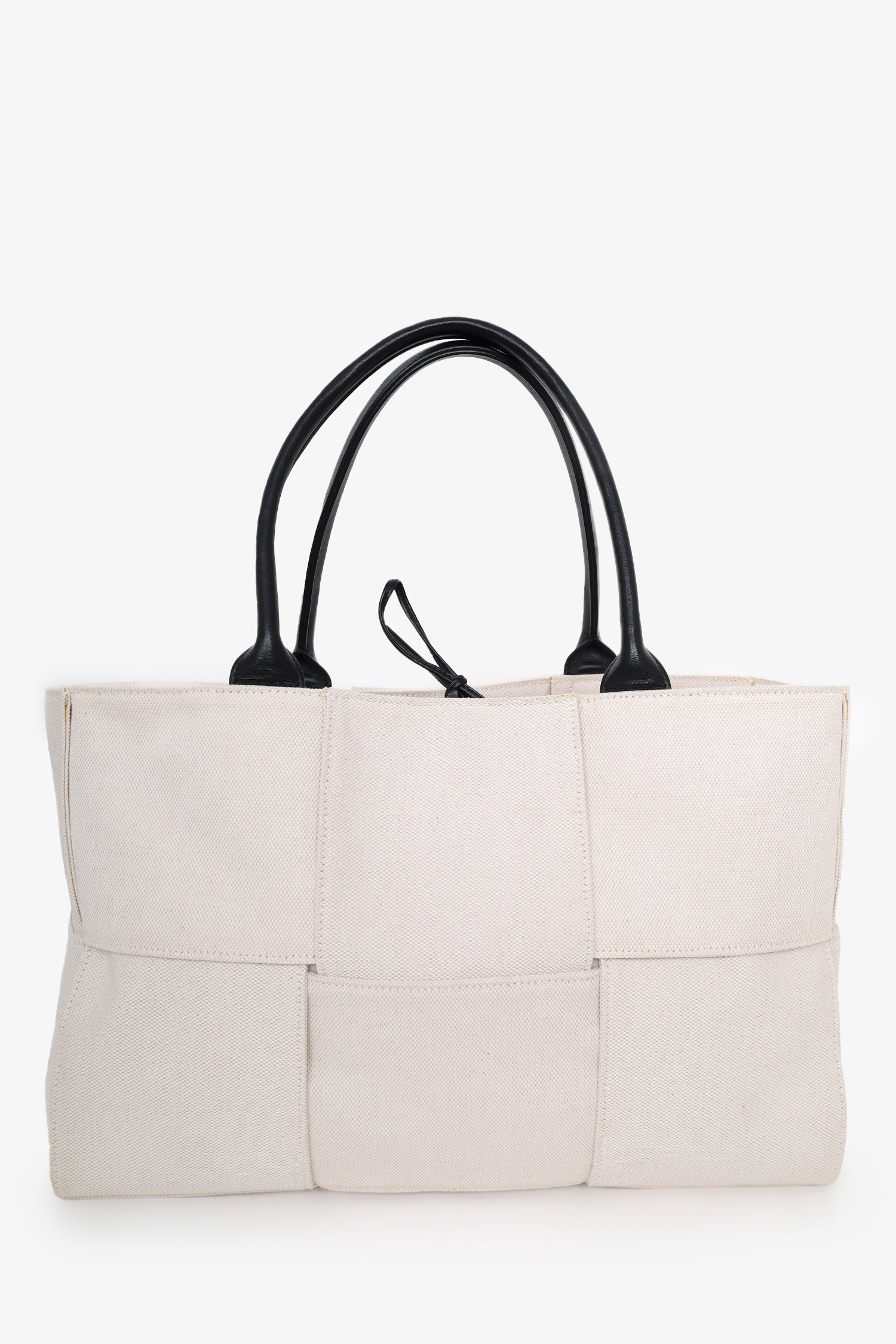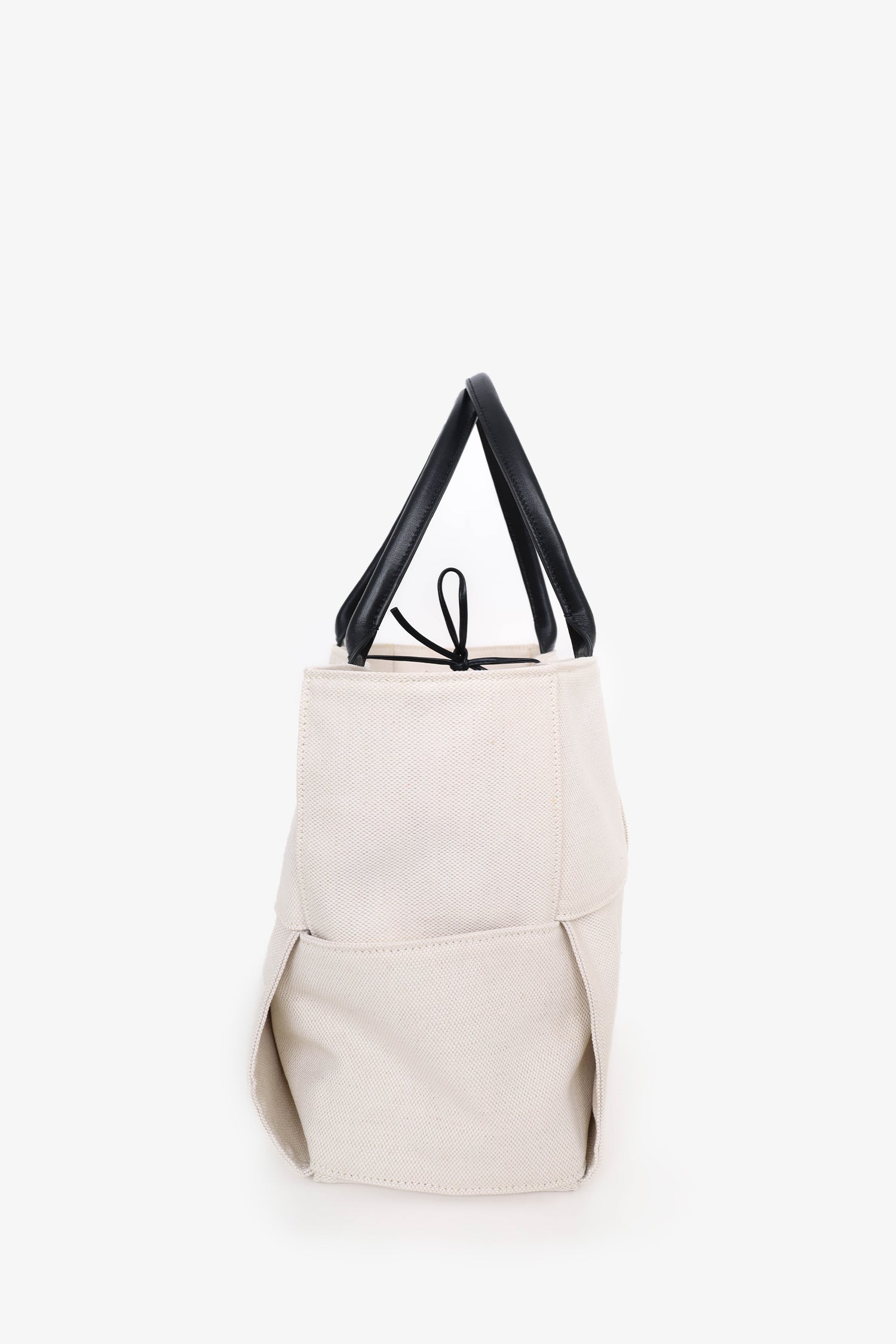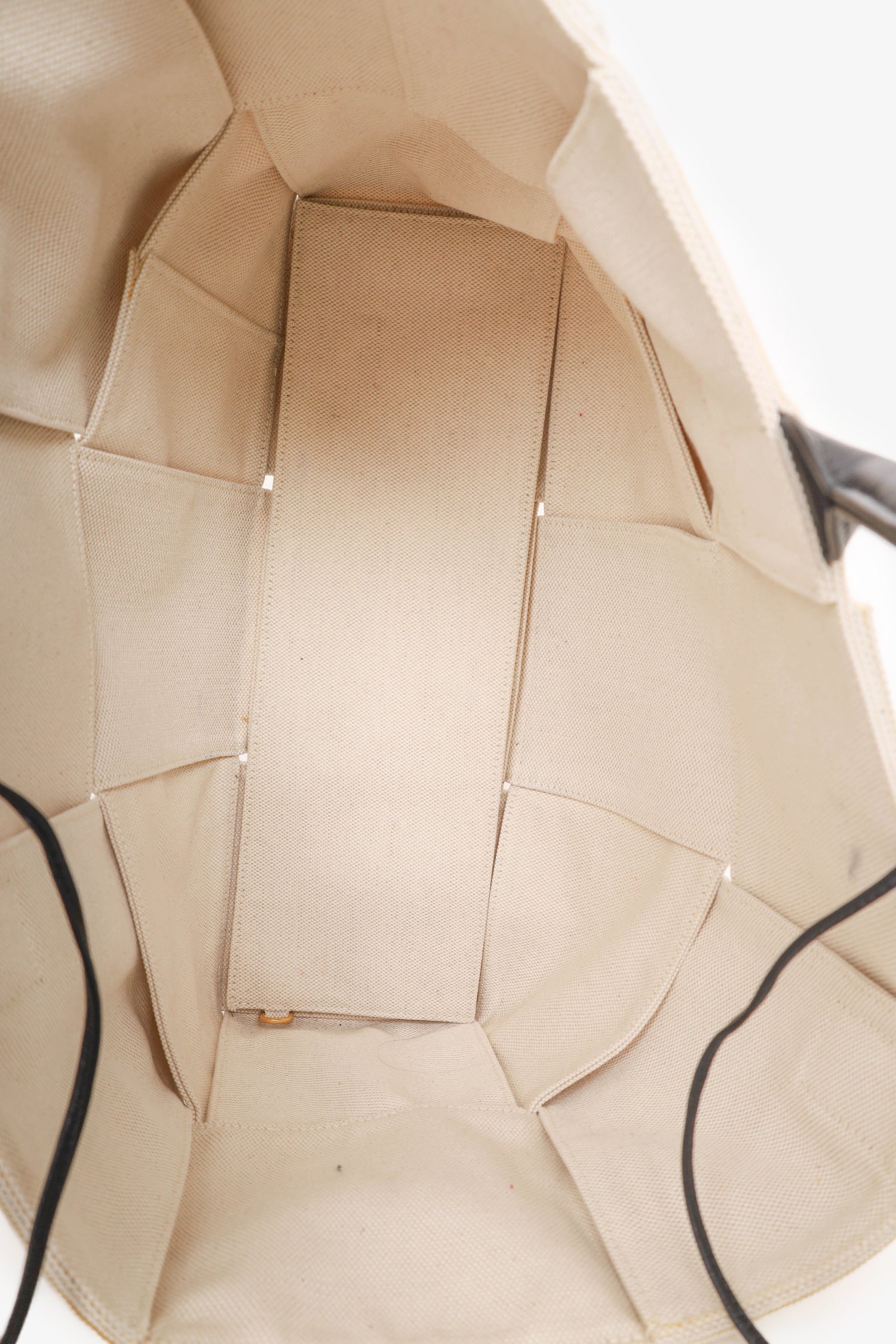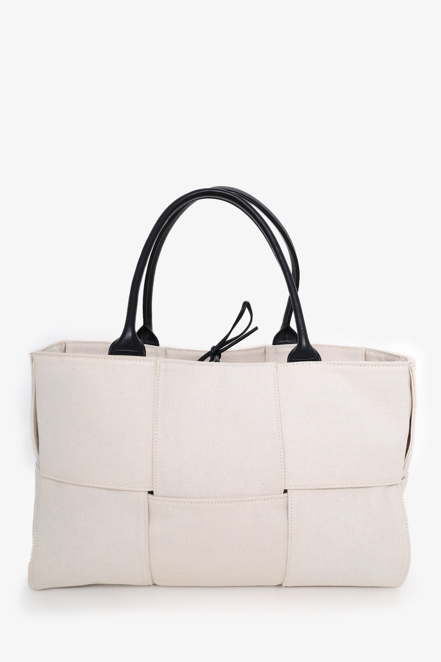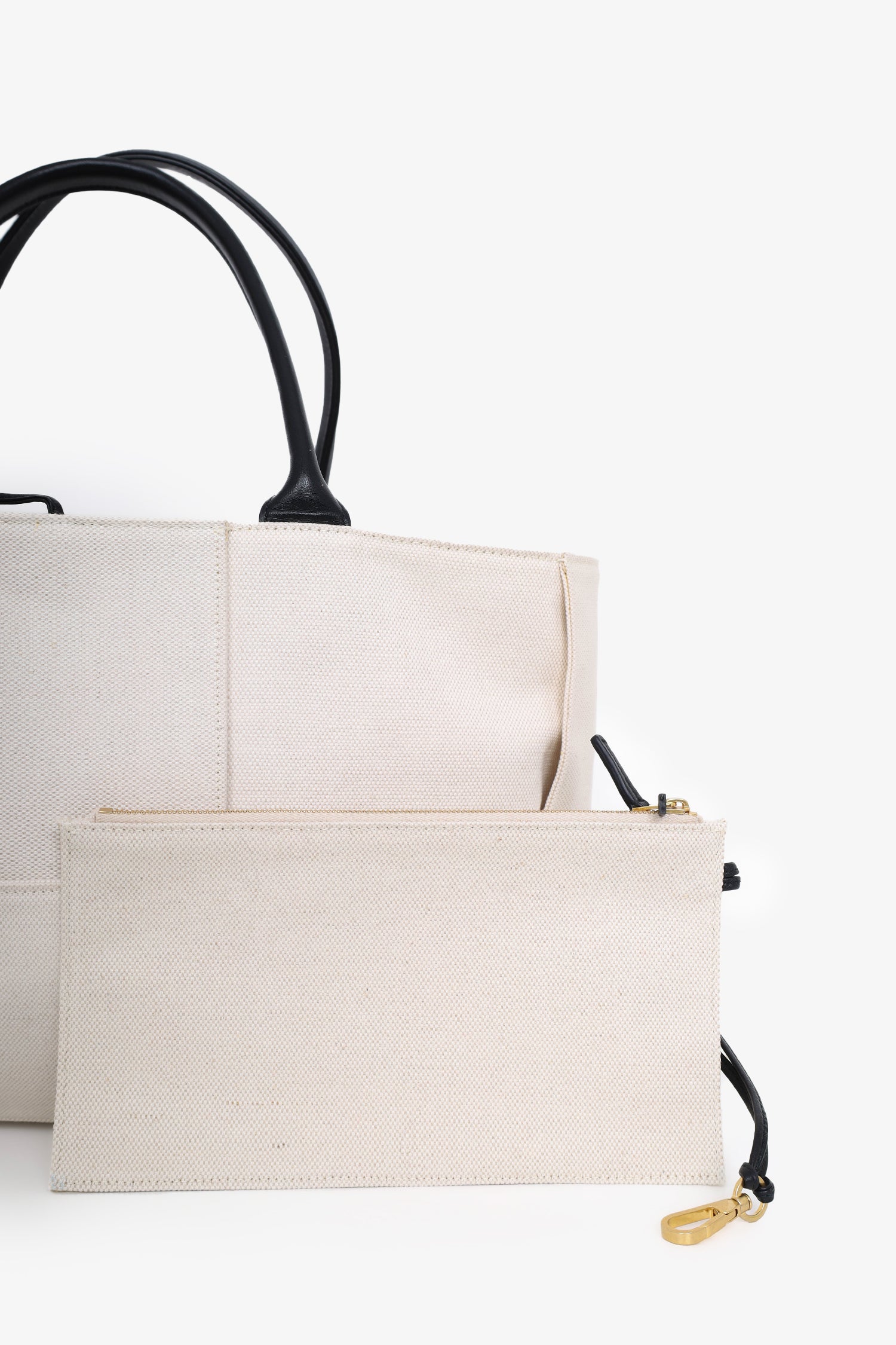 Refresh availabilityBottega Veneta Beige/Black Canvas/Leather Acro Tote Bag with Pouch. Top handle. Top tie closure. Open interior. Removable pouch with zip closure. Tonal stitching. Gold-tone hardware.