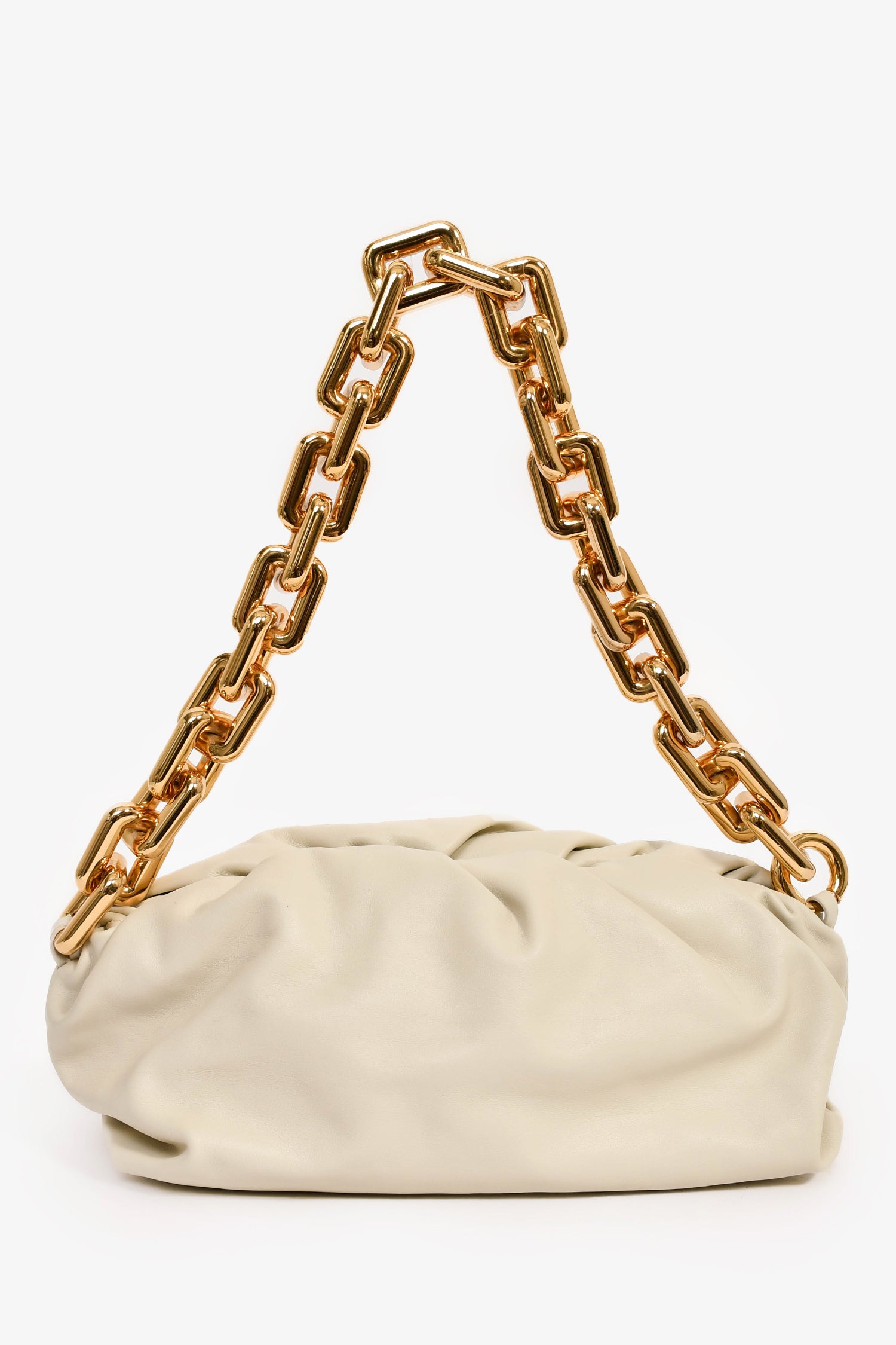 Refresh availabilityBottega Veneta Beige Chain Pouch Bag. Top magnetic closure. Chainlink shoulder strap. Single interior compartment. Leather-lined interior. Gold-tone hardware. Tonal stitching.