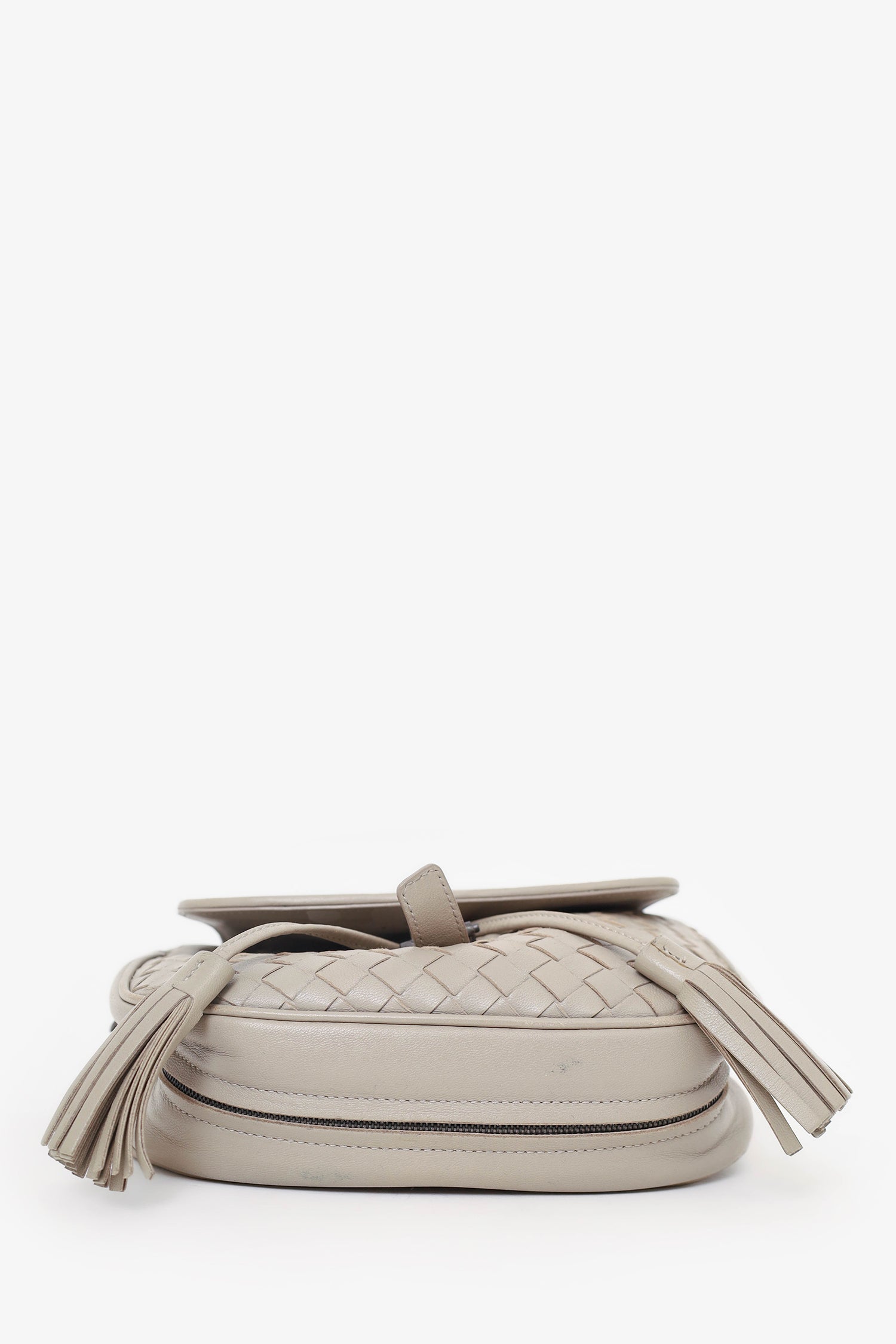 Refresh availabilityBottega Veneta Beige Intrecciato Leather Tassel Flap Waist Bag. Front fold-over flap with push lock closure. Bottom exterior zip closure compartment. Adjustable crossbody strap. Open suede interior. Dark-tone hardware. Tonal stitching.