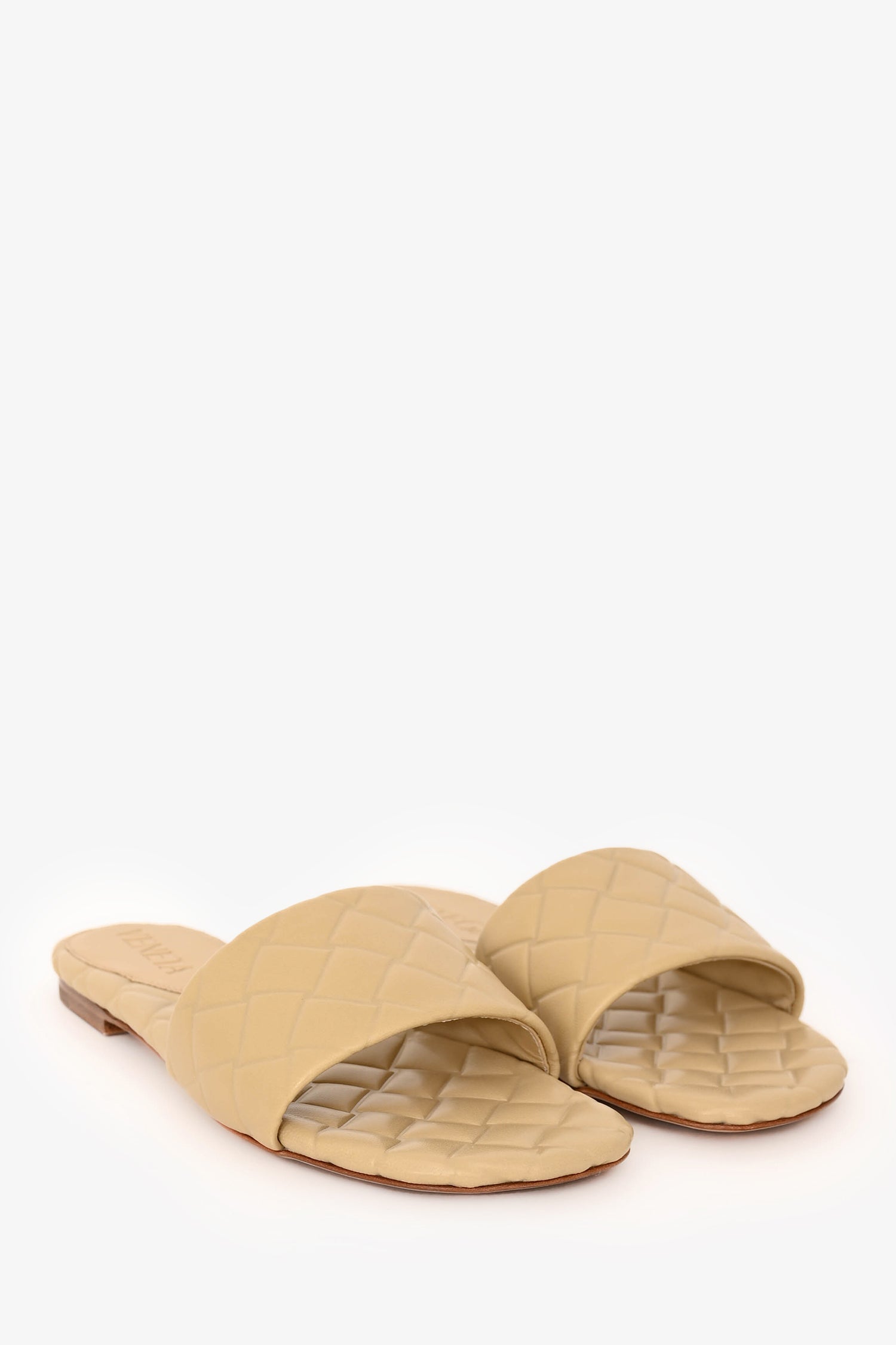 Refresh availabilityBottega Veneta Beige Leather Amy Sandals. Slip-on. Open square toe. Wide woven leather upper strap. Leather lining and insole. Tonal stitching.