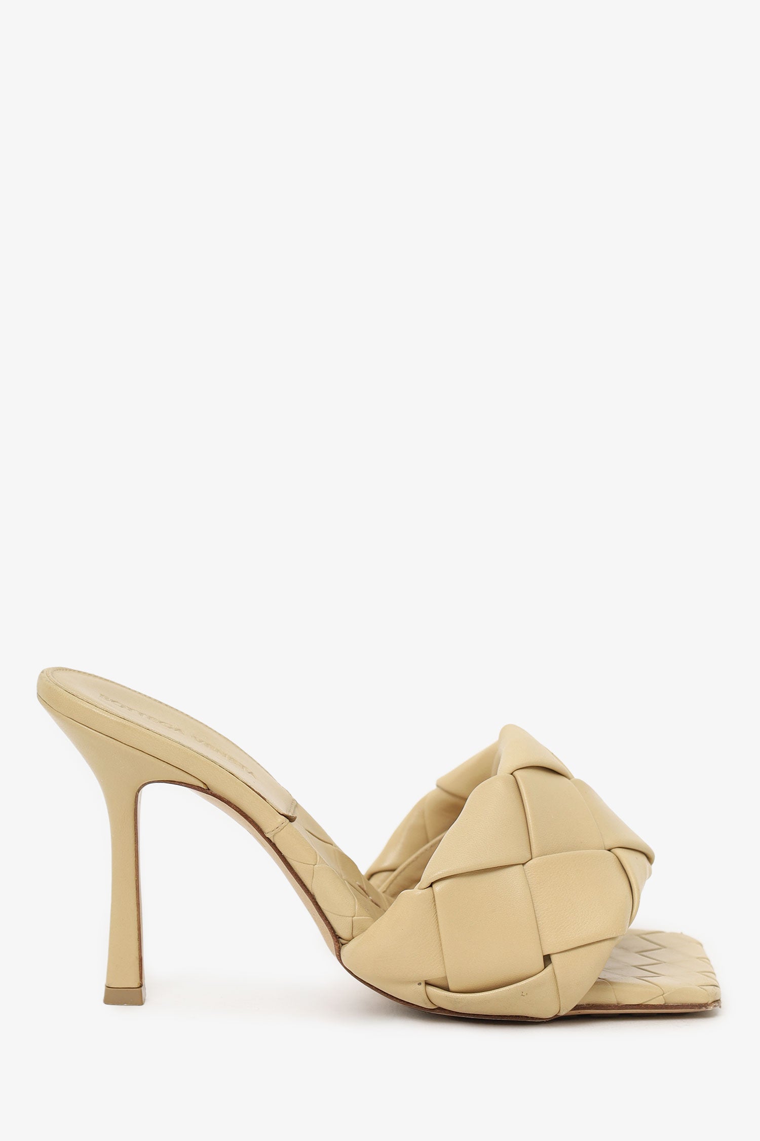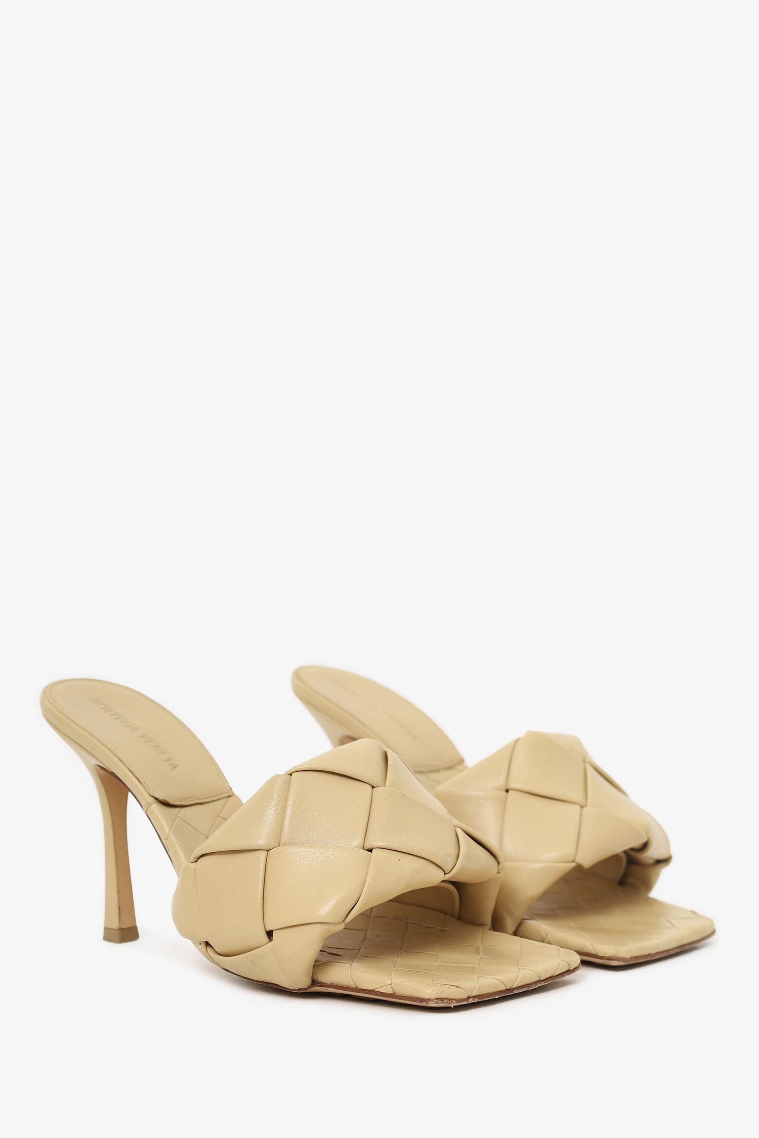 Refresh availabilityBottega Veneta Beige Padded Intrecciato Heeled Sandal. Slip-on. Square-toe. Padded braided vamp. Tonal stitching.