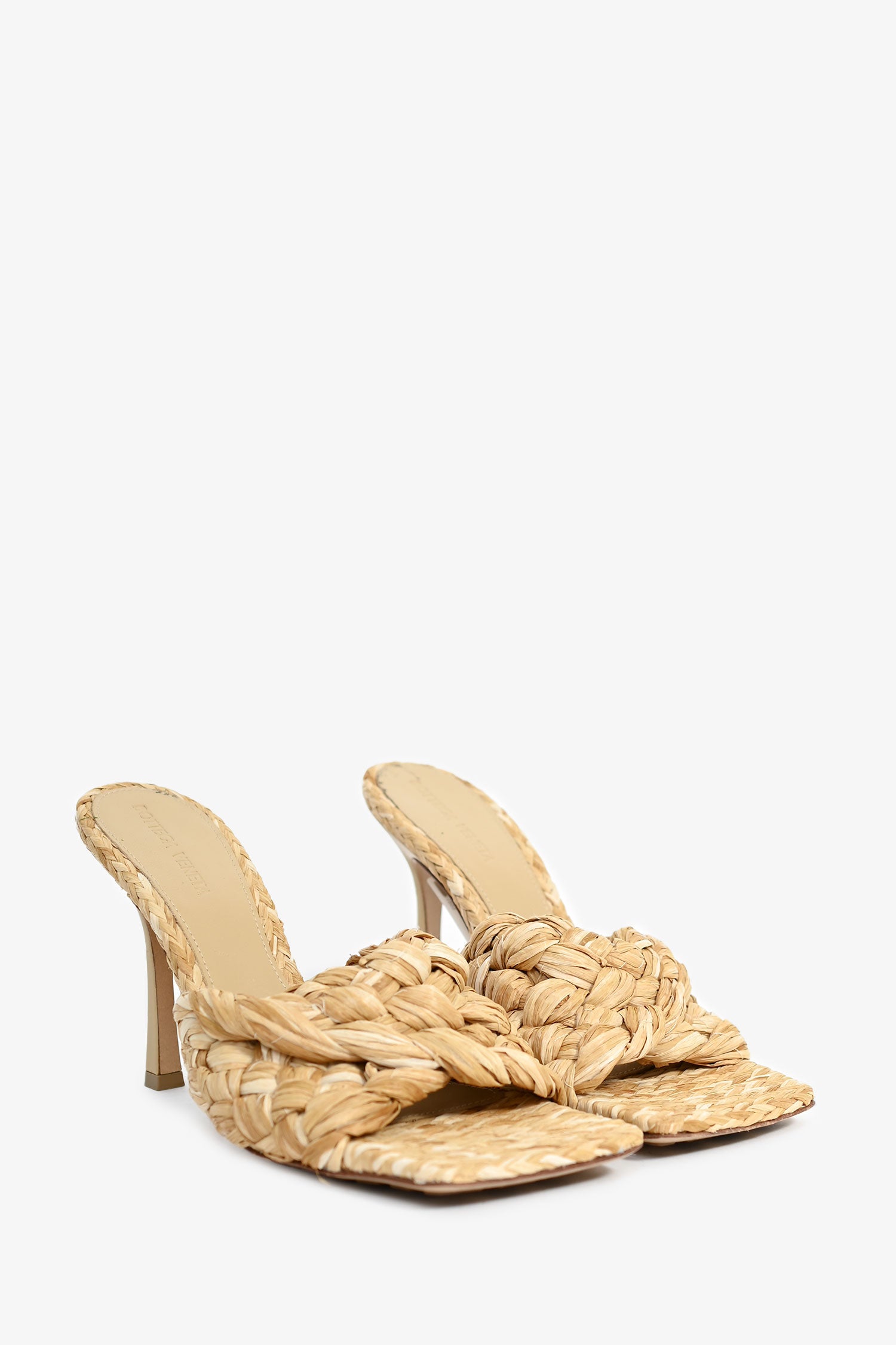 Refresh availabilityBottega Veneta Beige Raffia Stretch Heeled Mules. Open, square toe. Raffia exterior. Lined leather insole. Stiletto heel.