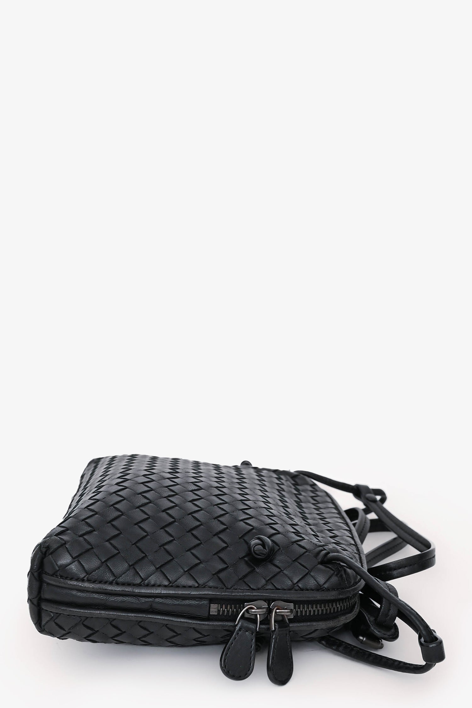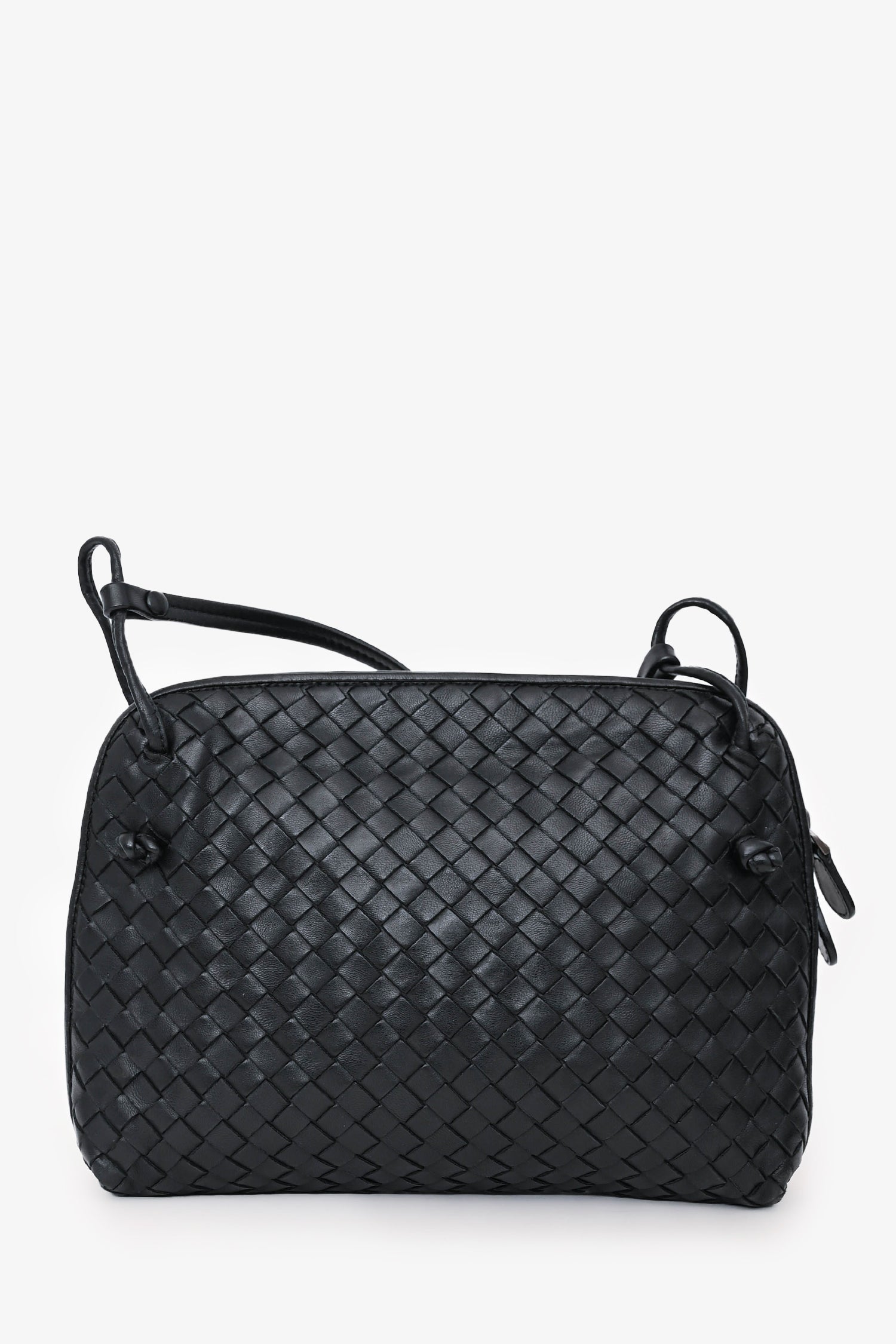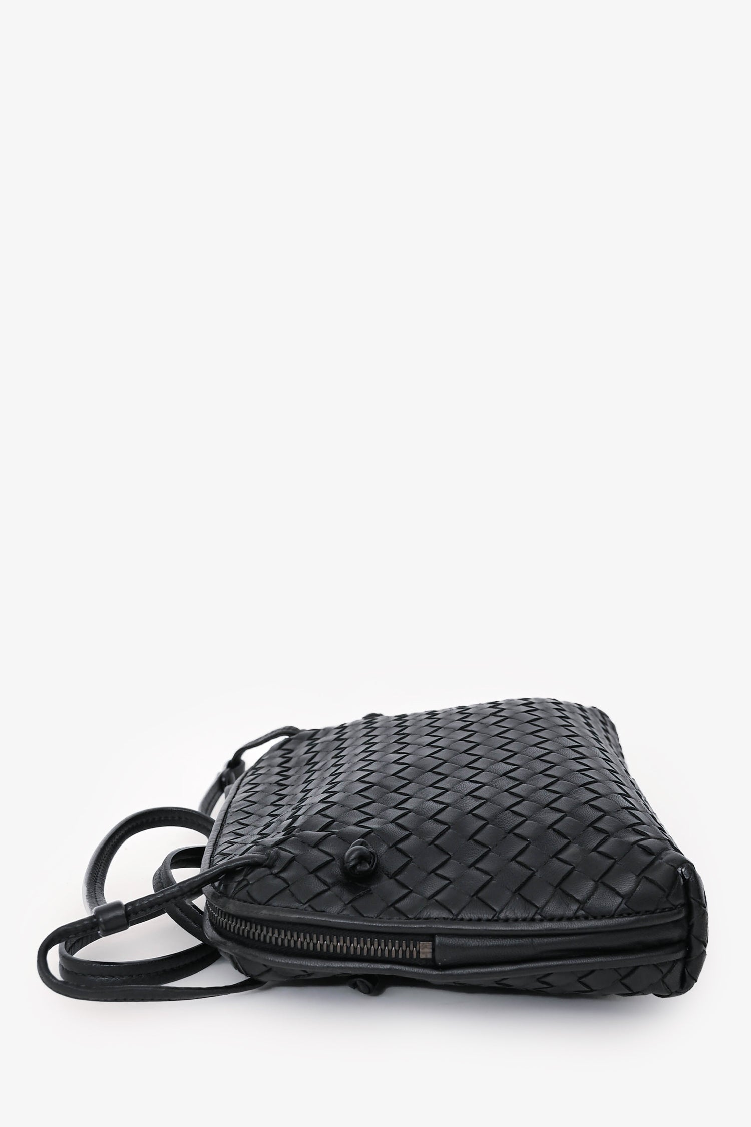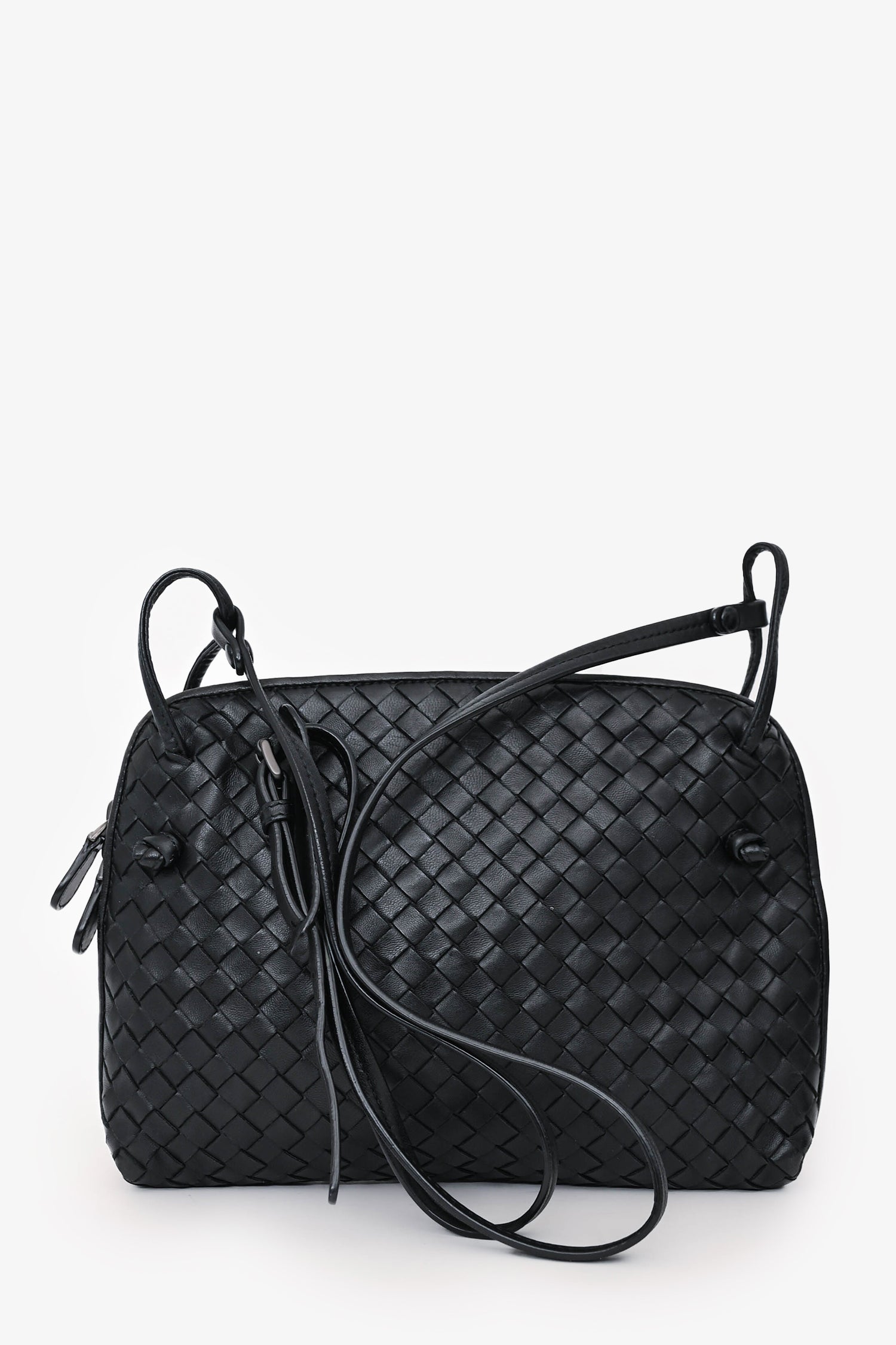 Refresh availabilityBottega Veneta Black Intrecciato Leather Crossbody. Top zip closure. Adjustable leather crossbody strap. 1 interior zip pocket; 1 interior slip pocket. Suede interior. Silver-tone hardware. Tonal stitching.