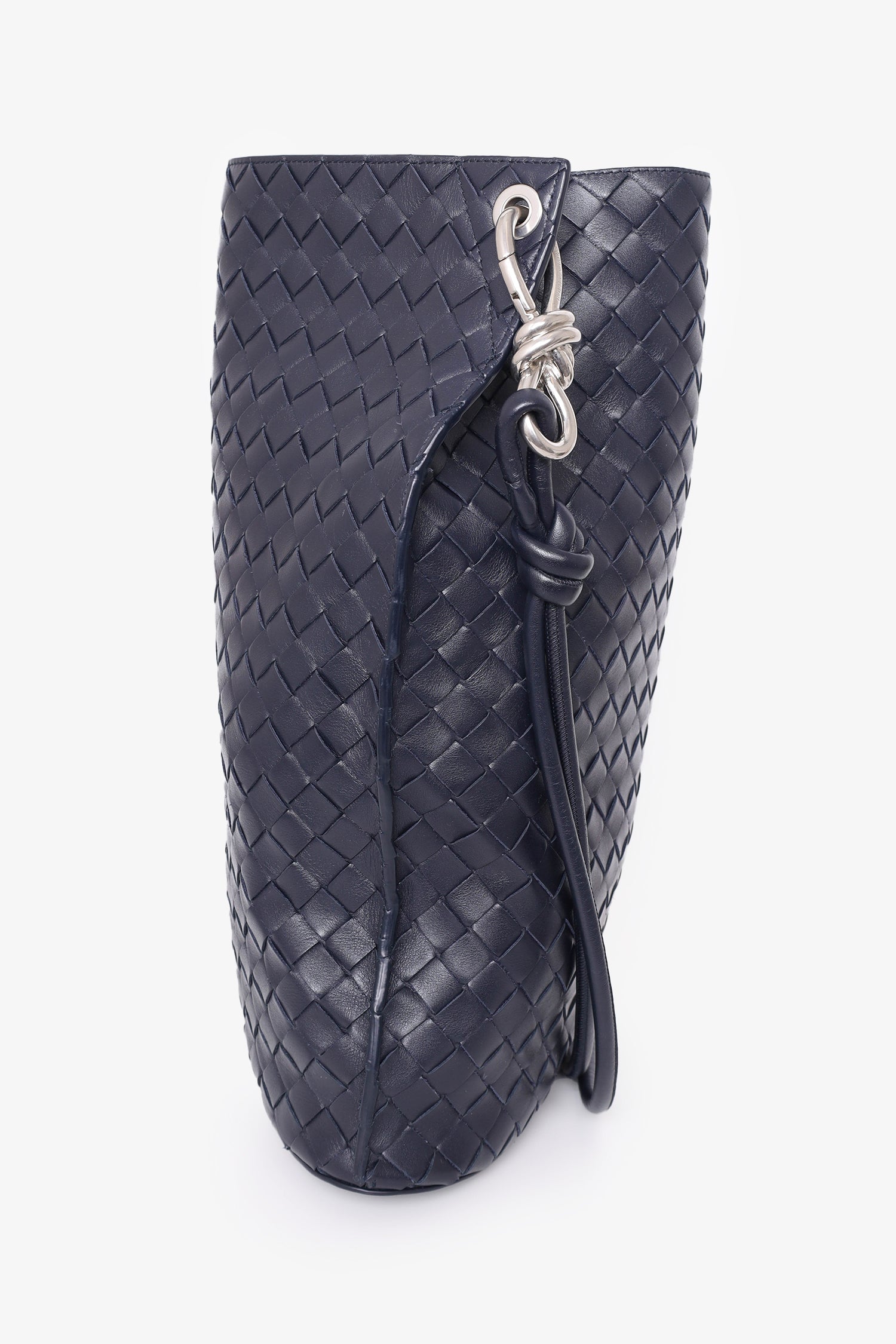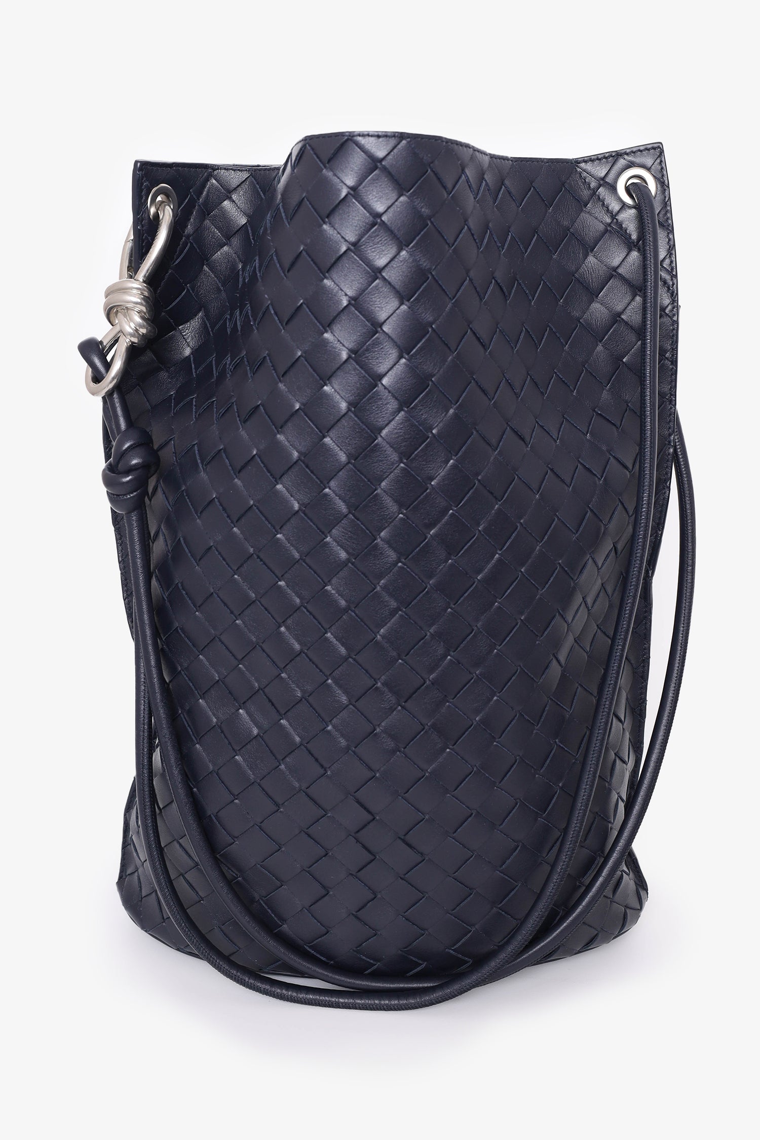Refresh availabilityBottega Veneta Black Leather Medium Knot Bucket Bag. Shoulder/crossbody strap with hook knot. Open top. Open suede interior with single wall slip pocket. Tonal stitching. Silver-tone hardware.