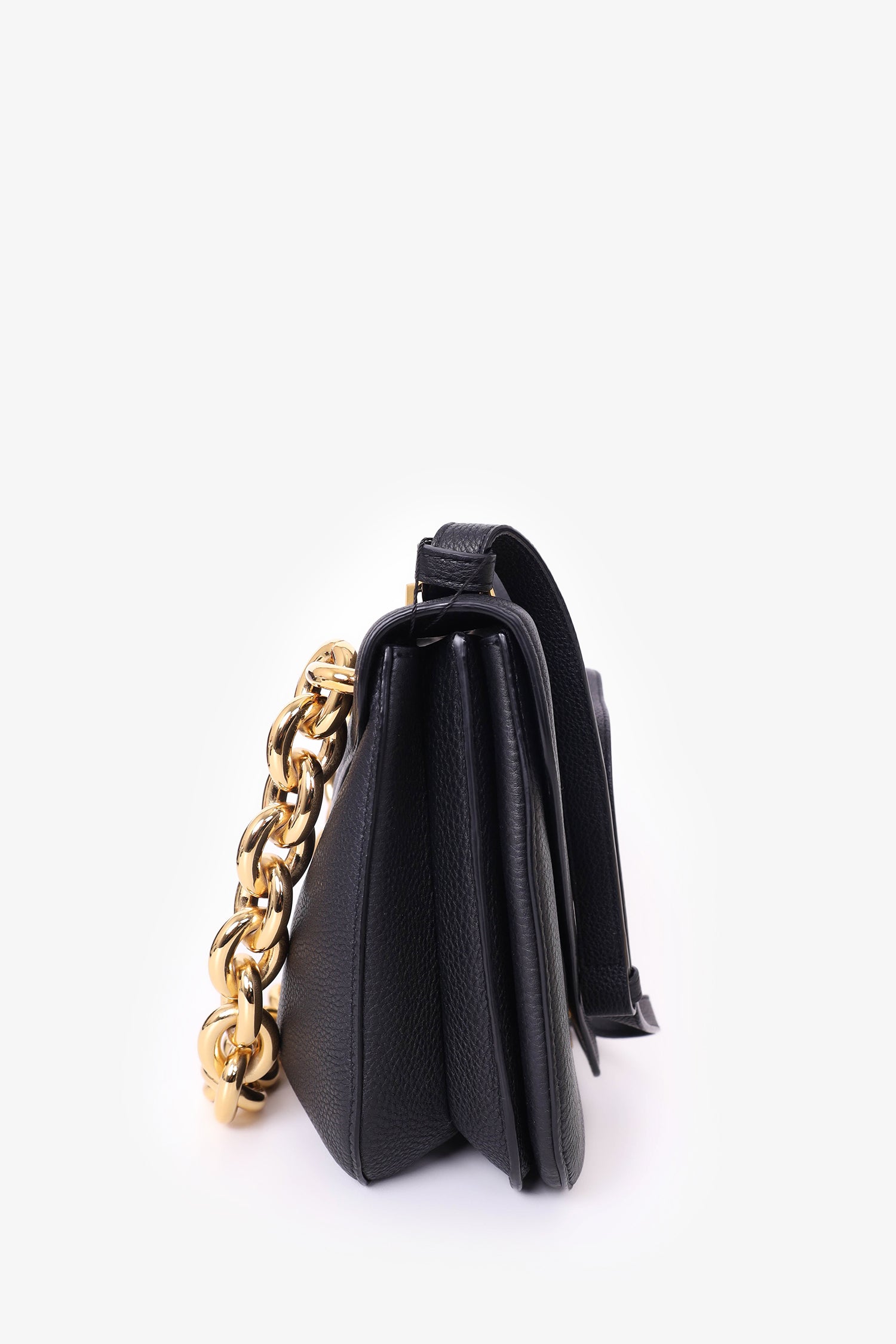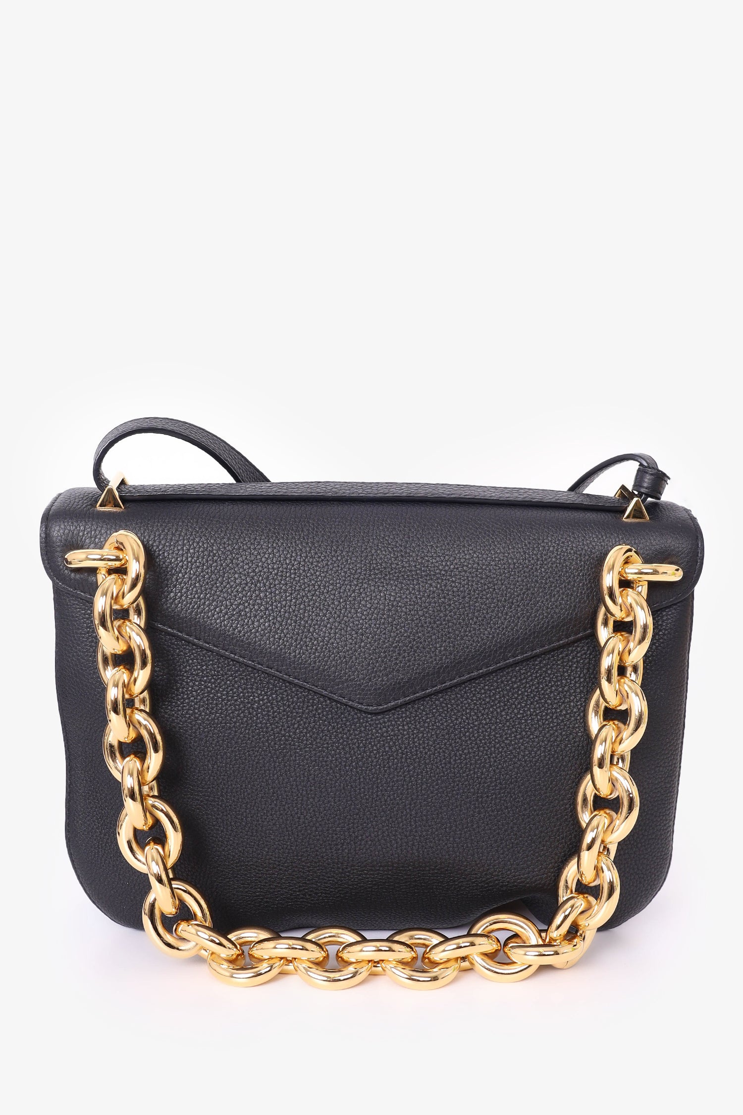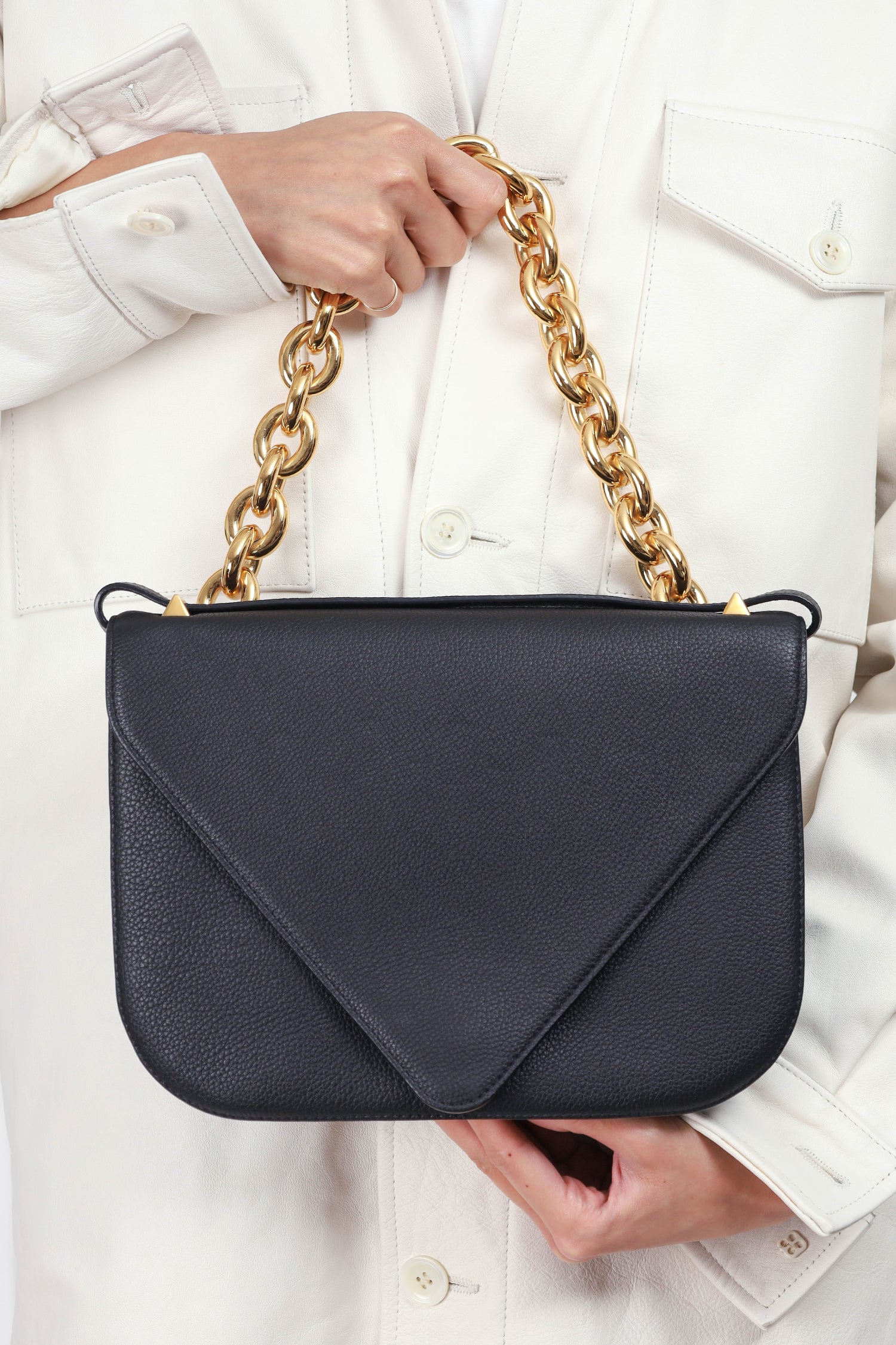 Refresh availabilityBottega Veneta Black Leather Mount Envelope Shoulder Bag. Front fold-over flap with hook closure. 2 interior sections. Single wall slip pocket. Adjustable crossbody strap. Gold-tone chain shoulder strap. Tonal stitching.