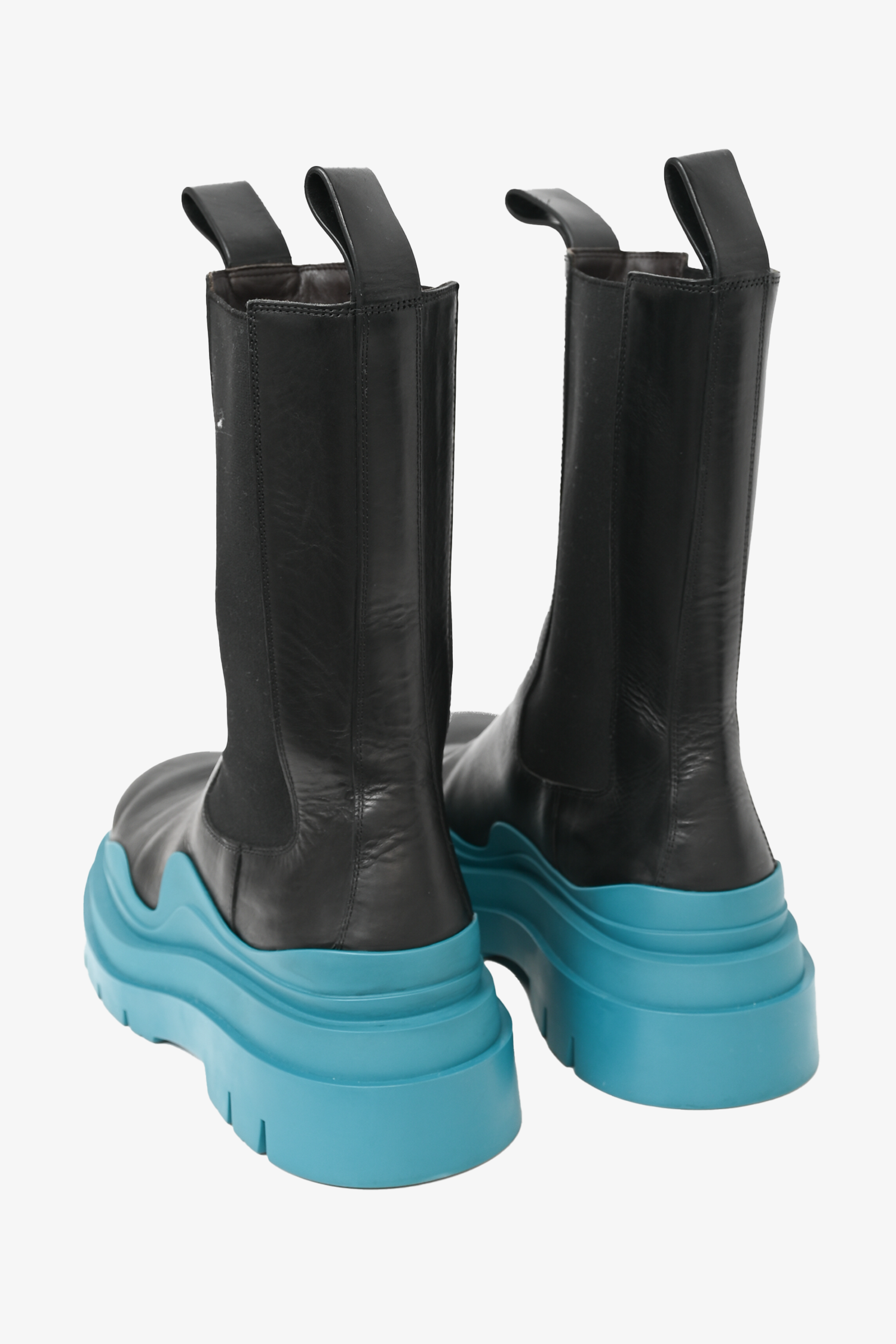 Refresh availabilityBottega Veneta Black/Teal Leather Tire Boots. Pull-on design with back leather pull tabs. Chunky sole. Tonal stitching.