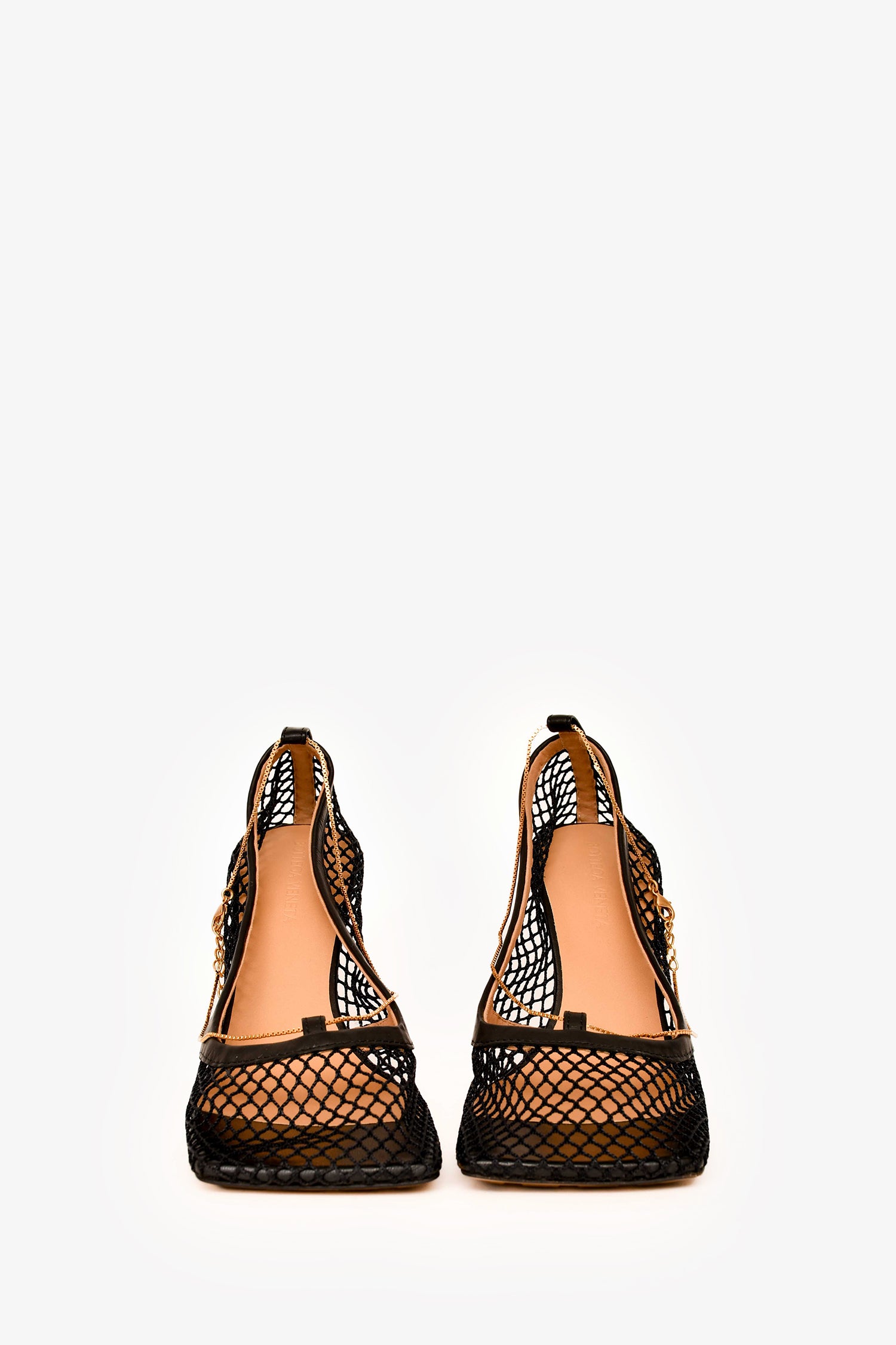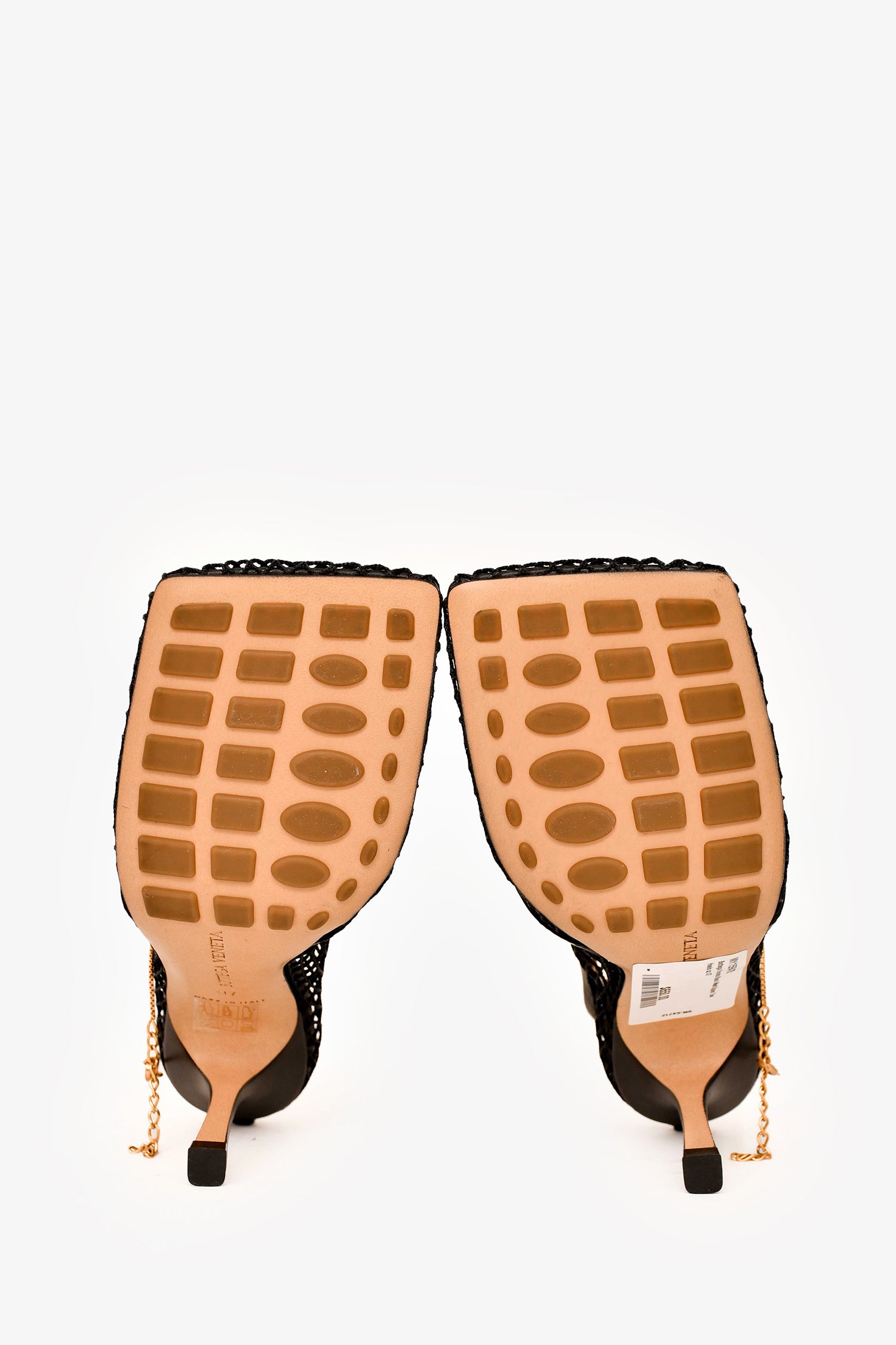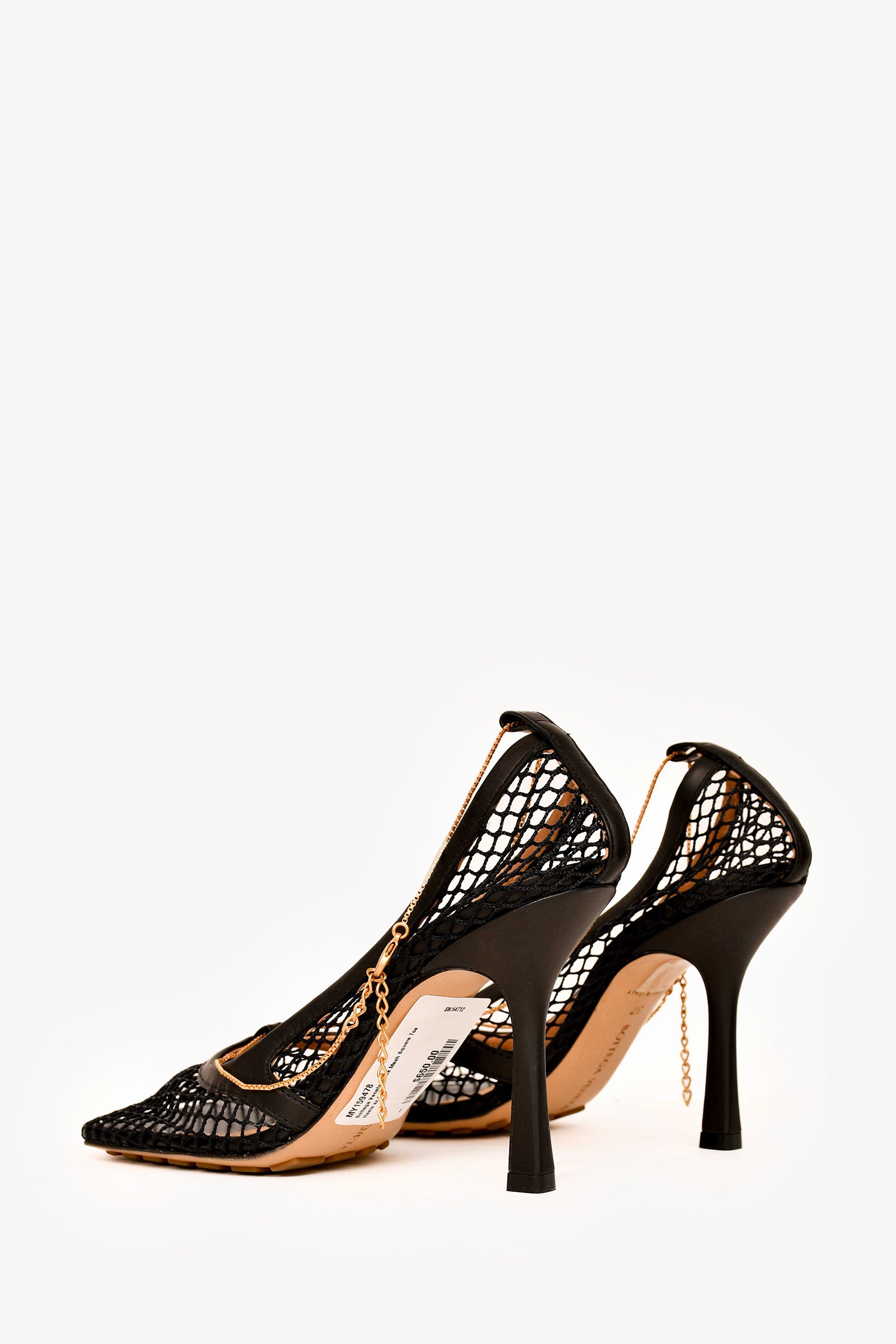 Refresh availabilityBottega Veneta Black Mesh Square Toe Heels. Mesh exterior with leather trimming. Leather insole. Gold-tone chain-link with a lobster clasp closure. Tonal stitching.