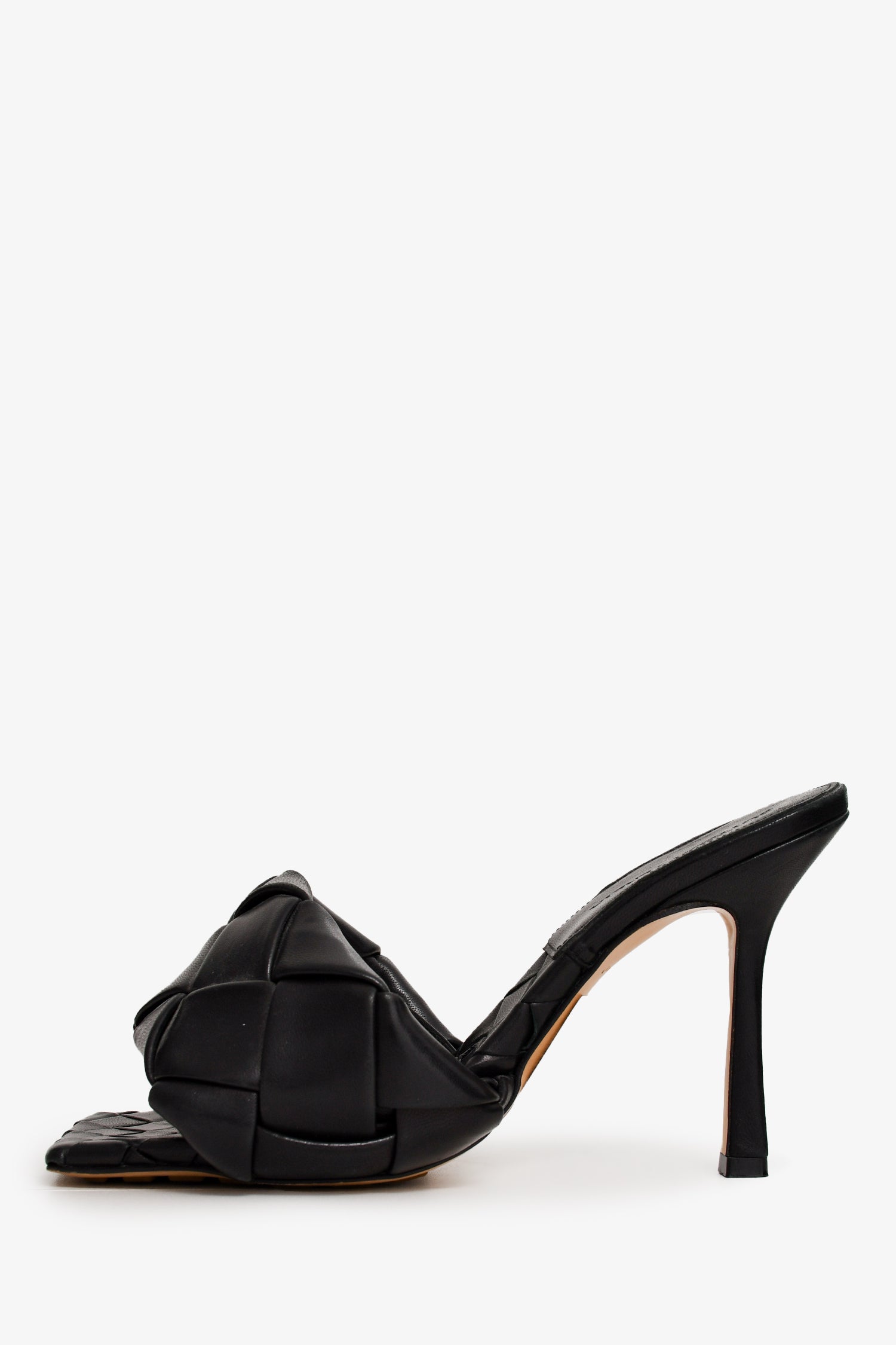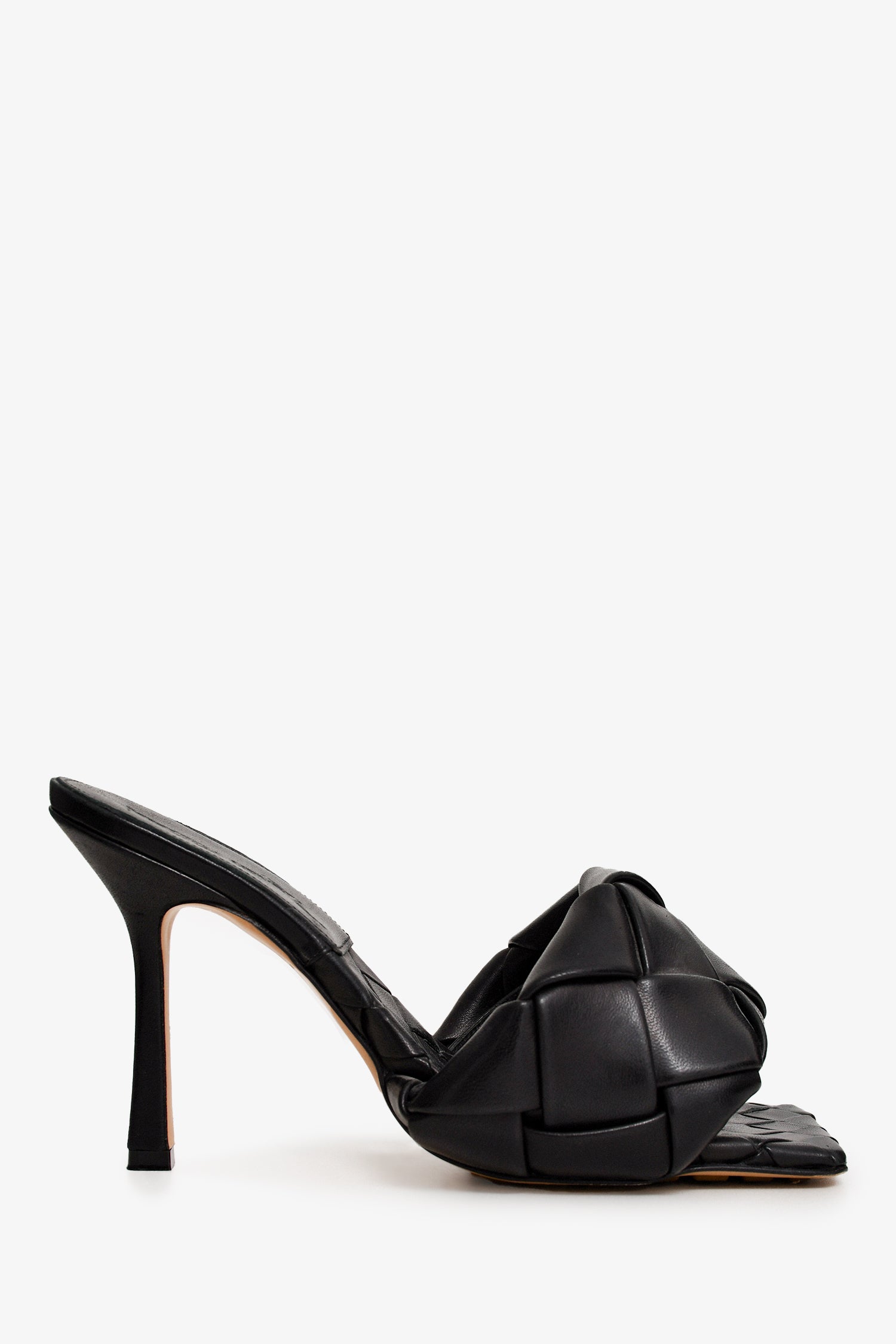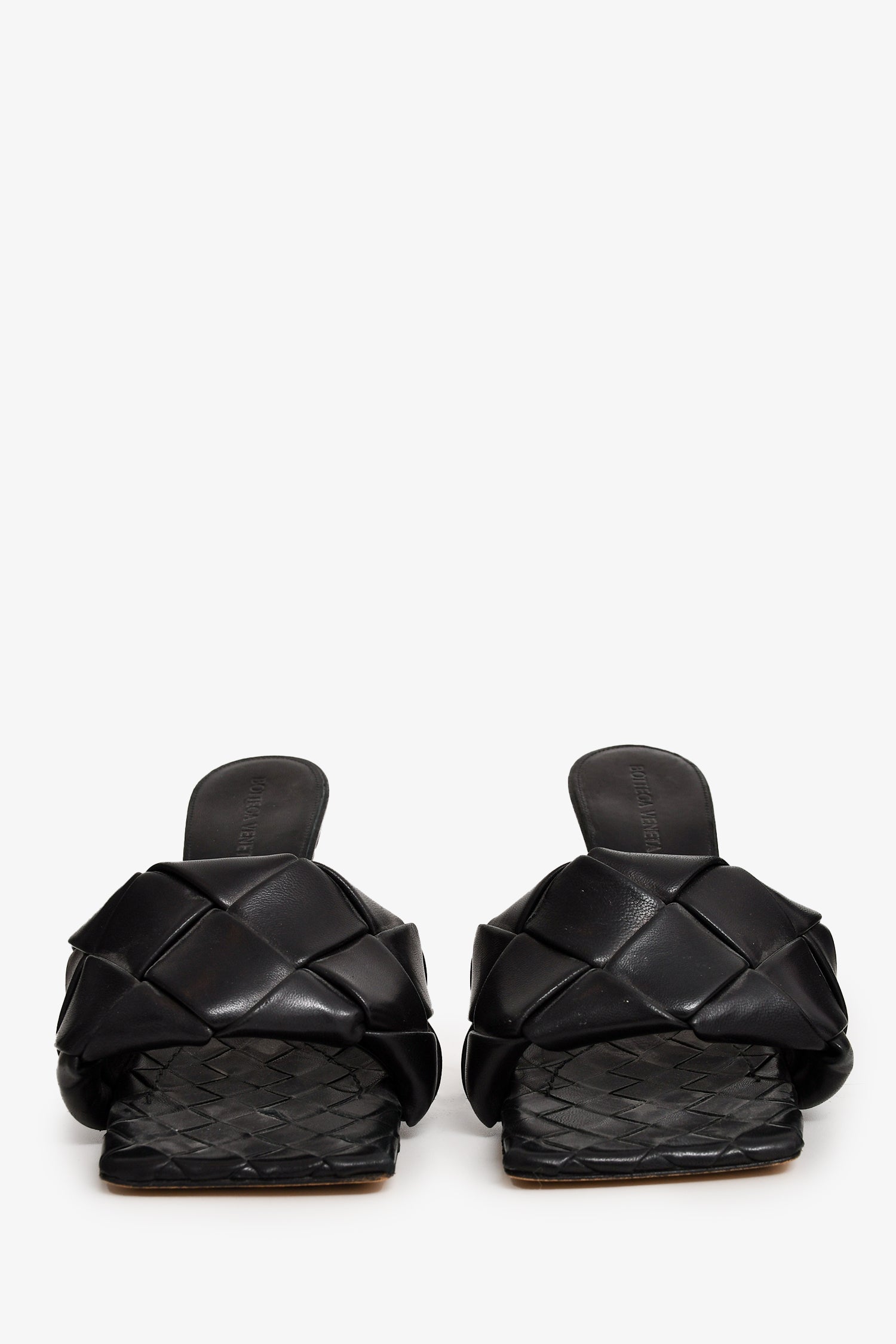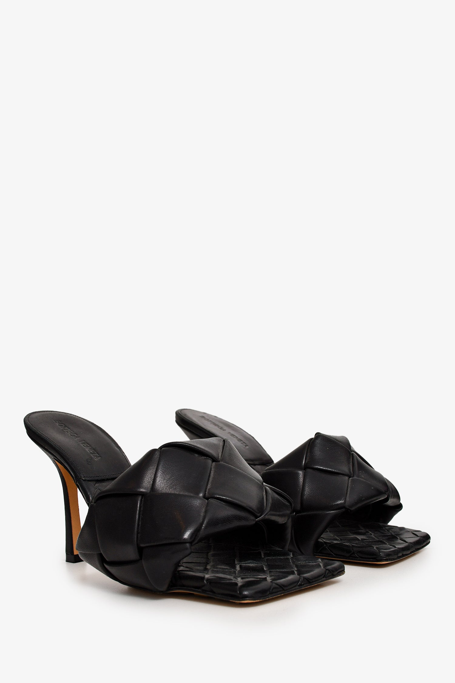 Refresh availabilityBottega Veneta Black Padded Intrecciato Heeled Sandal. Square open toe. Tonal stitching.