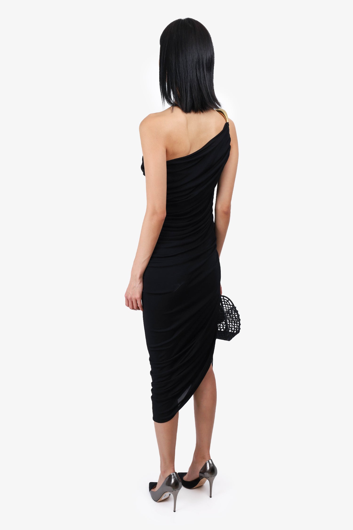 Refresh availabilityBottega Veneta Black Ruched Midi Dress. Pull-on. Gold-tone hardware. Unlined. Tonal stitching.