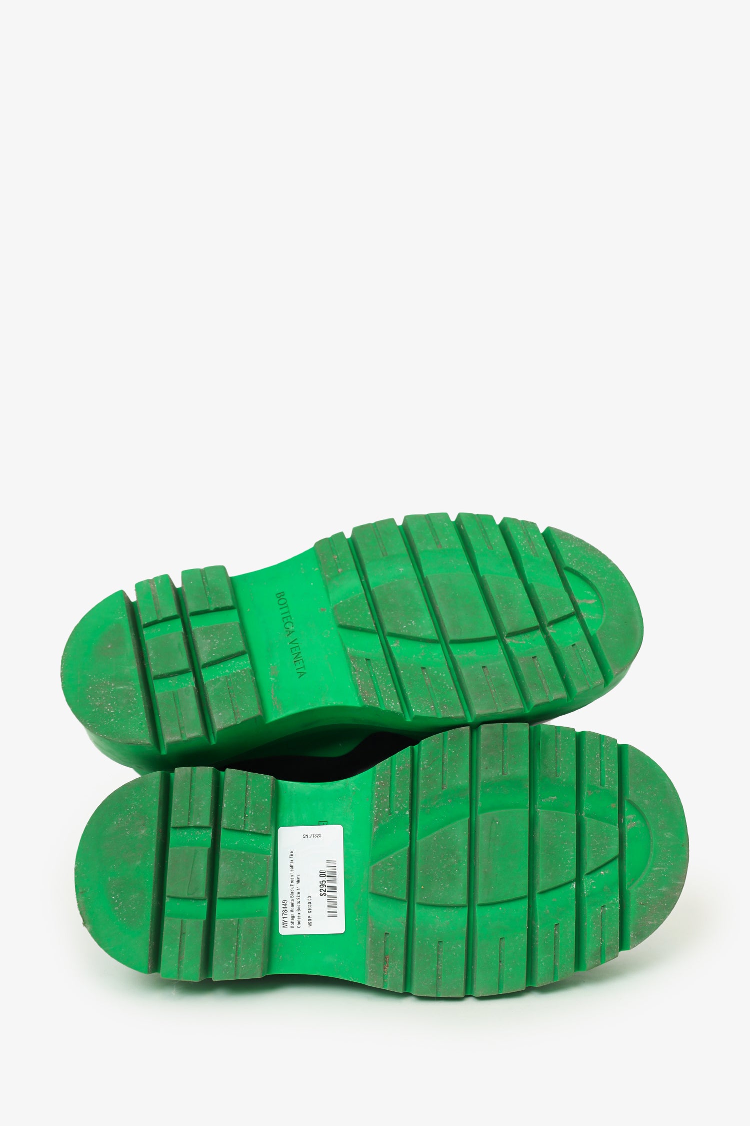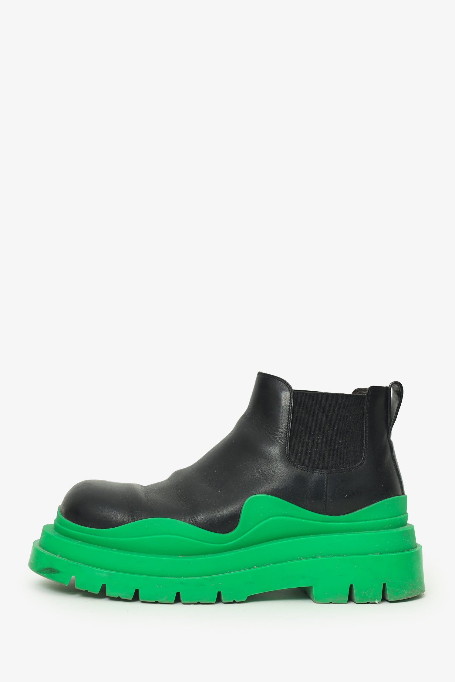Refresh availabilityBottega Veneta Black/Green Leather Tire Chelsea Boots. Pull-on. Round-toe. Rear pull tabs. Tonal stitching.