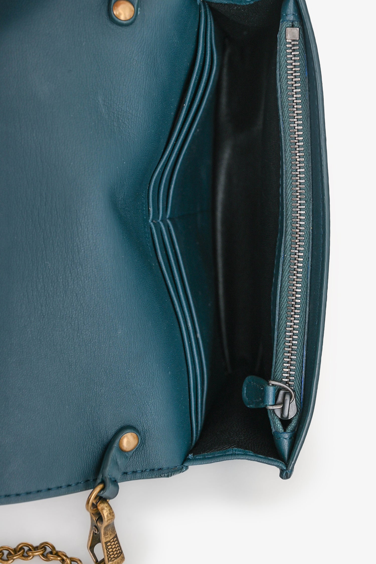 Refresh availabilityBottega Veneta Blue Intrecciato Flap Wallet on Chain. Front fold-over flap with snap-button closure. Six card slots. One zippered compartment. Exterior rear slip pocket. Gold-tone hardware. Detachable strap.