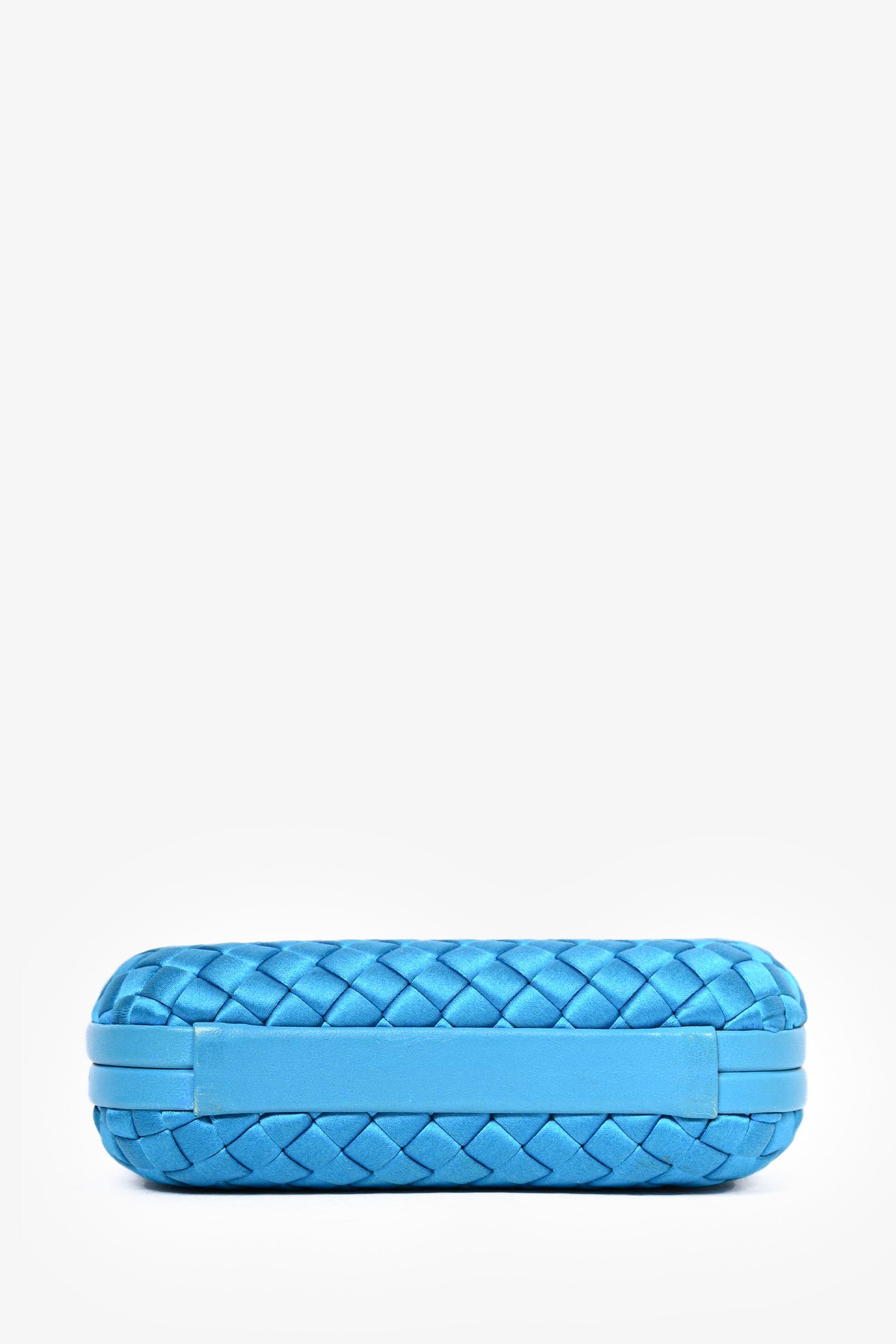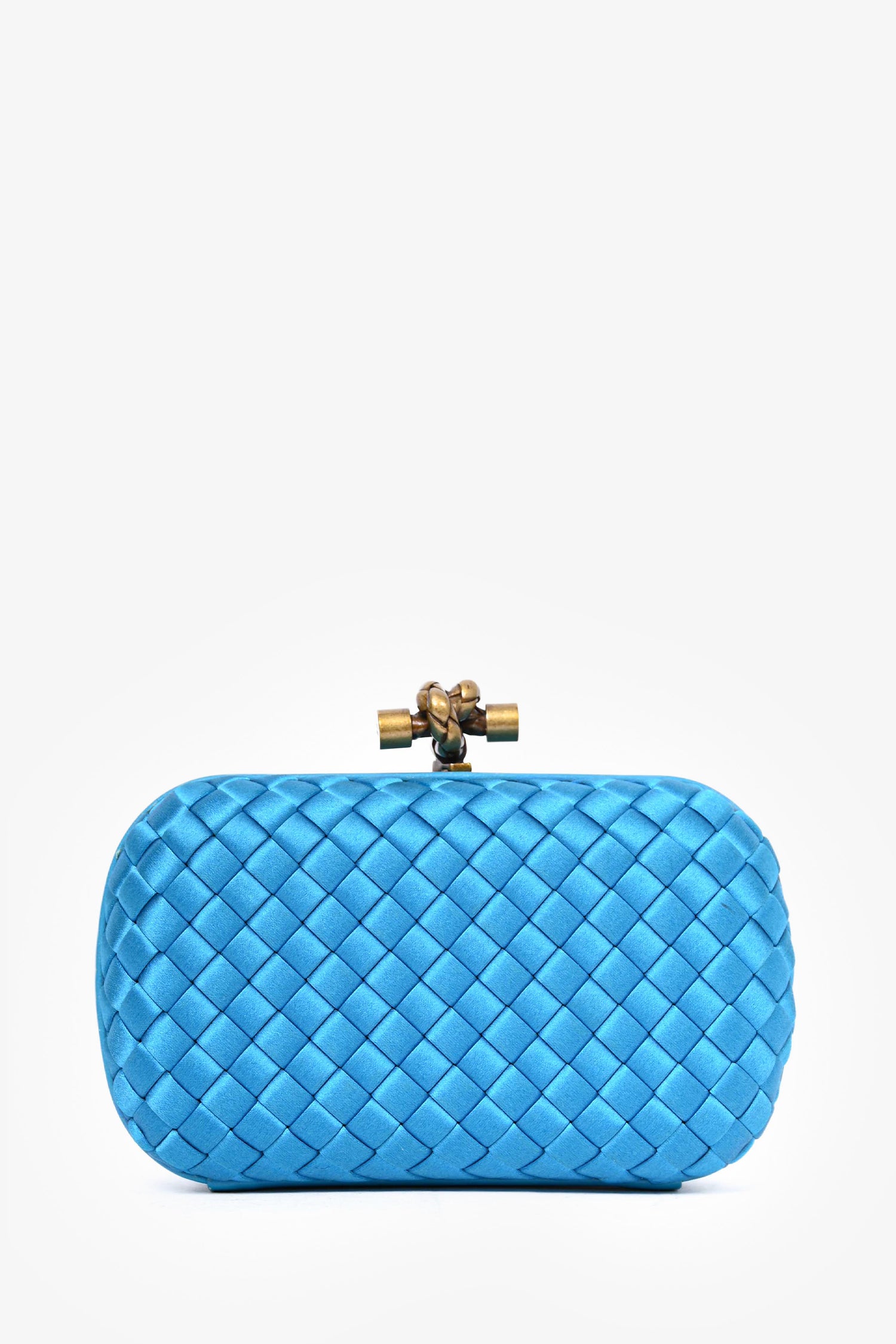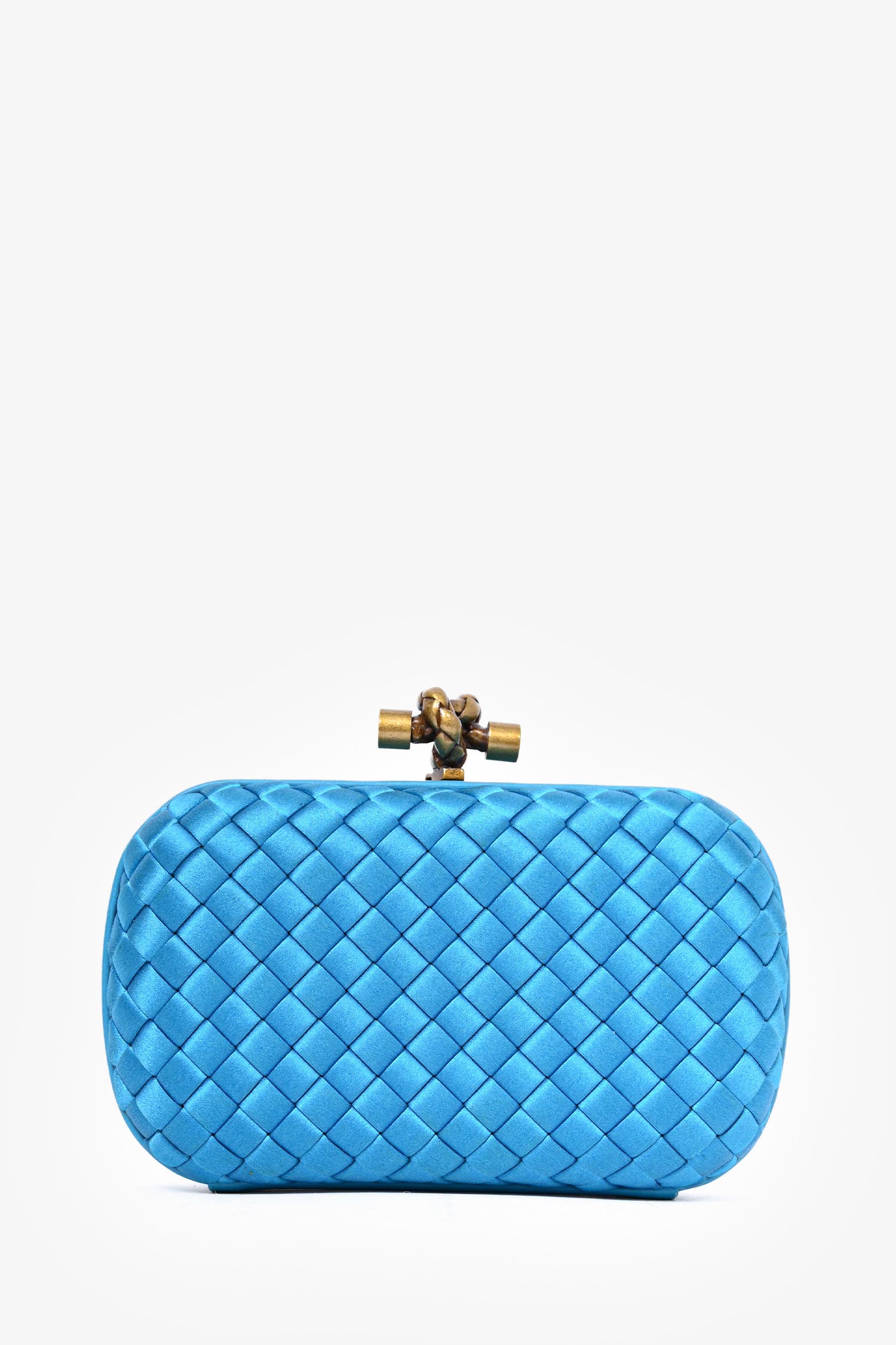 Bottega Veneta Blue Intrecciato Woven Satin Knot Clutch. Antiqued gold-tone knot flip closure. Satin exterior and lined interior. Intrecciato woven detailing. Leather trimming. Gold-foil Bottega Veneta logo stamp.