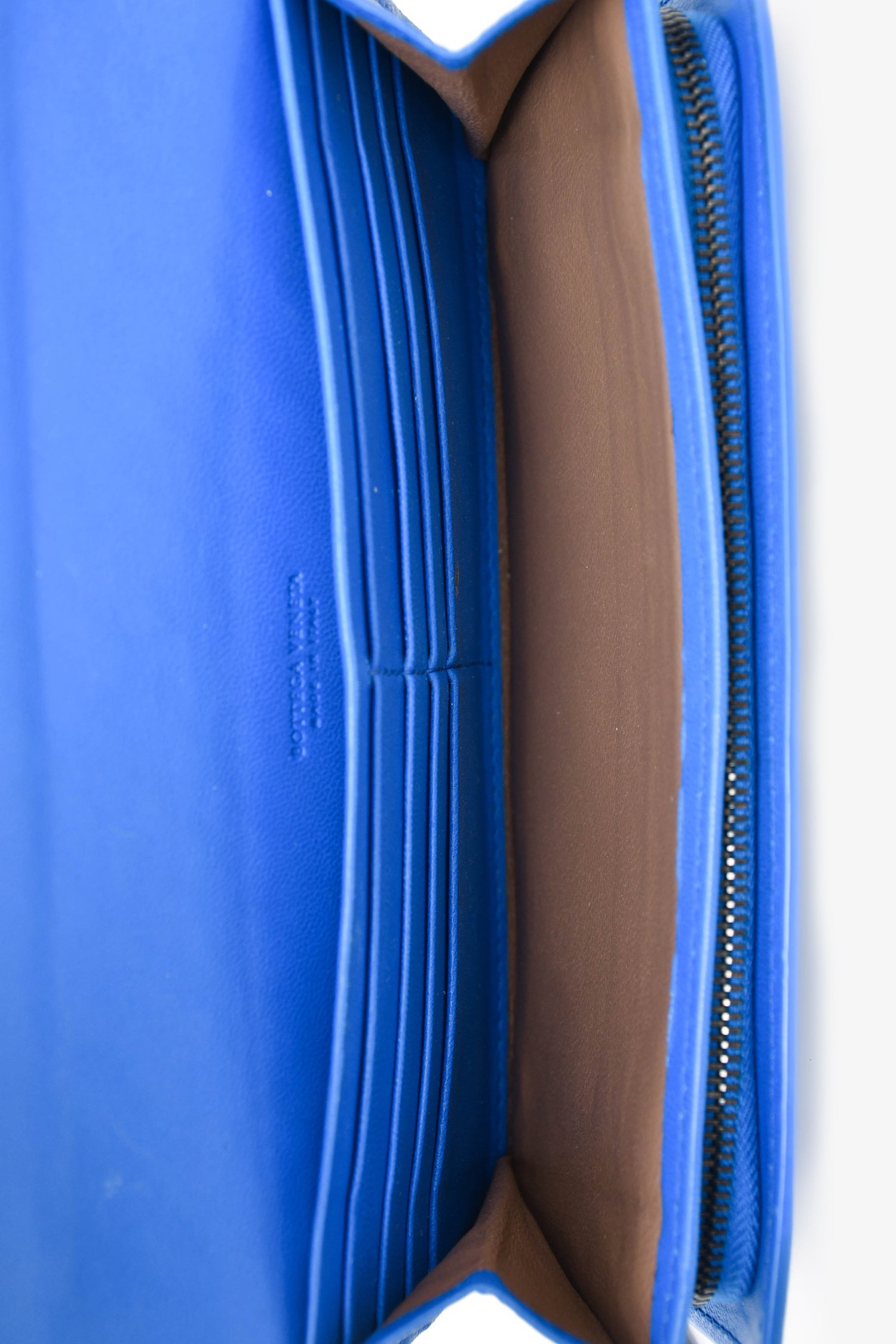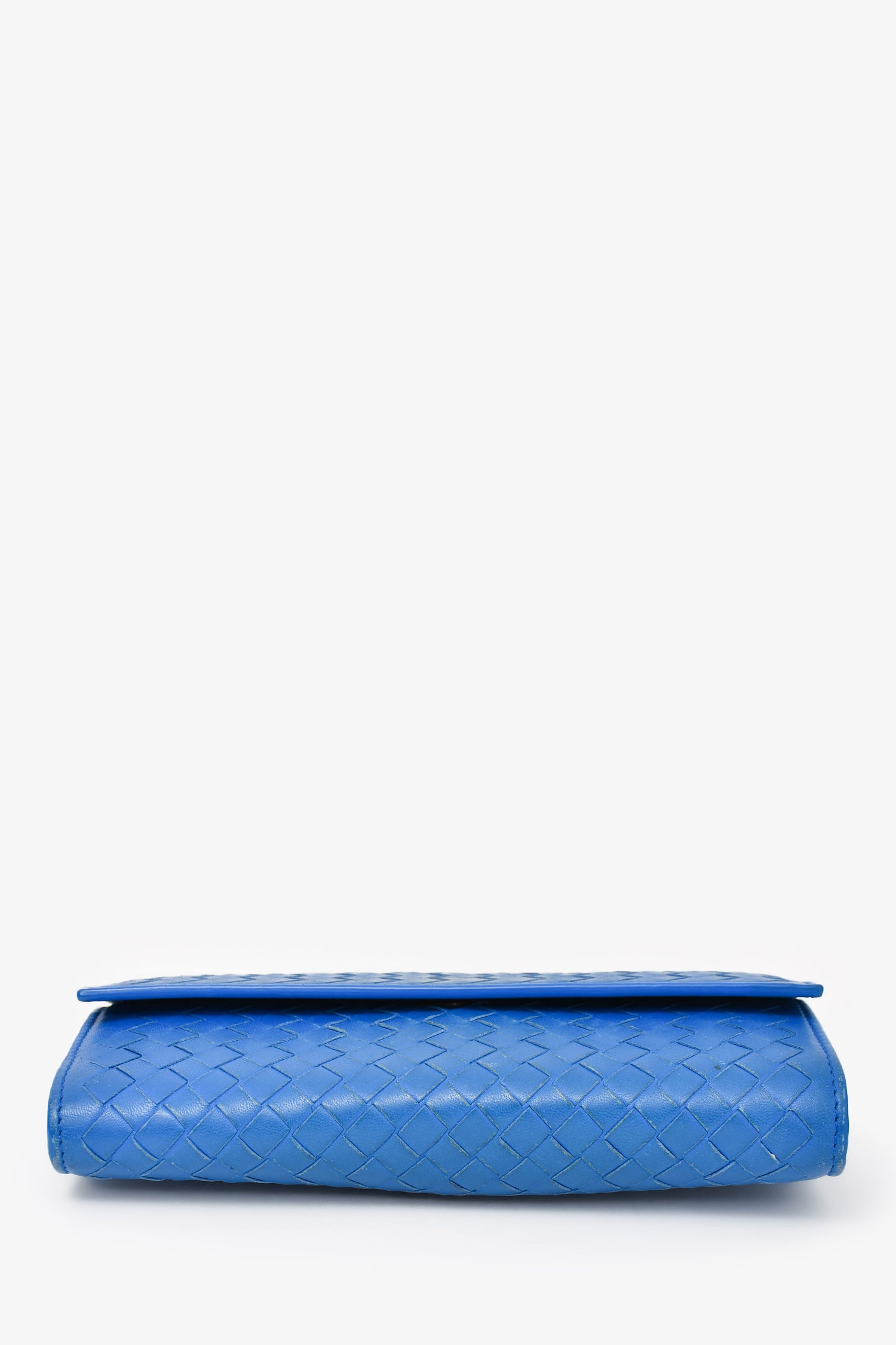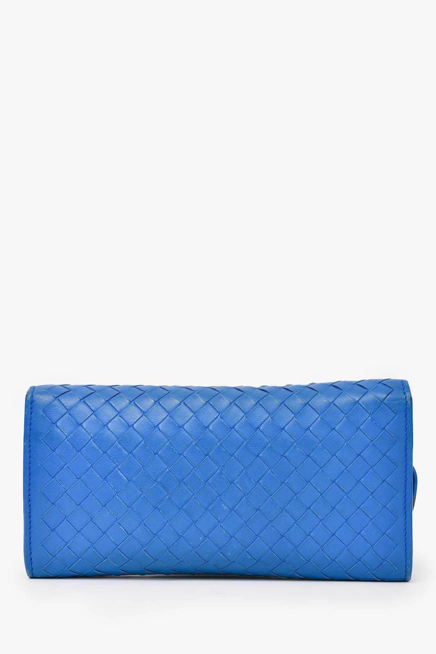Refresh availabilityBottega Veneta Blue Leather Intrecciato Long Wallet. Top snap-on button closure. Four interior compartments. Eight card slots. Interior zipper closure. Grey-tone hardware. Tonal stitching.