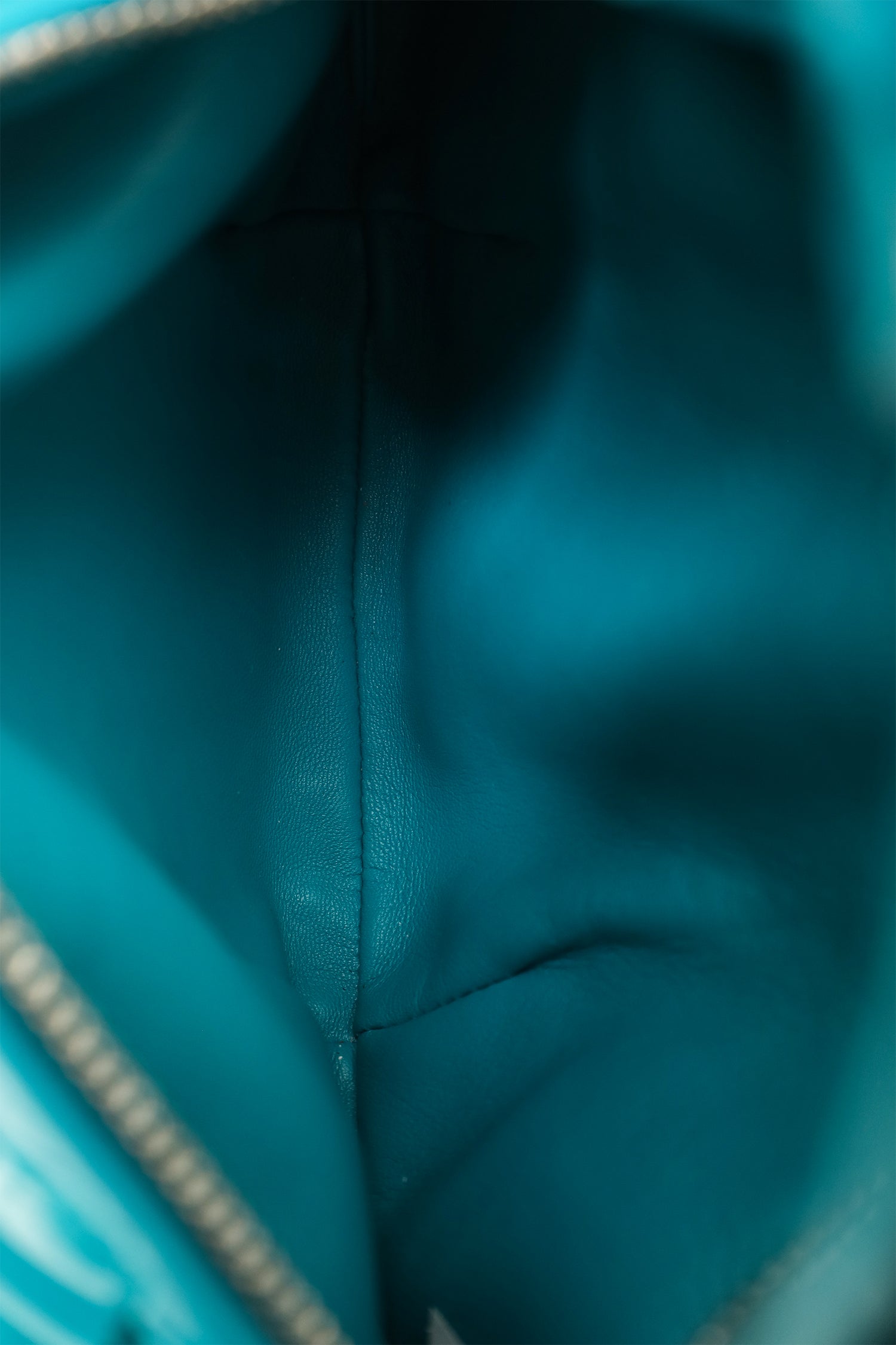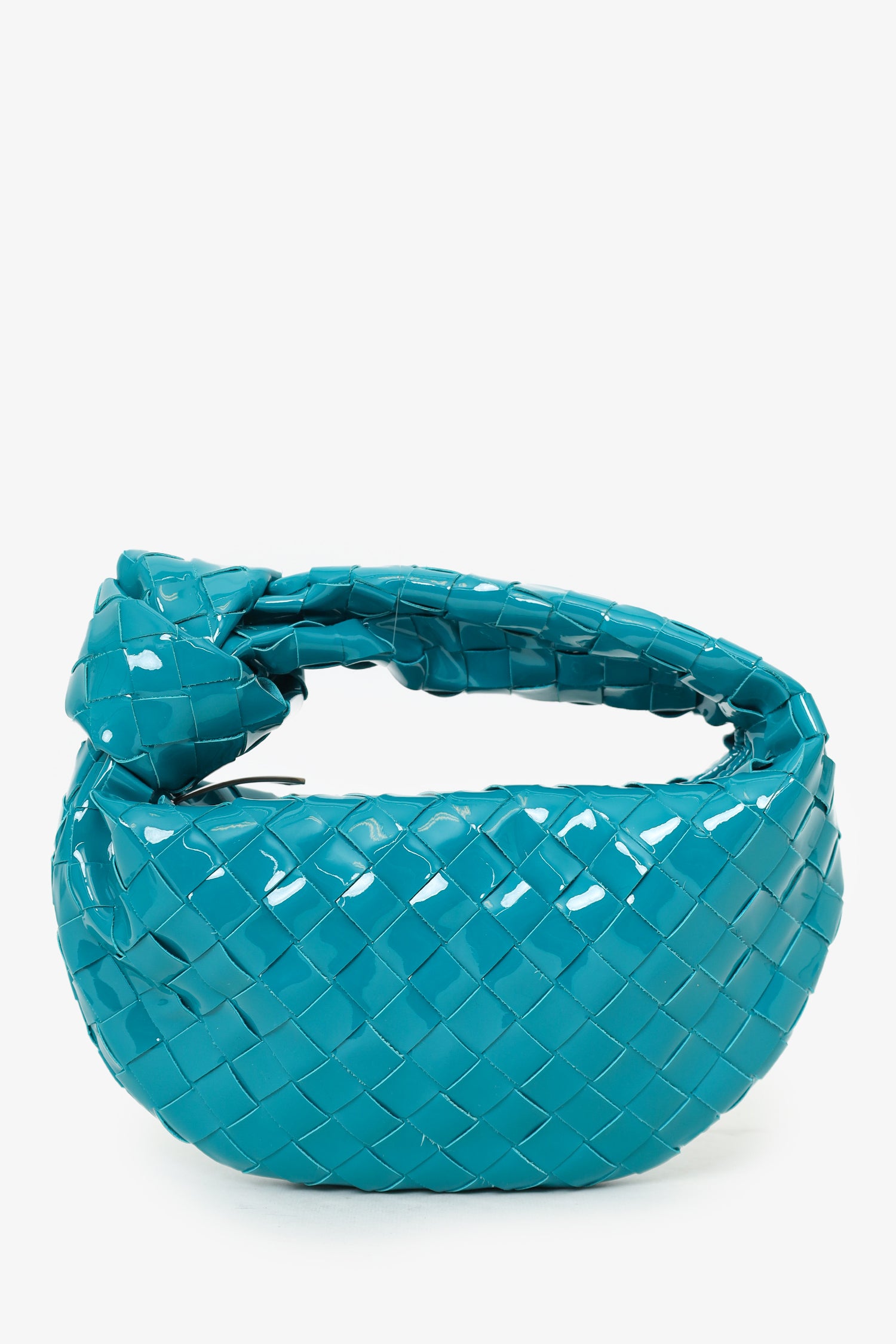 Refresh availabilityBottega Veneta Blue Patent Leather Intrecciato Mini Jodie. Top zip closure. Leather-lined open-interior. Silver-tone hardware. Tonal stitching.