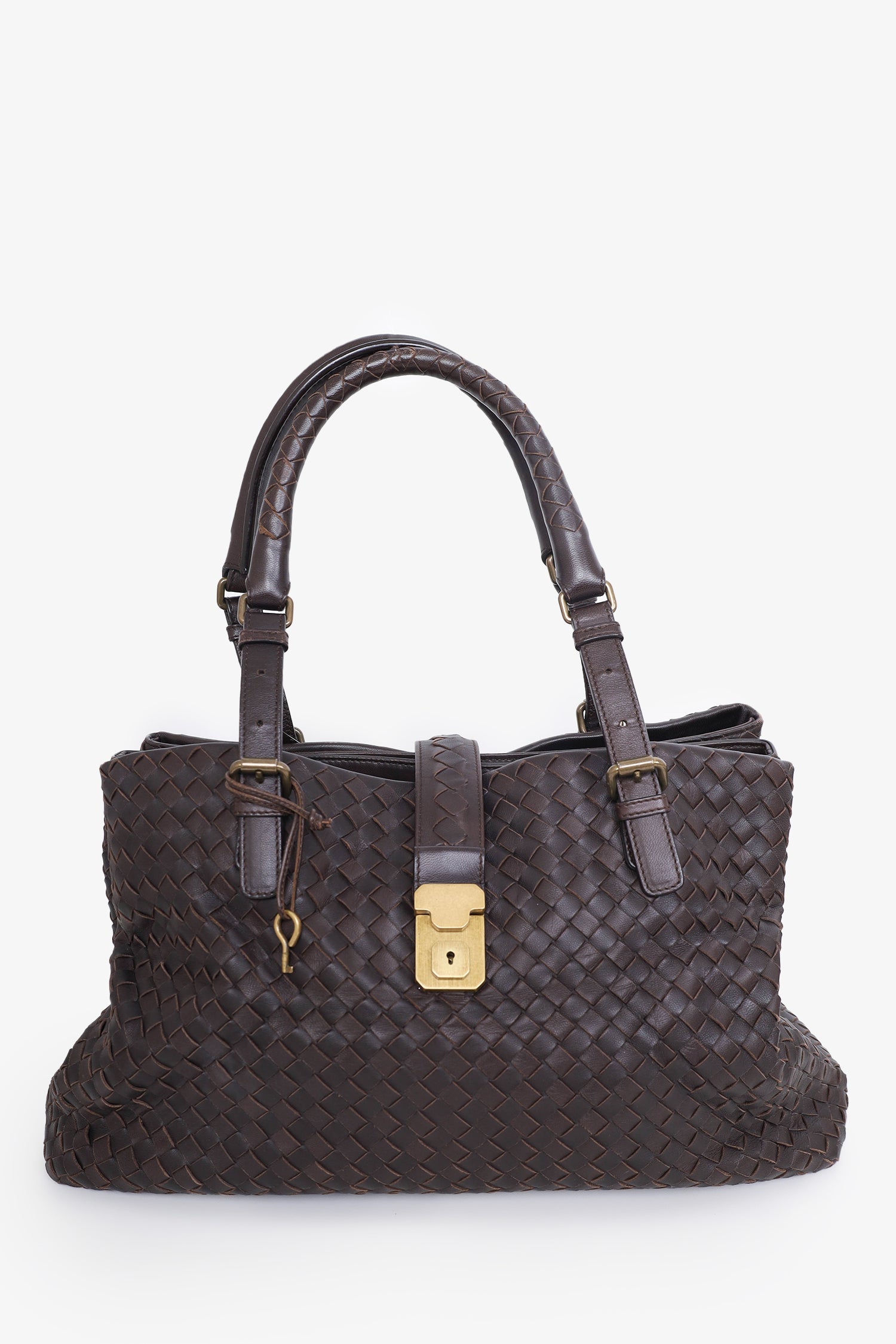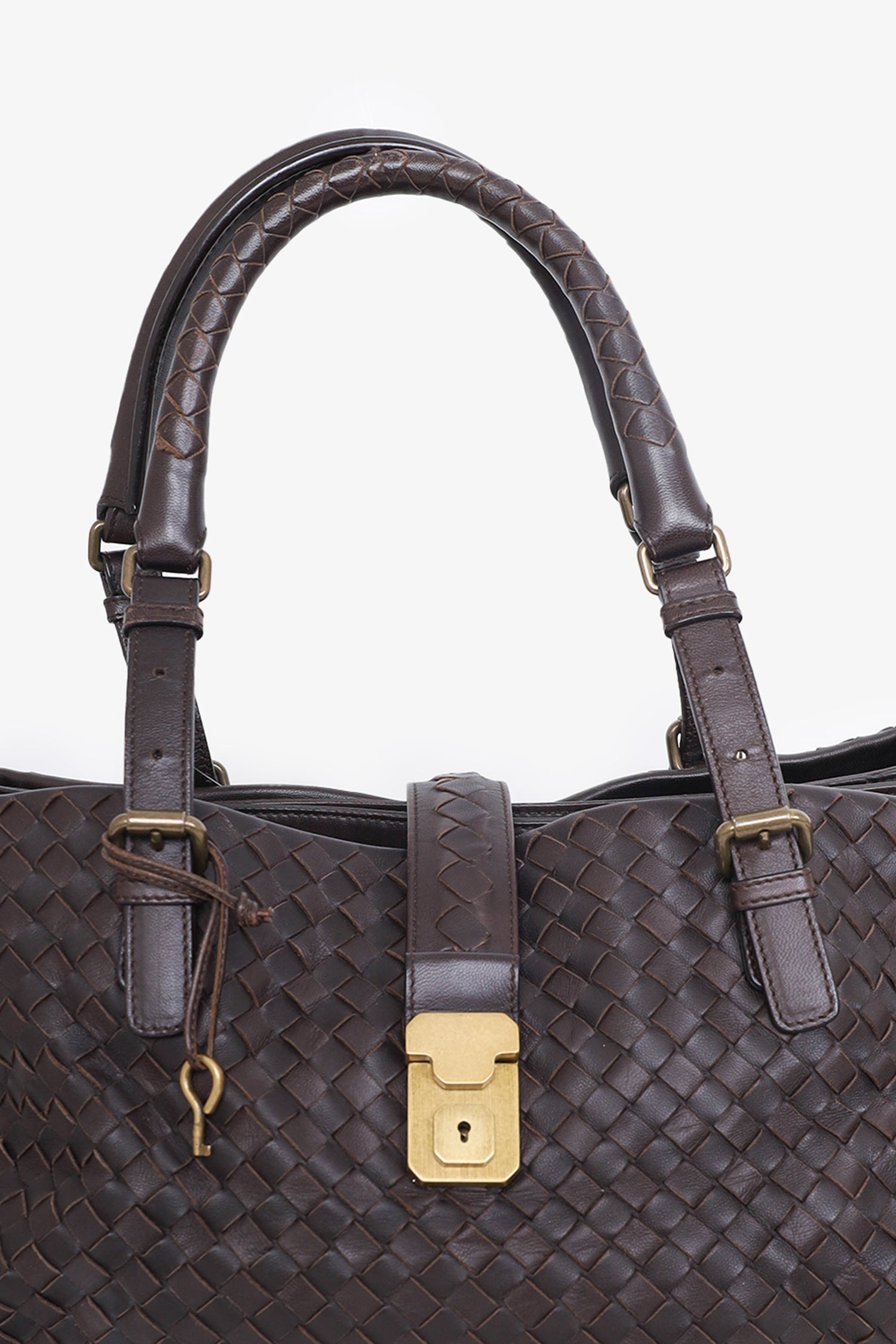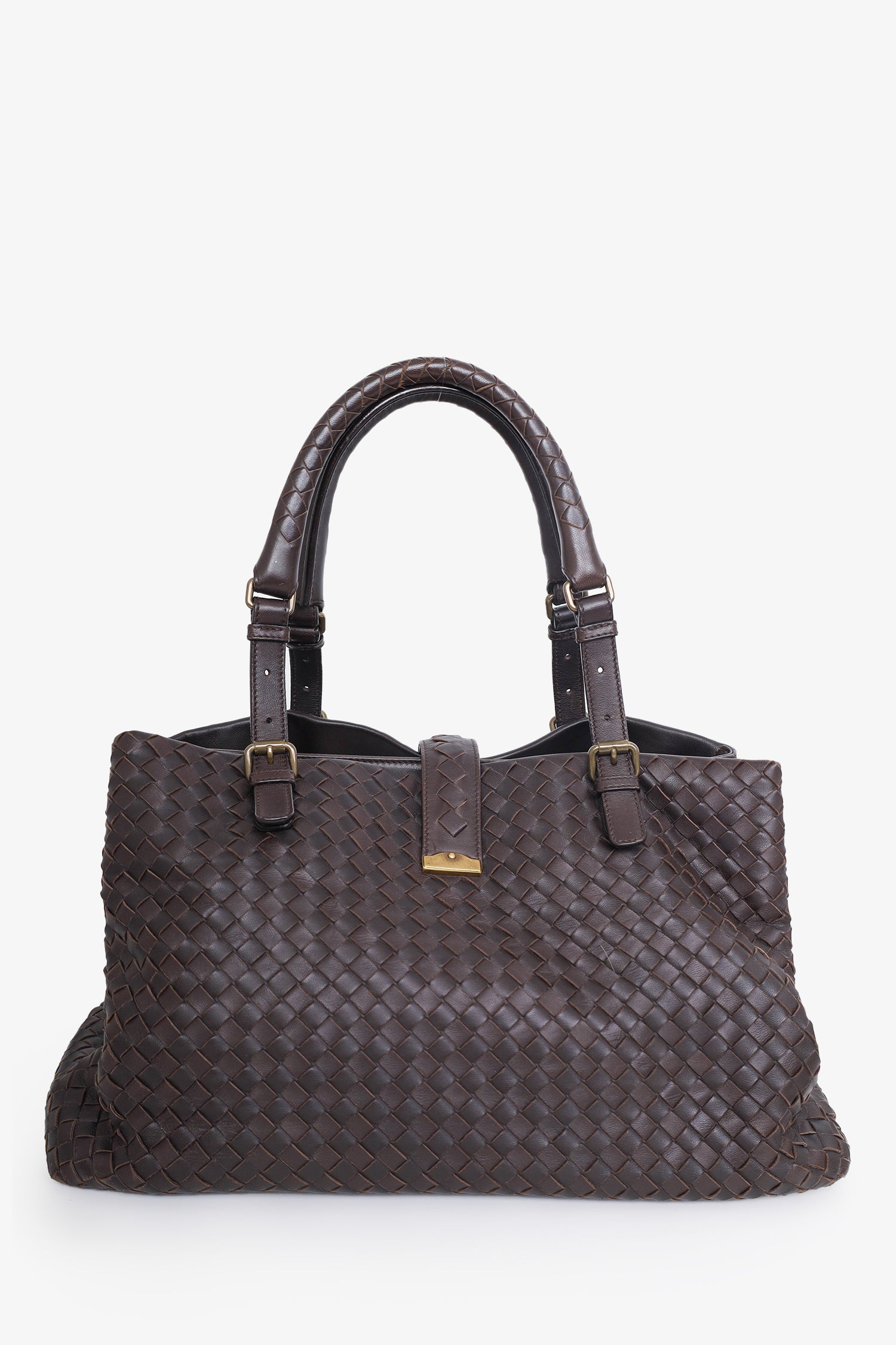 Refresh availabilityBottega Veneta Brown Intrecciato Leather Roma Tote. Top strap with push down closure. 3 interior compartments; 2 open and 1 with magnetic button closure. 1 interior wall pocket with zip closure. Adjustable shoulder straps with buckle closure. Gold tone hardware. Tonal stitching.