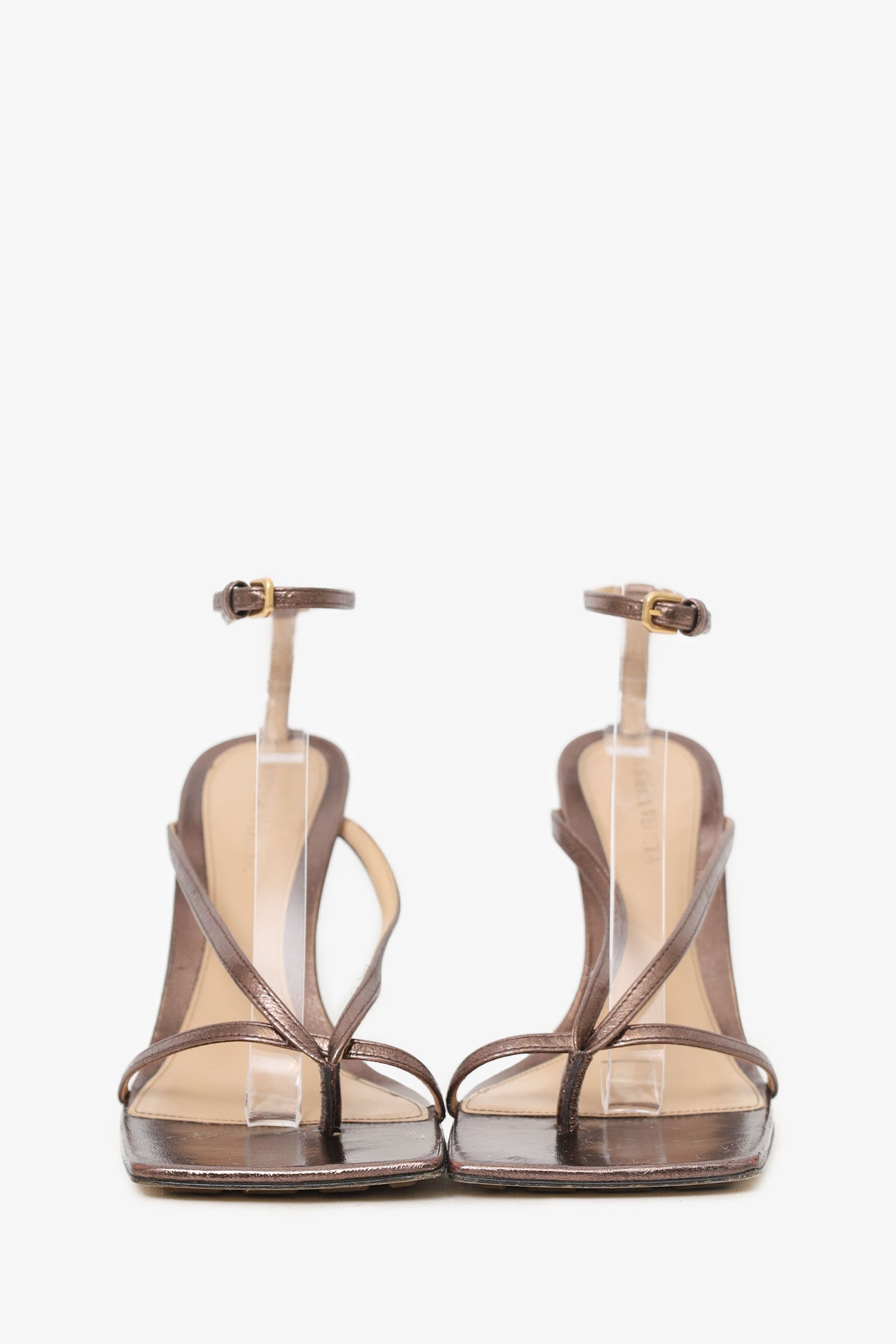 Refresh availabilityBottega Veneta Brown Metallic Leather Stretch Strap Sandals. Slip-on. Open-square-toe. Strappy vamp and thong toe. Adjustable ankle straps with buckle closure. Tonal stitching.