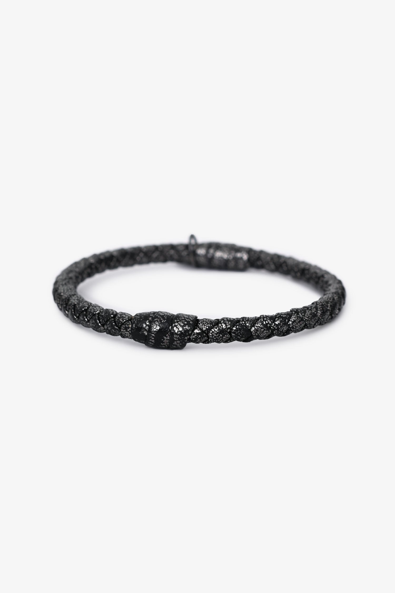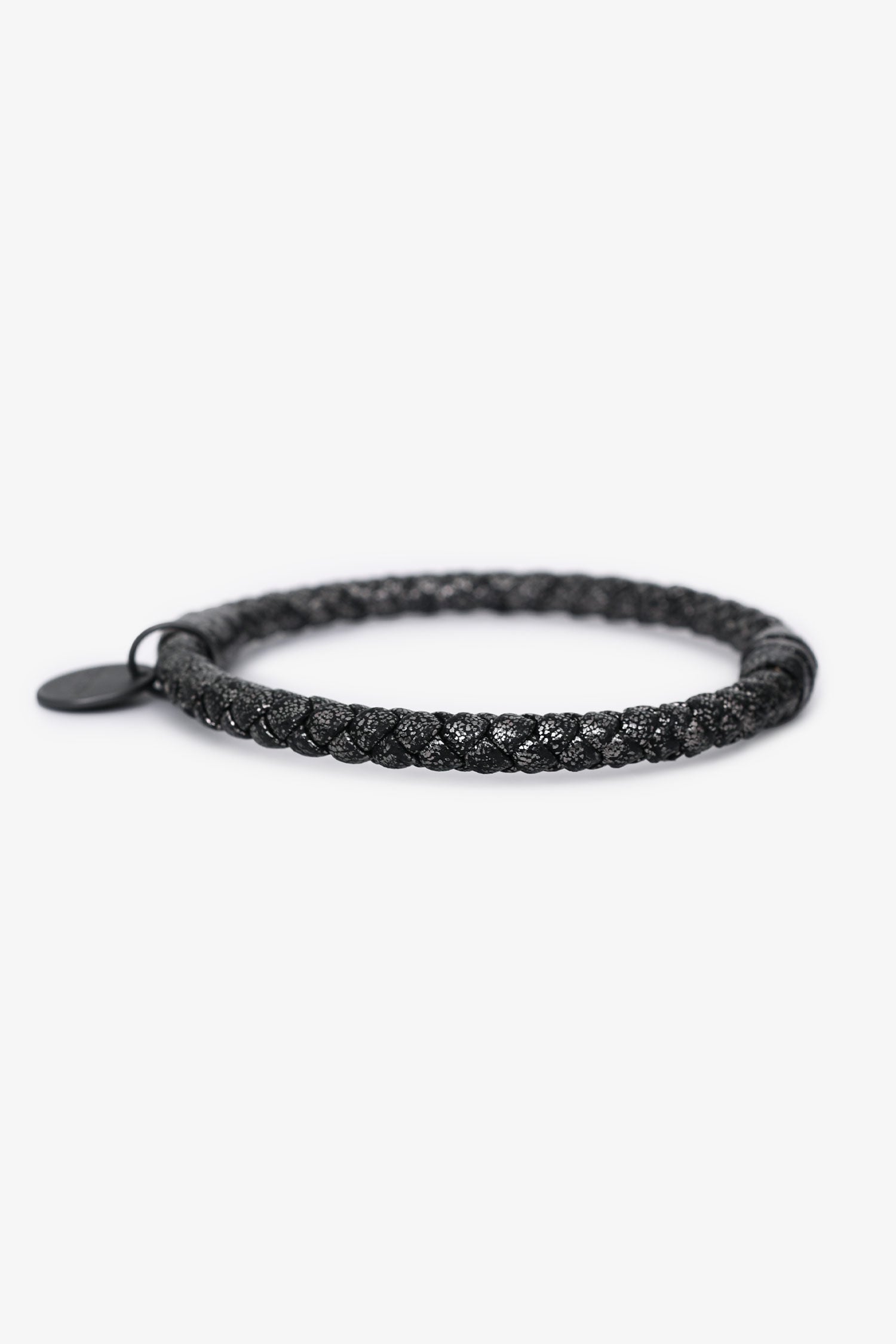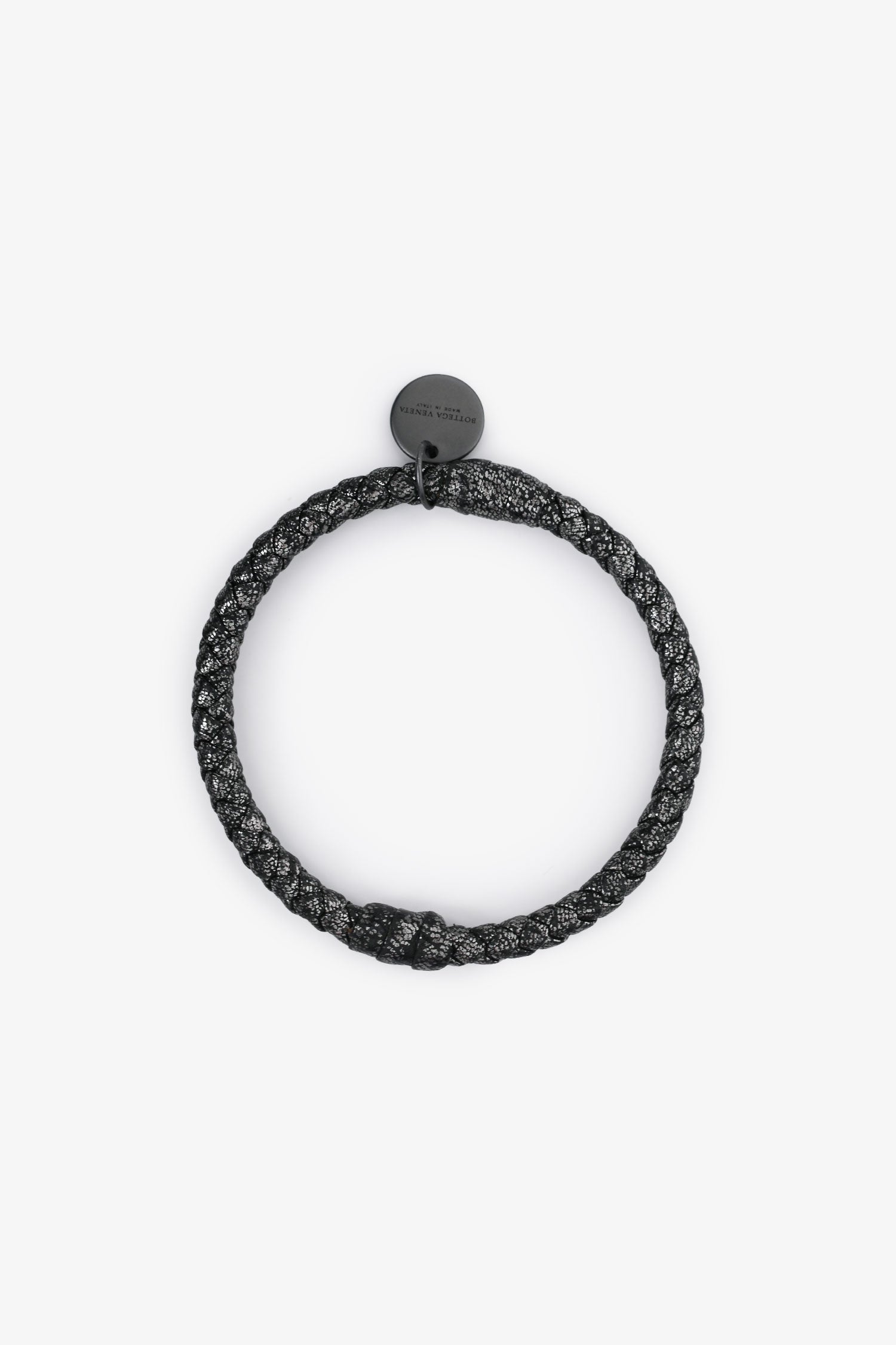 Refresh availabilityBottega Veneta Dark Grey Metallic Leather Intrecciato Bracelet. Pull-on. Tonal hardware. Tonal stitching.