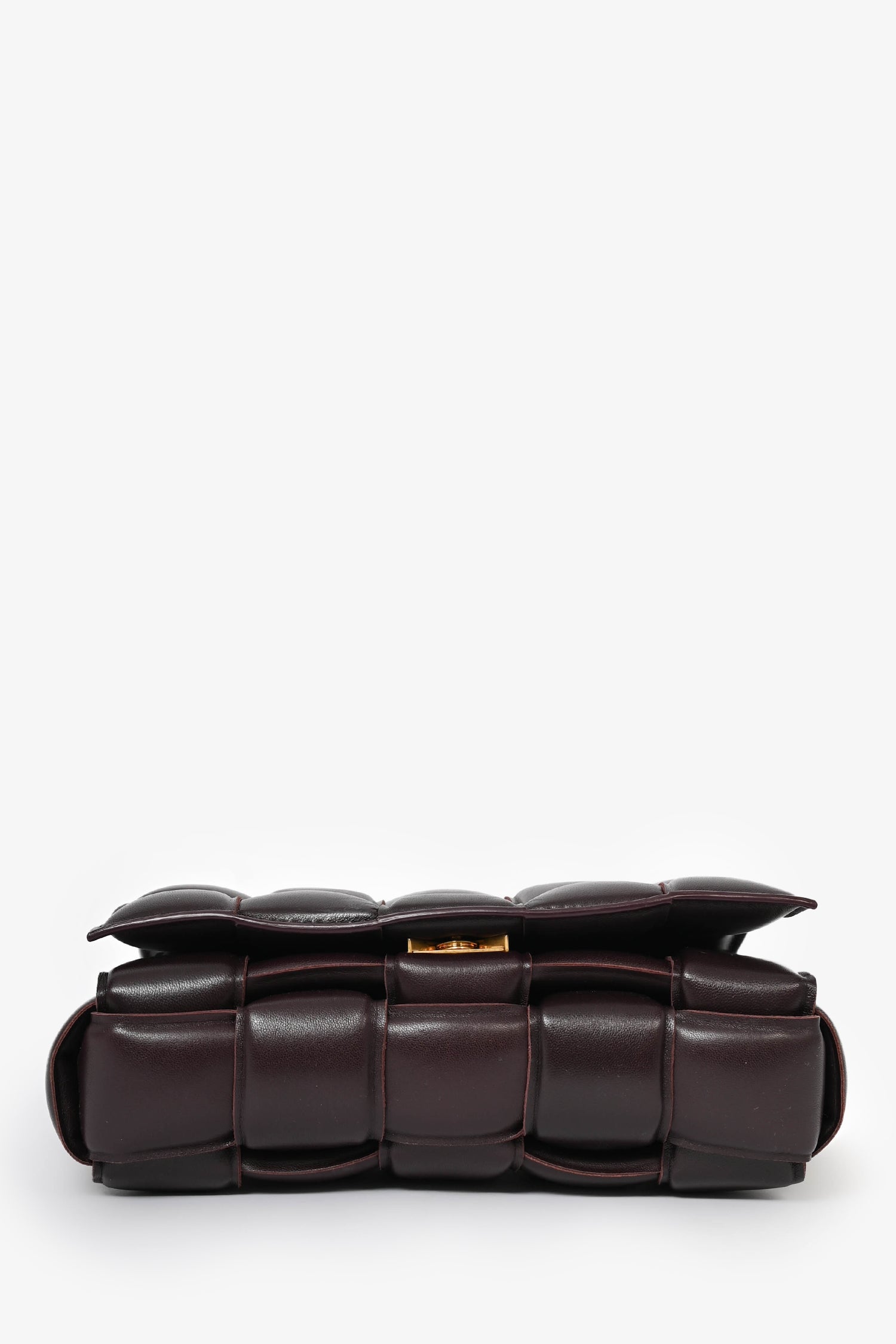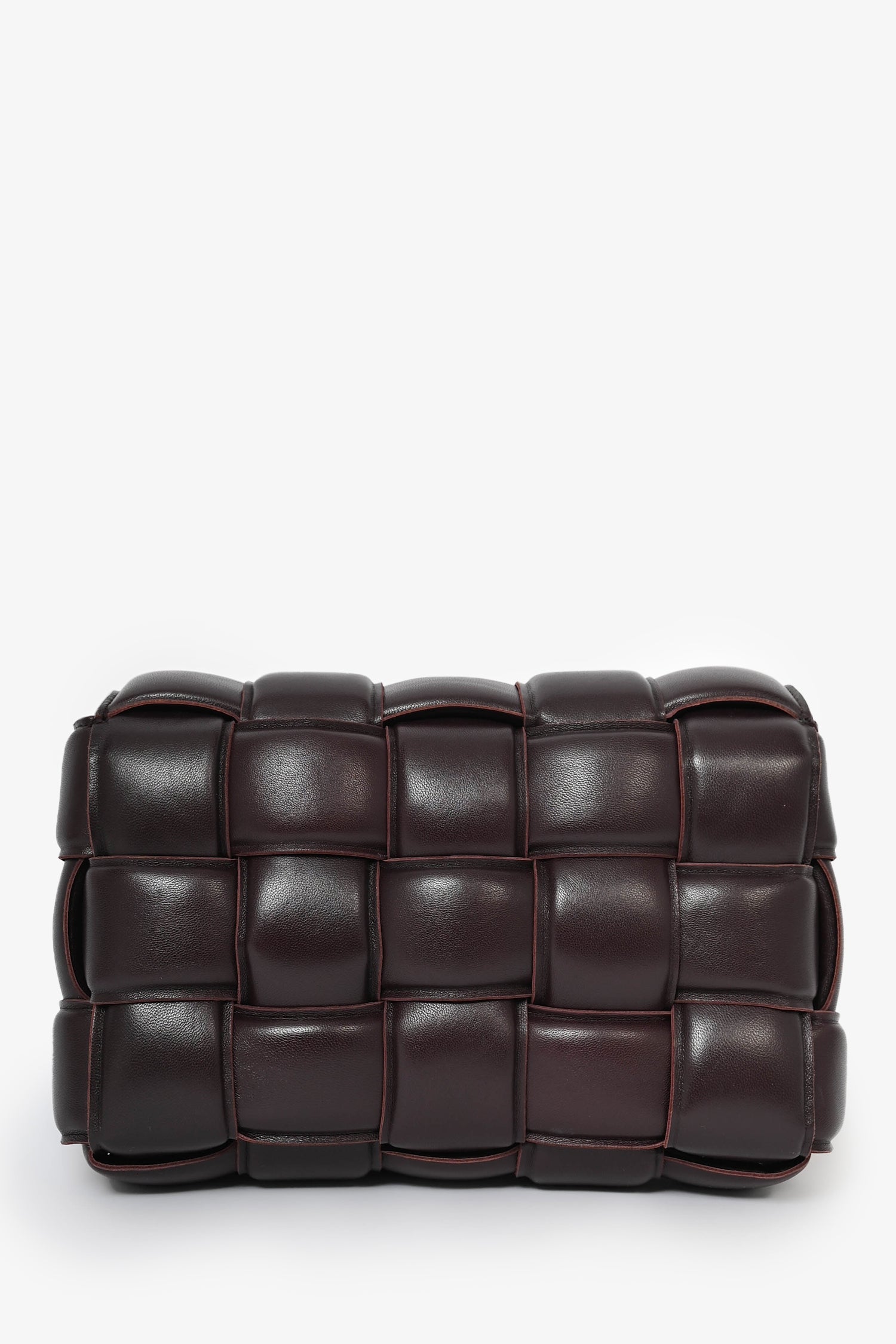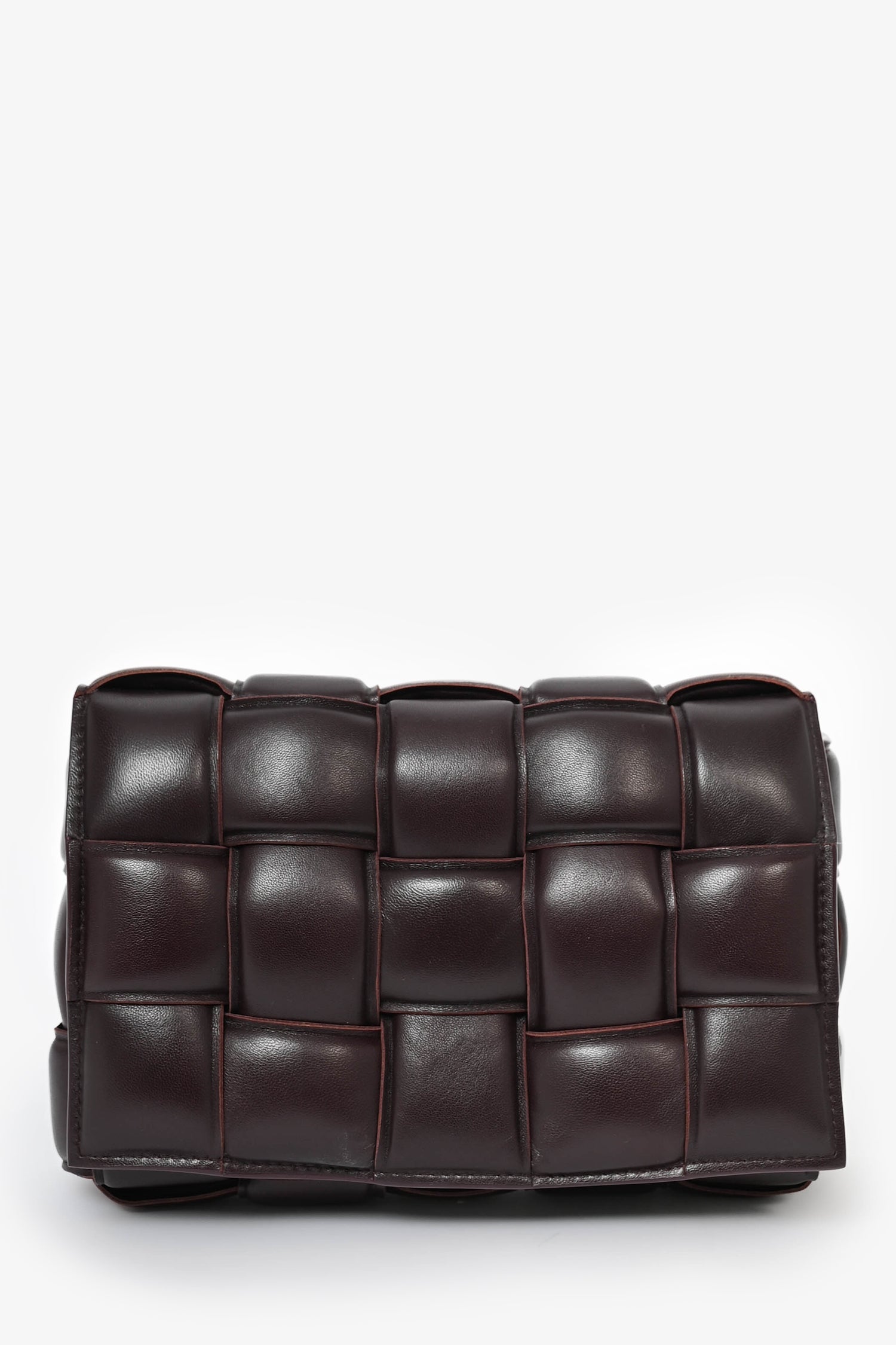 Bottega Veneta Dark Purple Padded Leather Cassette Crossbody Bag. Top flap button closure. Interior pocket with zipper closure. Gold-tone hardware. Tonal stitching.